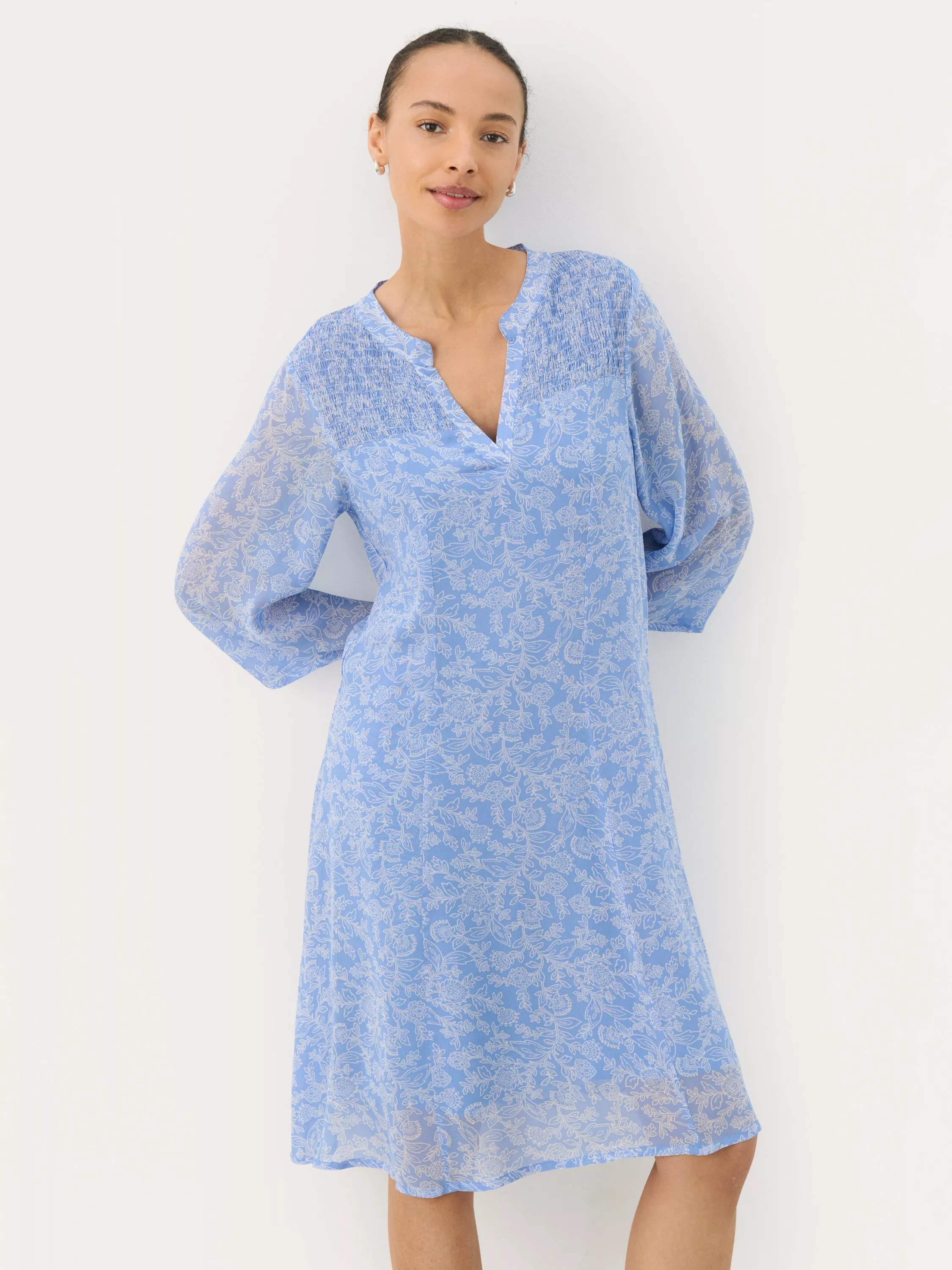 The Elka Dress by Part Two combines elegance with comfort. Featuring a V-neck and long sleeves, its blue wallpaper flower design brings a touch of charm to your casual wardrobe.