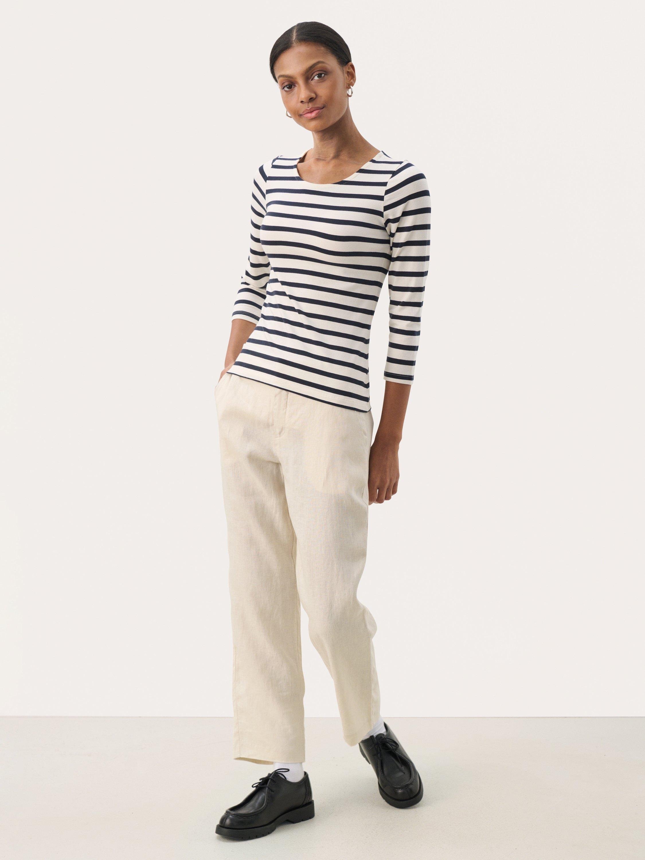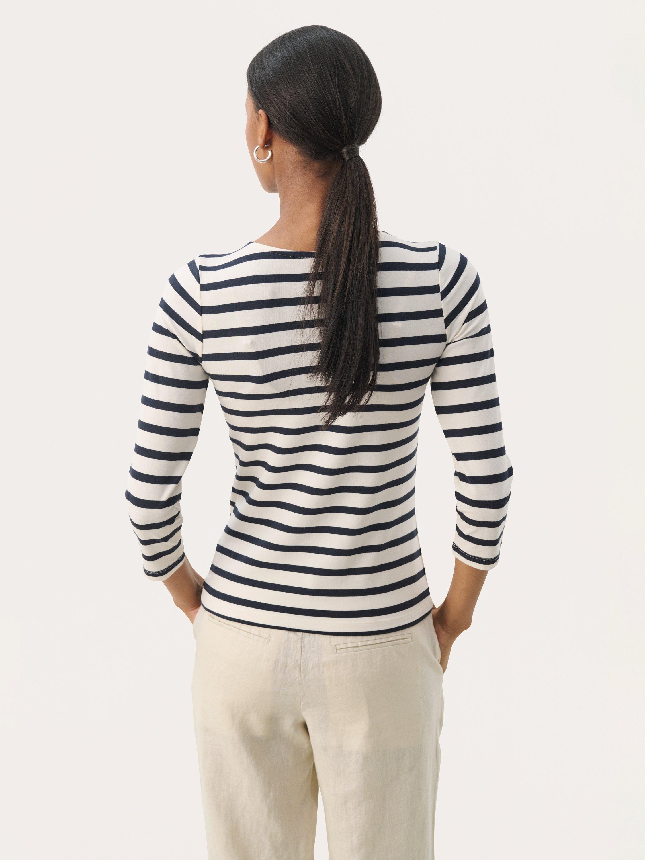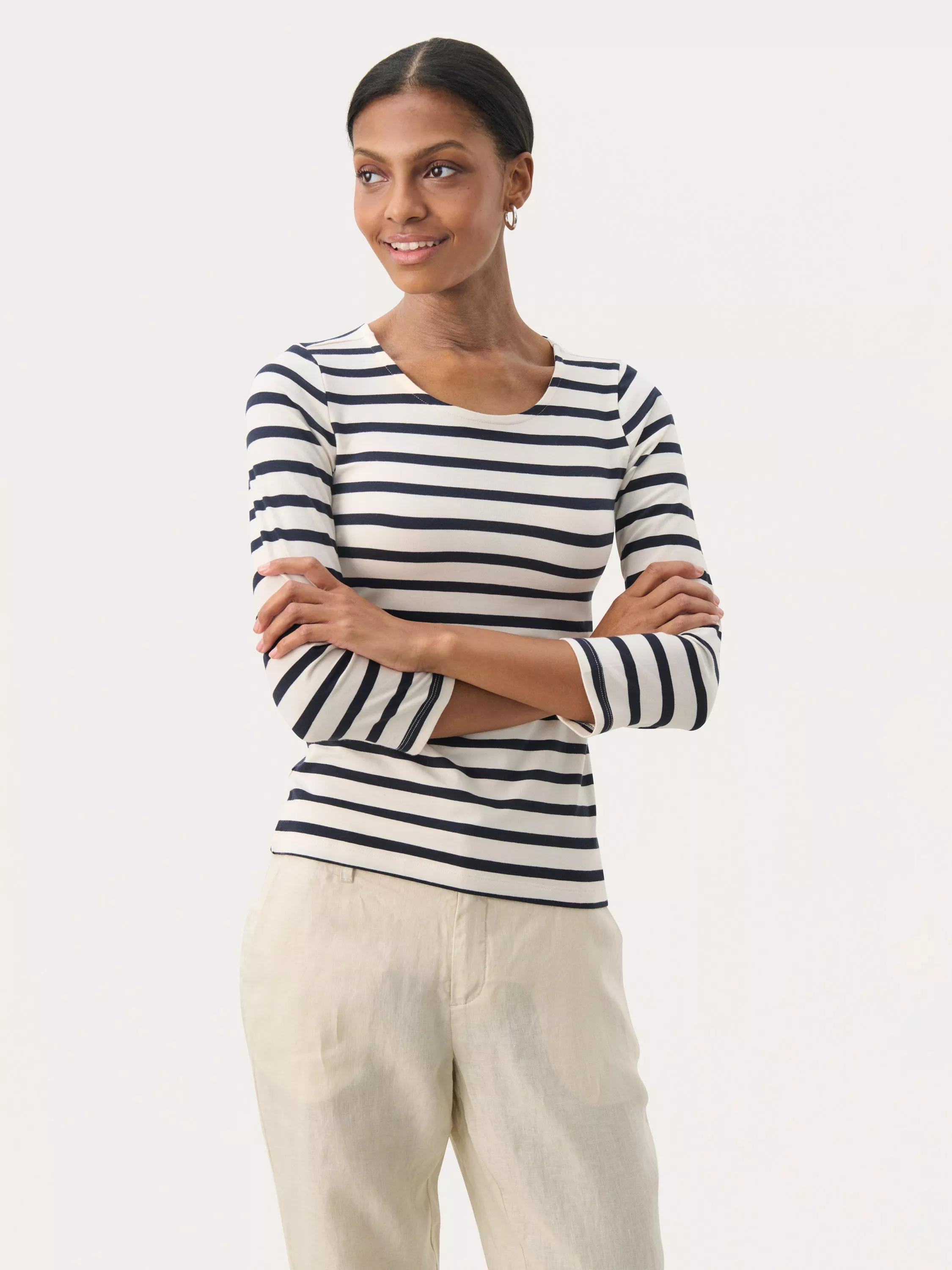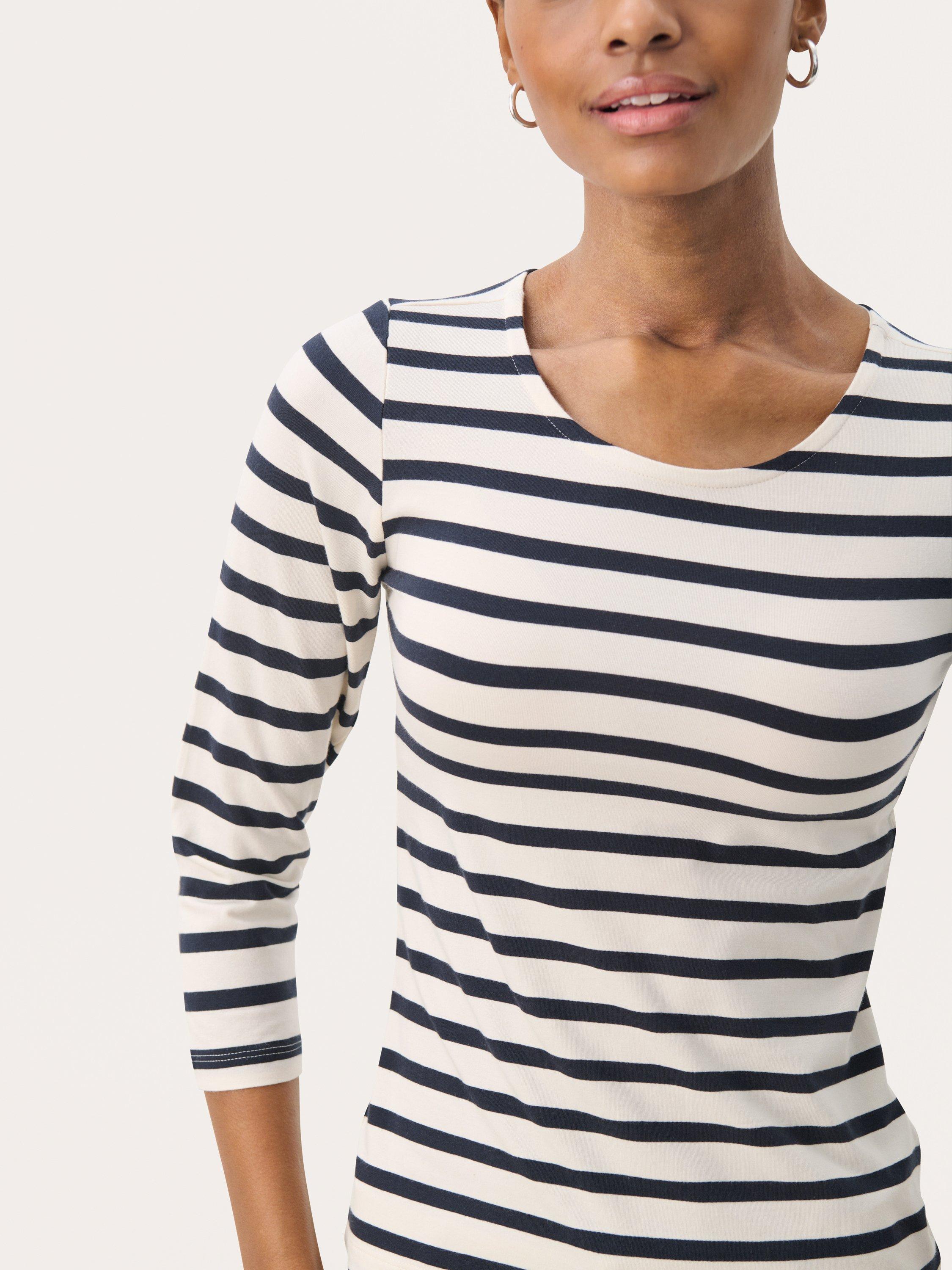 This Emel top with 3/4 sleeves and a round neckline is a timeless basic for any wardrobe. Made from a soft, stretchy fabric that ensures comfort and an elegant fit. Perfect for layering or wearing on its own for a simple, classic look.