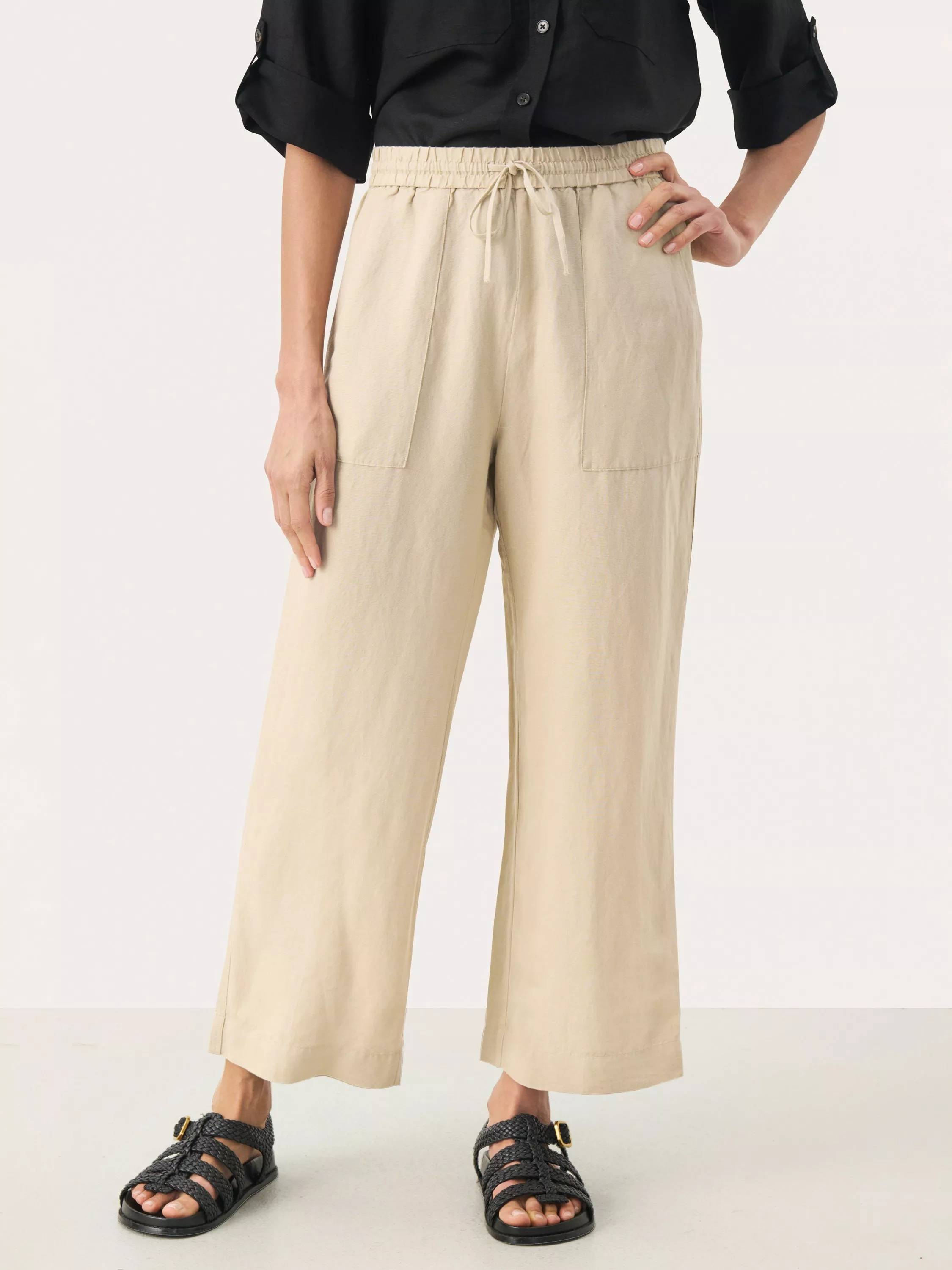 Featuring an elasticated waistband and drawstring for added comfort, this pair of trousers by Part Two are cut with an ample wide leg. Whipped together with a lightweight linen blend, they are cropped at the hem.