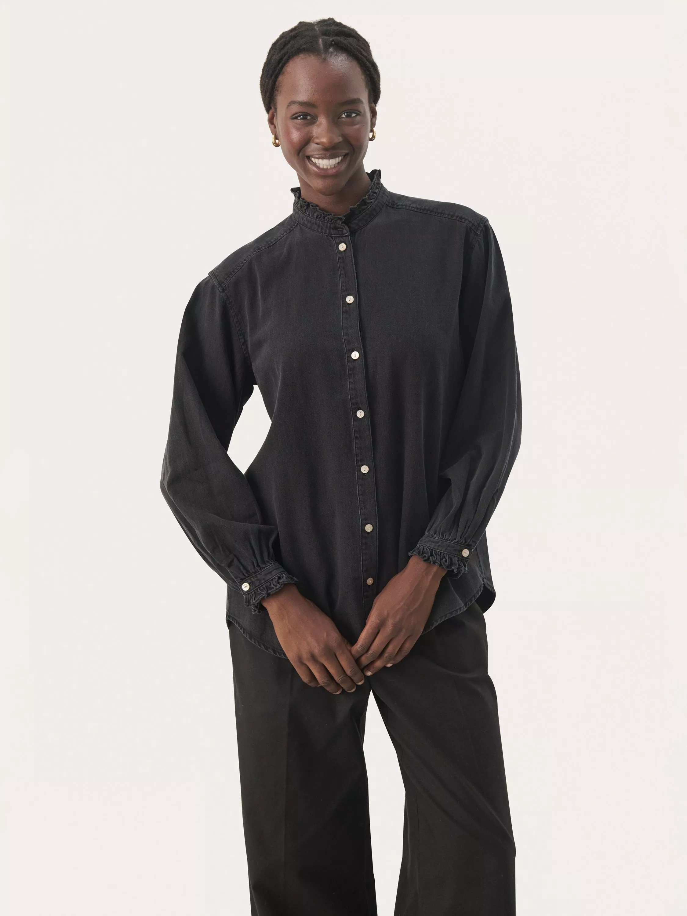 The Ferah denim shirt is a casual and feminine everyday style. It has a frilled mandarin collar and button fastening, and it has an oversized fit. The sleeves are long and loose-fitting with an elastic, frilled edge, and the shirt is cut below the hips and has a rounded hem.