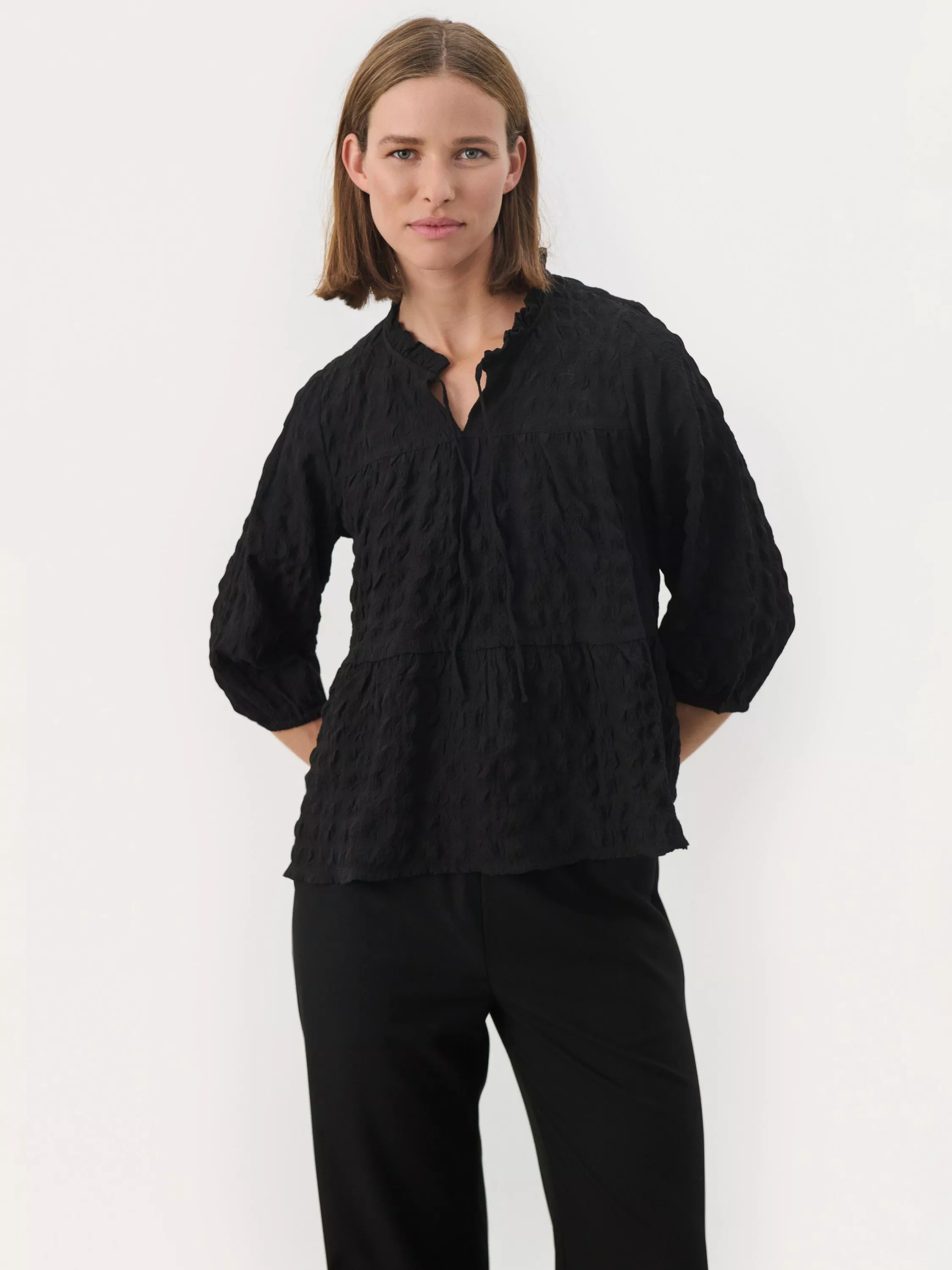 The Gimalie blouse is a feminine and casual top, that will add a soft touch to any outfit. It has a frilled neckline with a tying string, and it has an A-line fit with flared tiers. The sleeves are 3/4 length balloon sleeves, and they are gathered in an elastic edge.