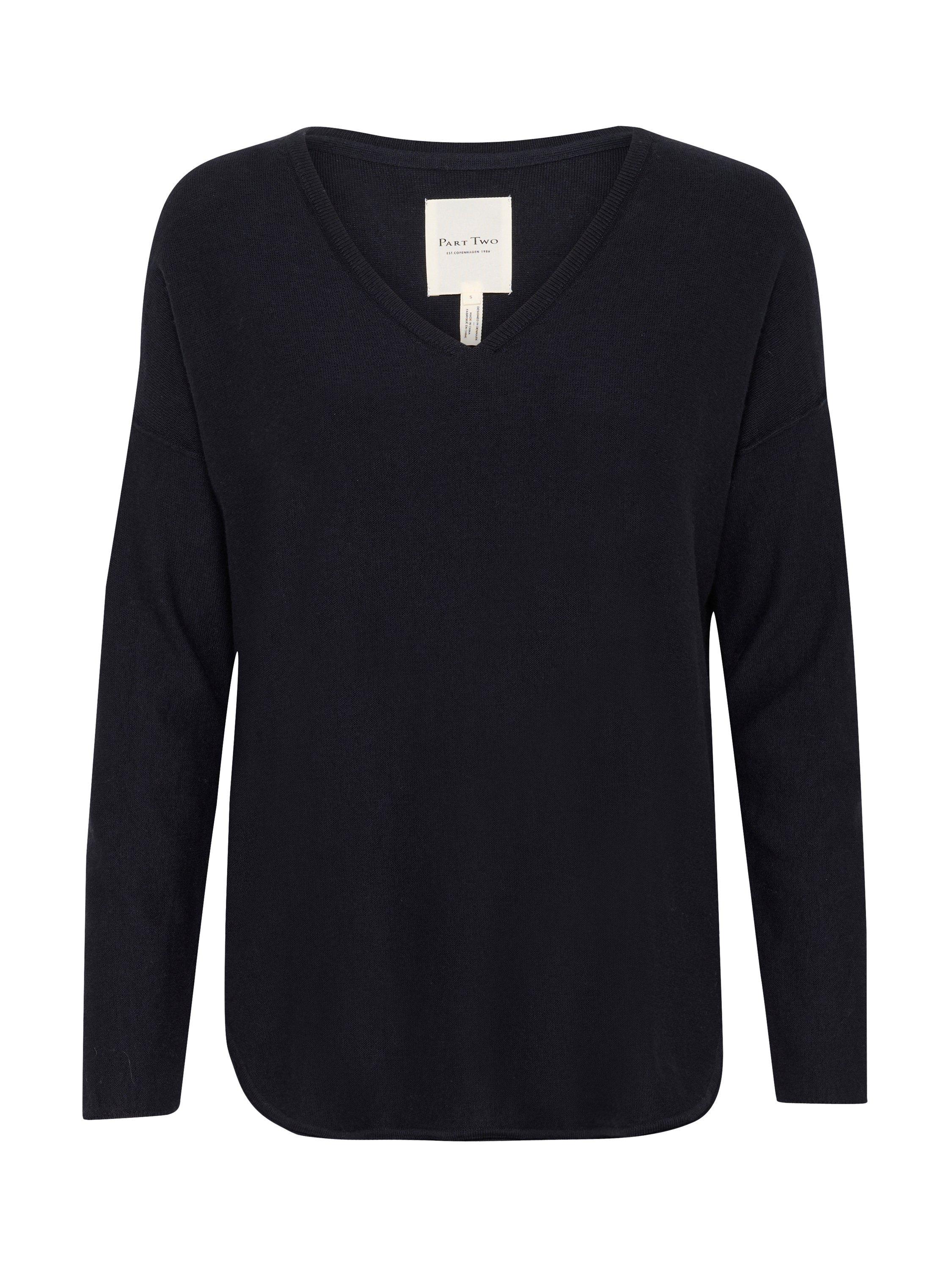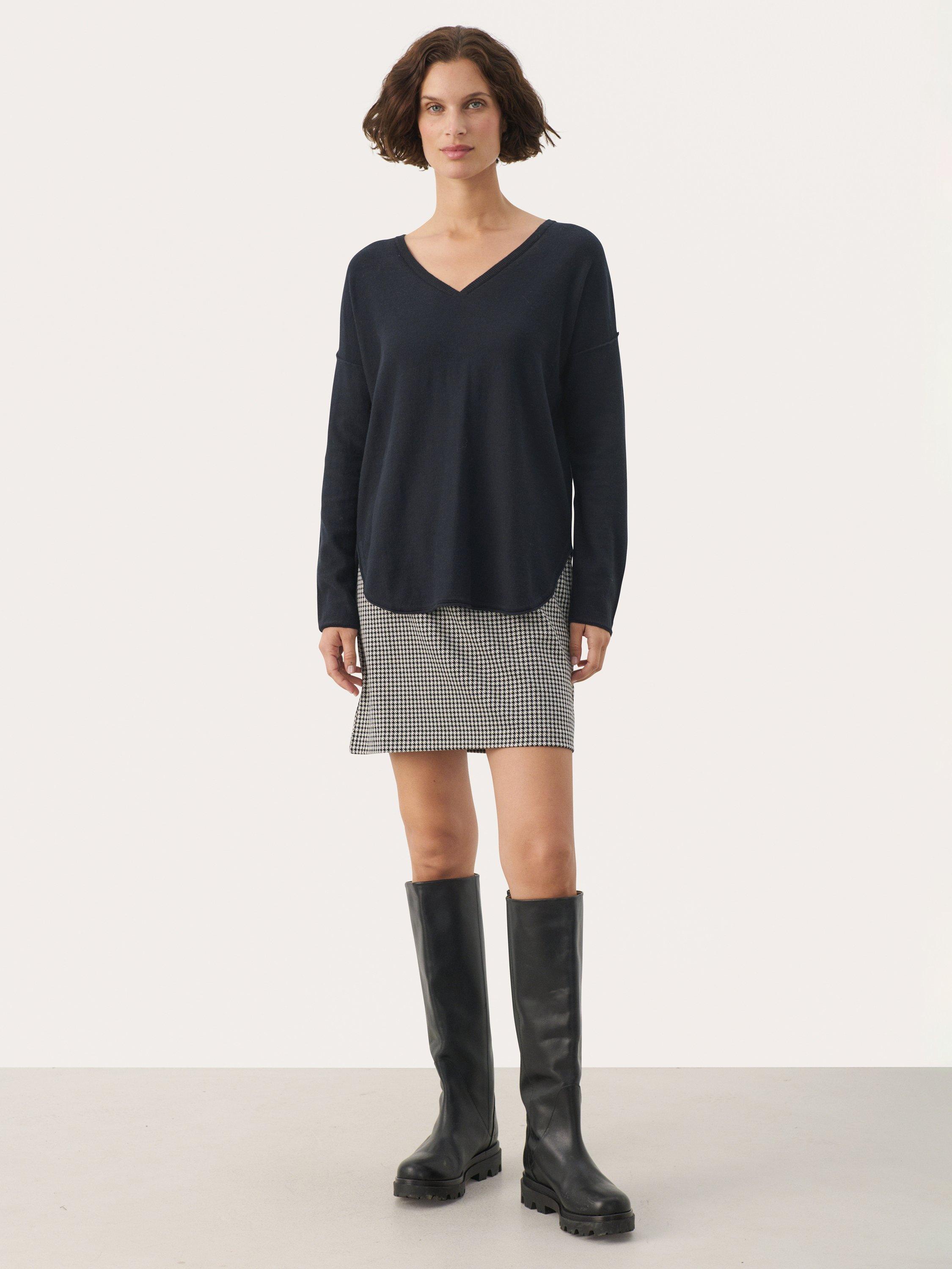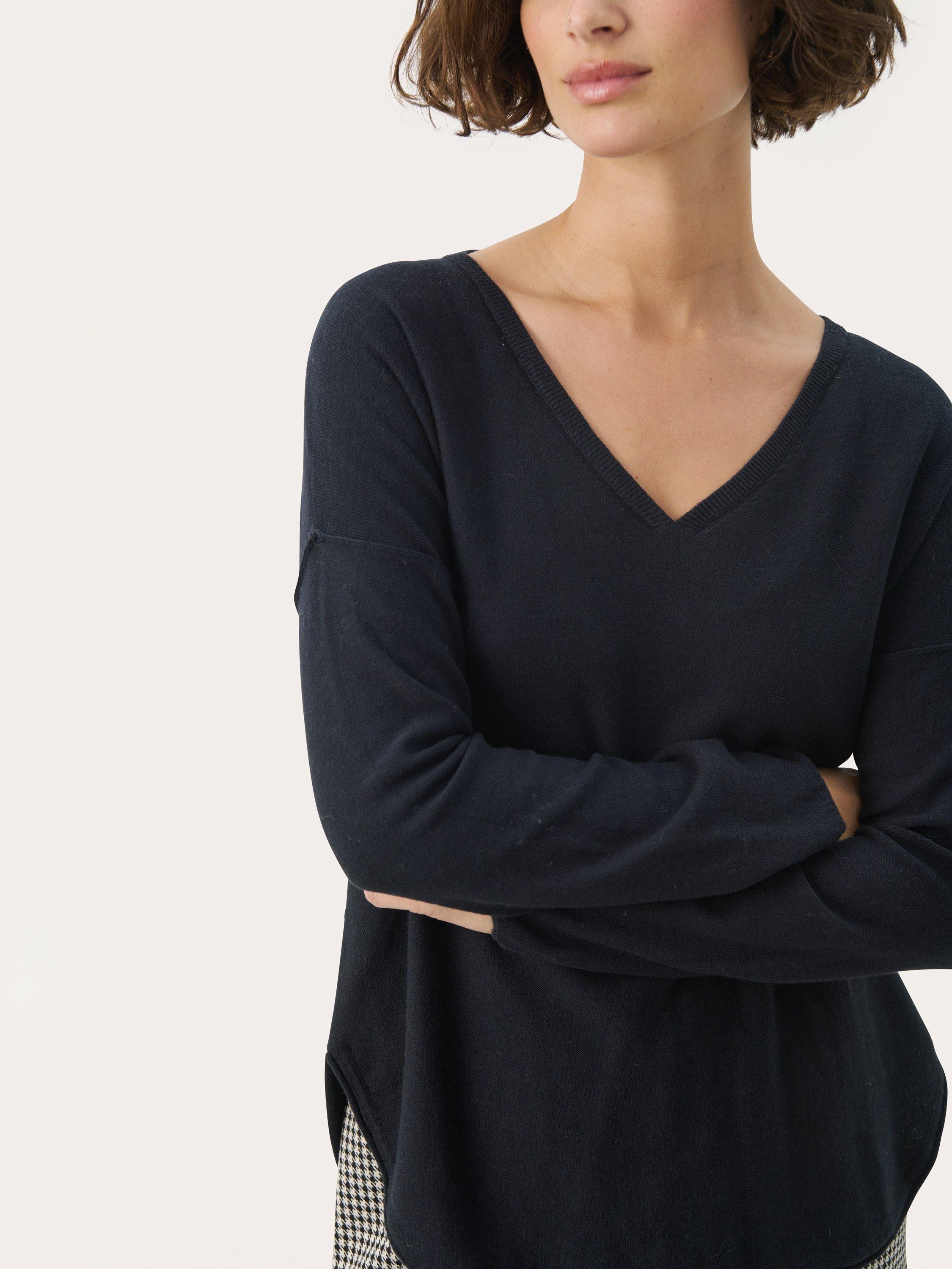 The Iliviasa pullover is a soft and simple style with lots of styling options. It has a wide V-neck and a casual fit with drop shoulders, and it is made in a light and tight knit. The sleeves are long, and the pullover is cut at the hips and has a rounded split hem.