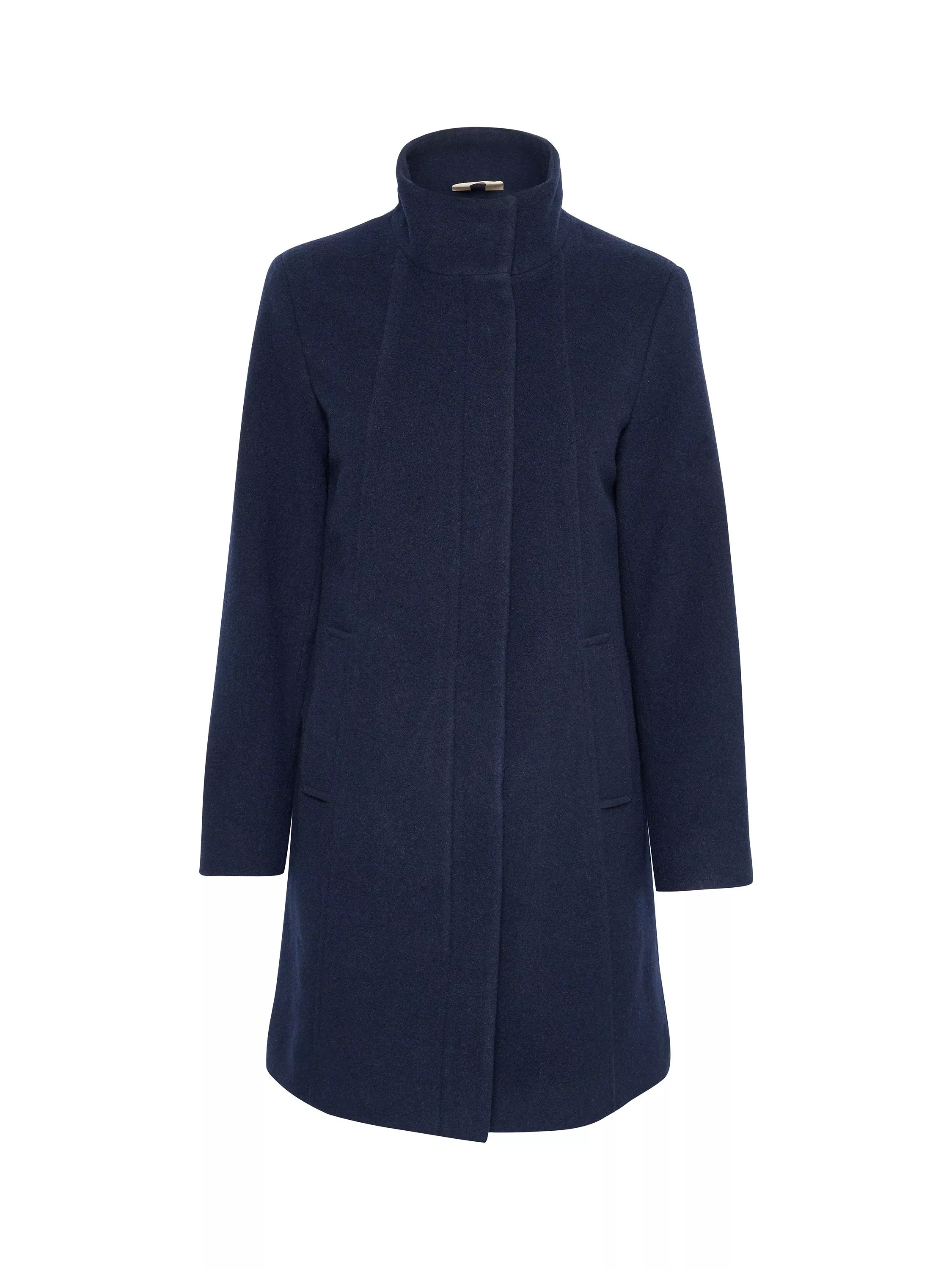 The Isabellis coat is a simple and stylish piece of outerwear. It has a funnel neck and a regular fit with an A-line silhouette. The jacket has long sleeves and comes down to the mid-thigh, and it has slanted front pockets.