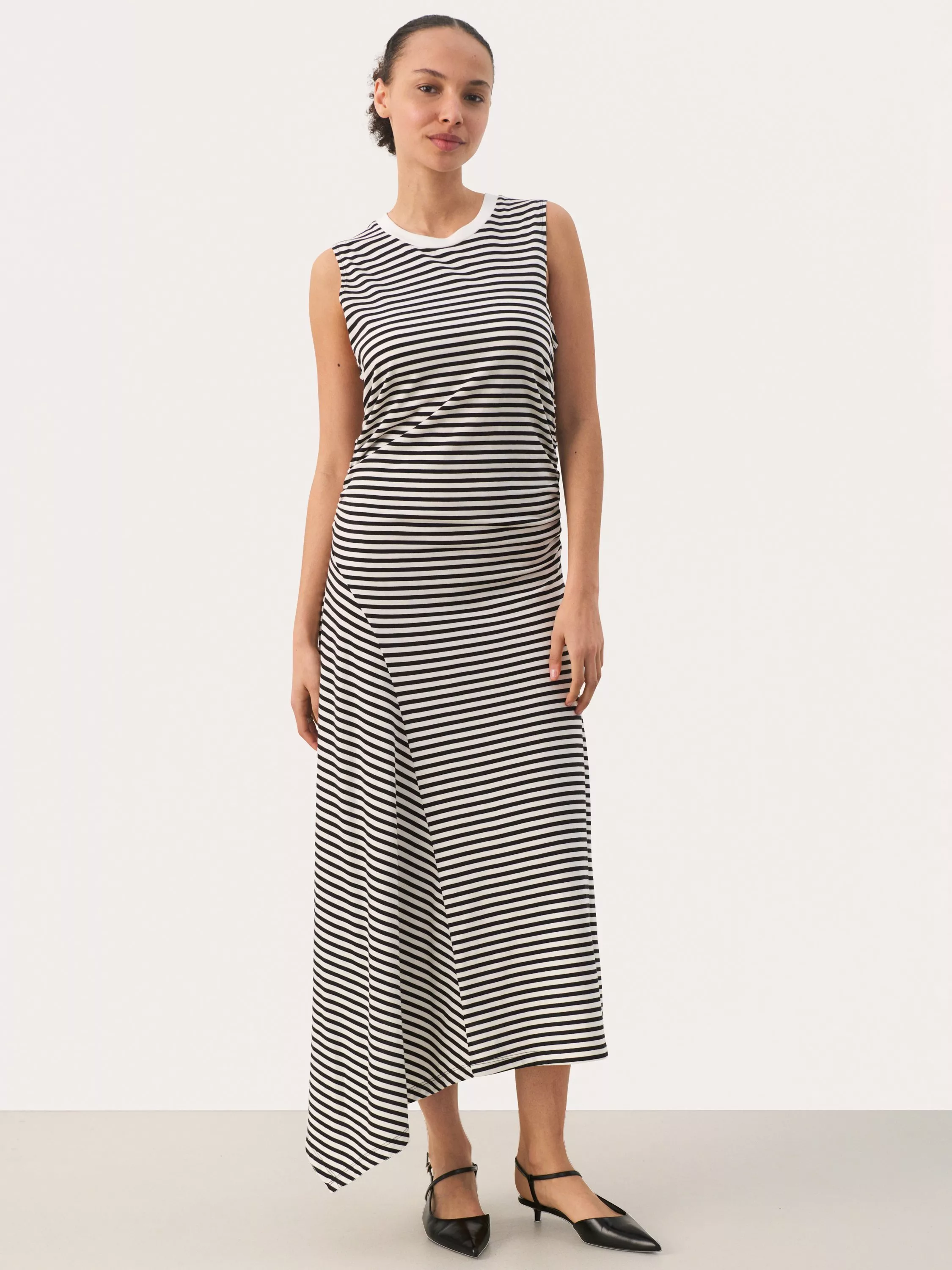 Carved to an A-line silhouette with an asymmetric hem, this mid-length dress from Part Two is blended with cotton. Defined with a conventional round neckline, this sleeveless style features simple striping across its canvas (because let's be honest, they're too hard to say no to).