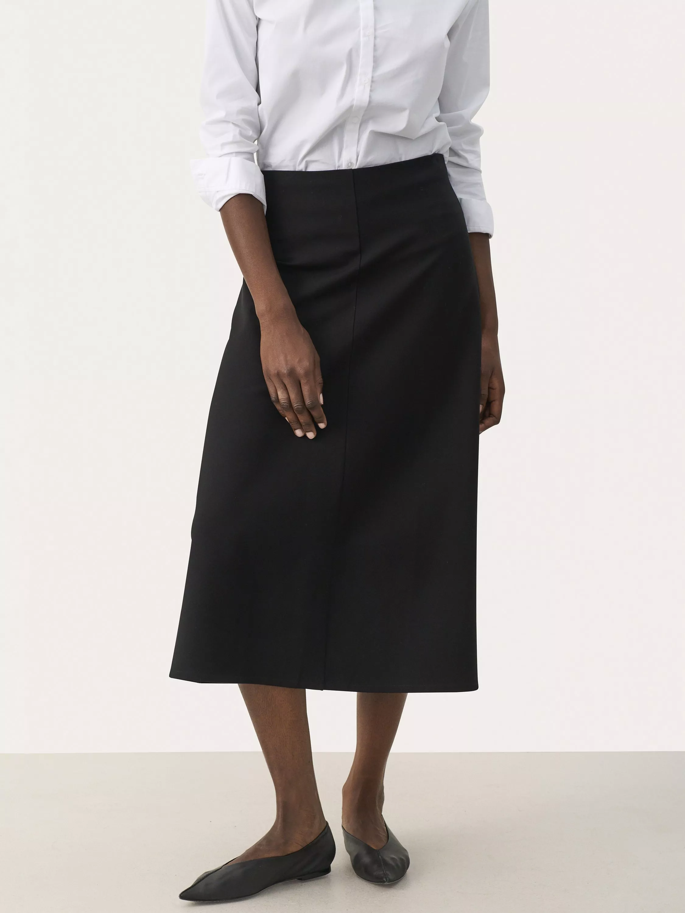 The Jermalene skirt is a minimalistic and versatile skirt with endless styling options. It is high-waisted with a hidden waistband and an invisible zipper at the back, that adds to the sleek look of the skirt. It has a structured A-line fit, and it comes down to the mid-calves.