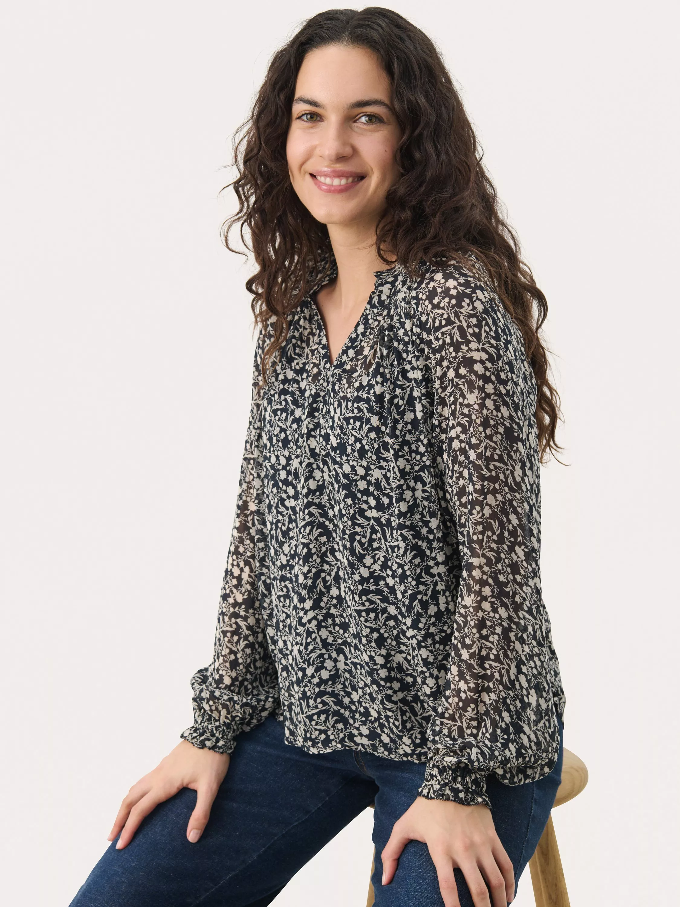 This KelsiaPW lightweight blouse features a delicate floral print that adds a touch of femininity to any outfit. With its relaxed fit, V-neckline, and subtly gathered sleeves, it offers both comfort and style.