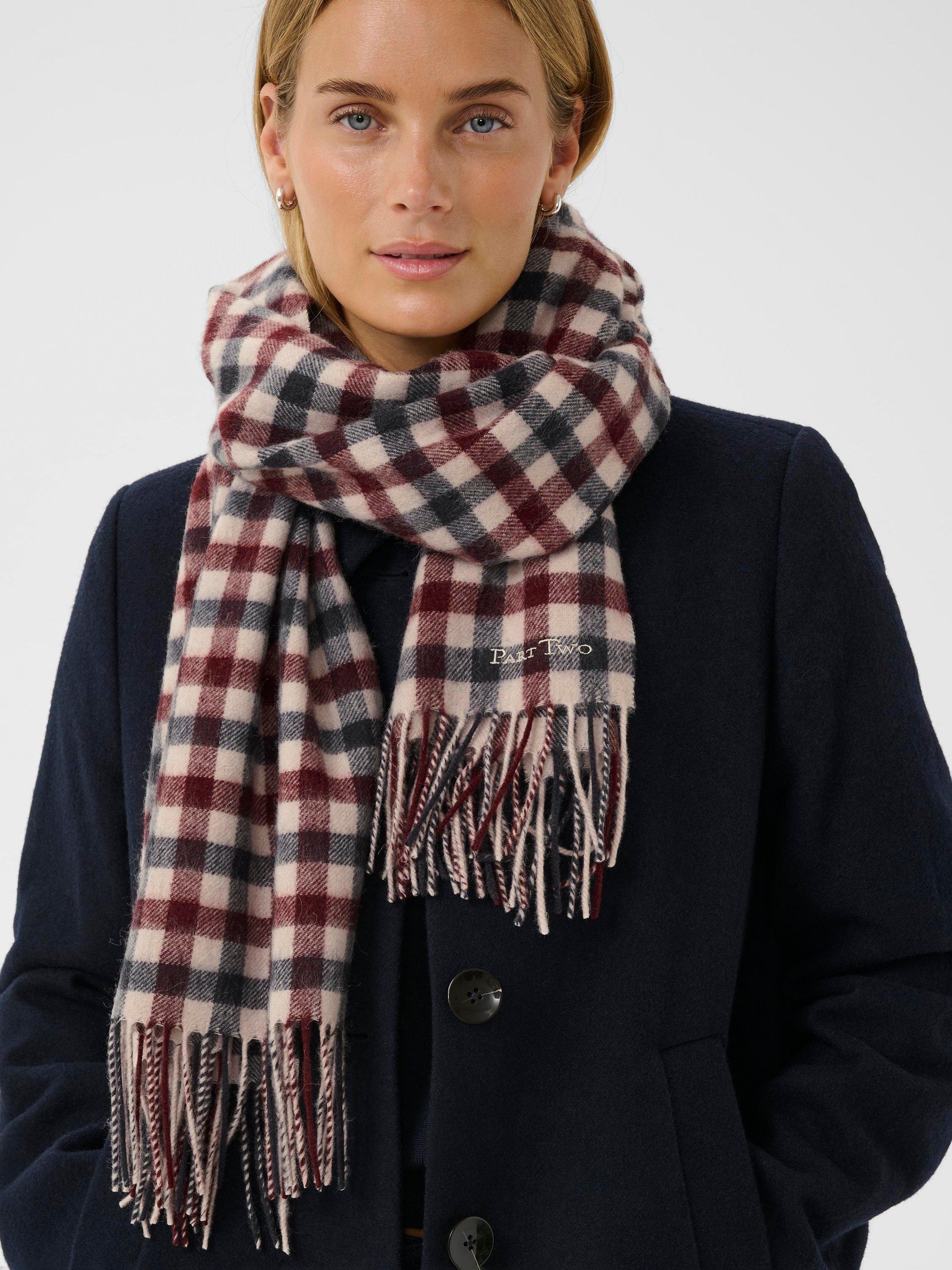 Much needed on cold, wintery days, this woollen scarf from Part Two features a timeless check print.
