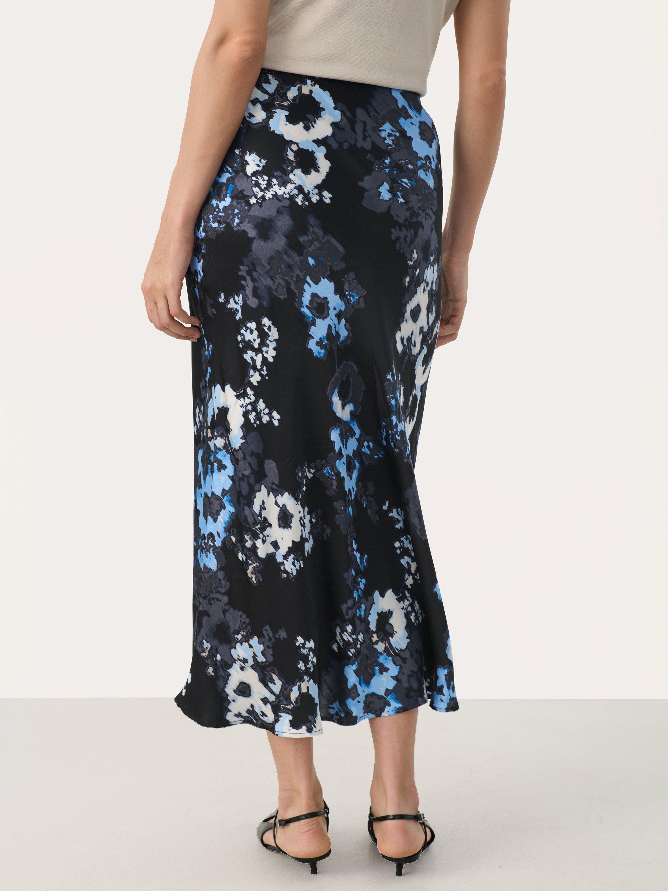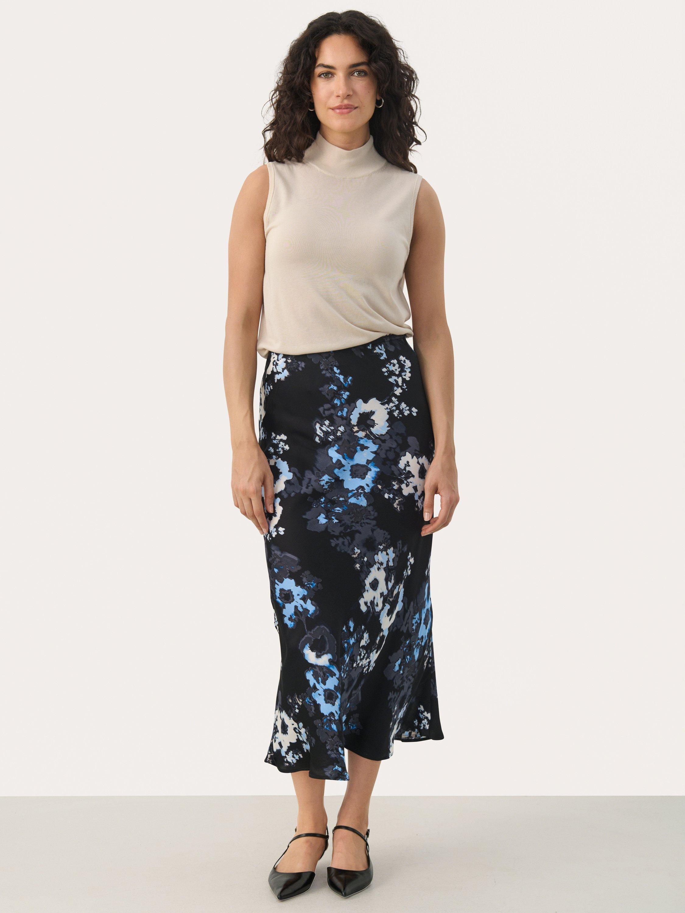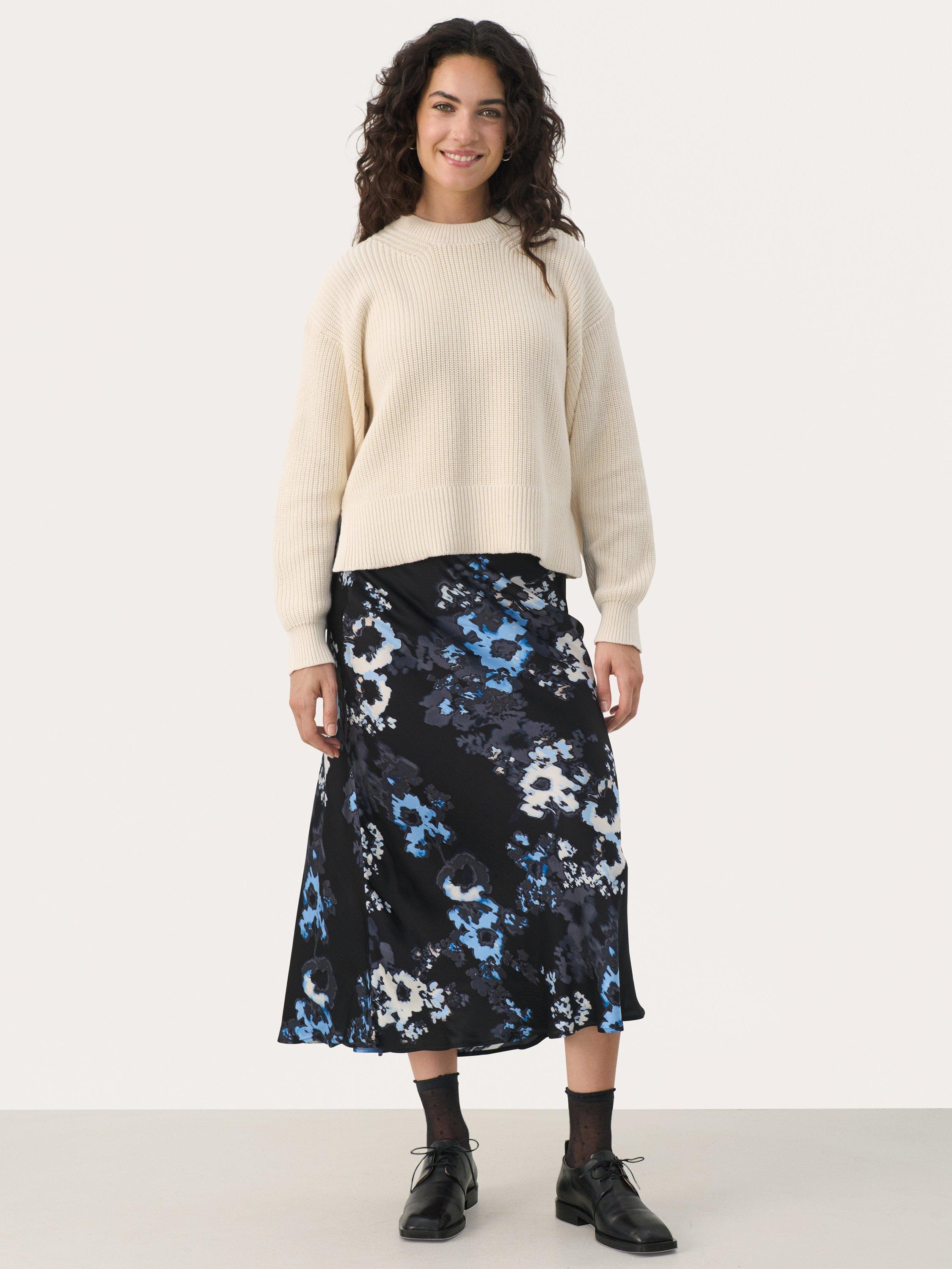 The Laurina midi skirt is a feminine and versatile piece, that can easily be styled up or down as you please. It has an elastic midrise waist, and it has a regular fit with a straight silhouette. The skirt is made in a lovely print, and it comes down below the calves.