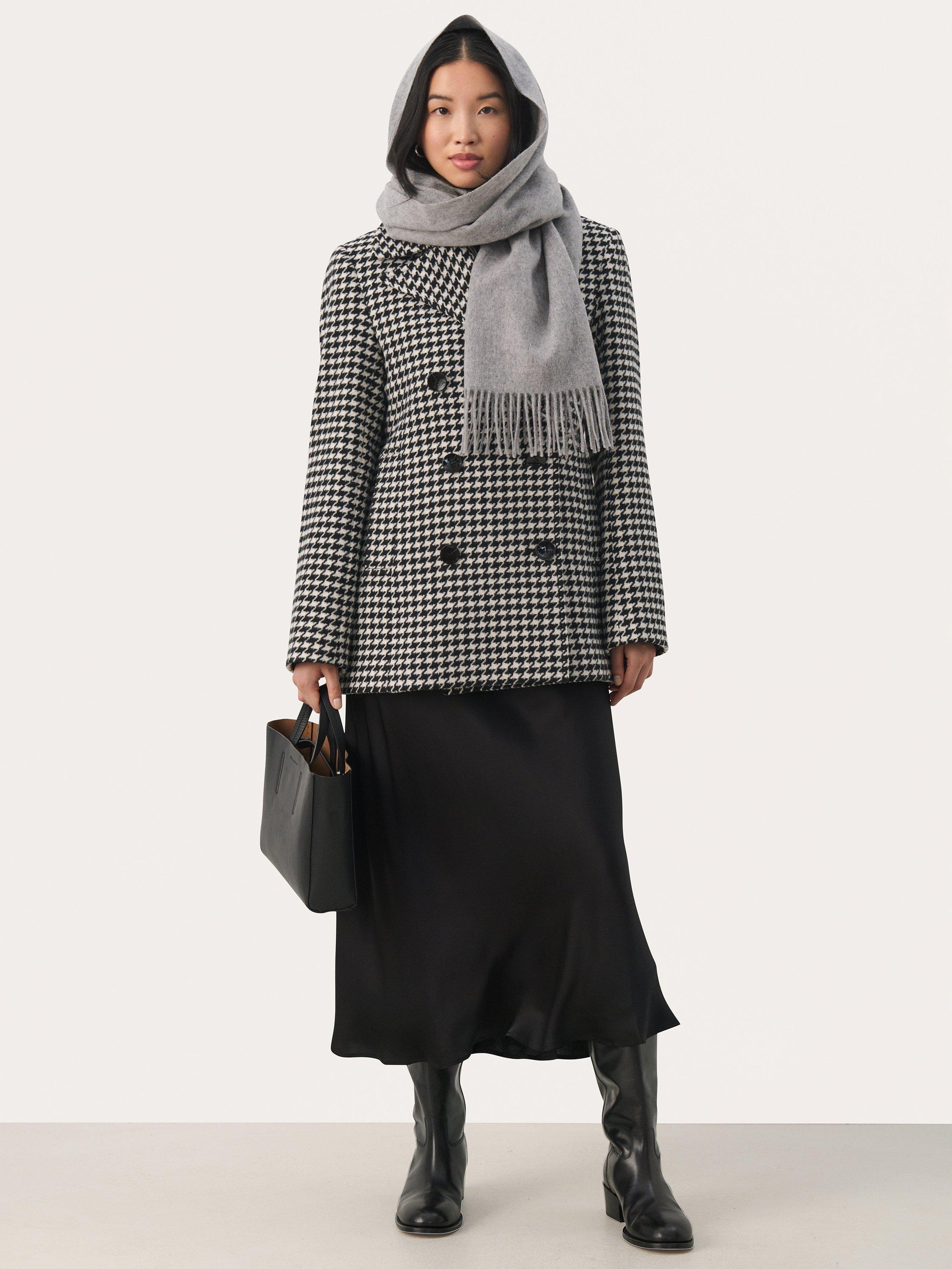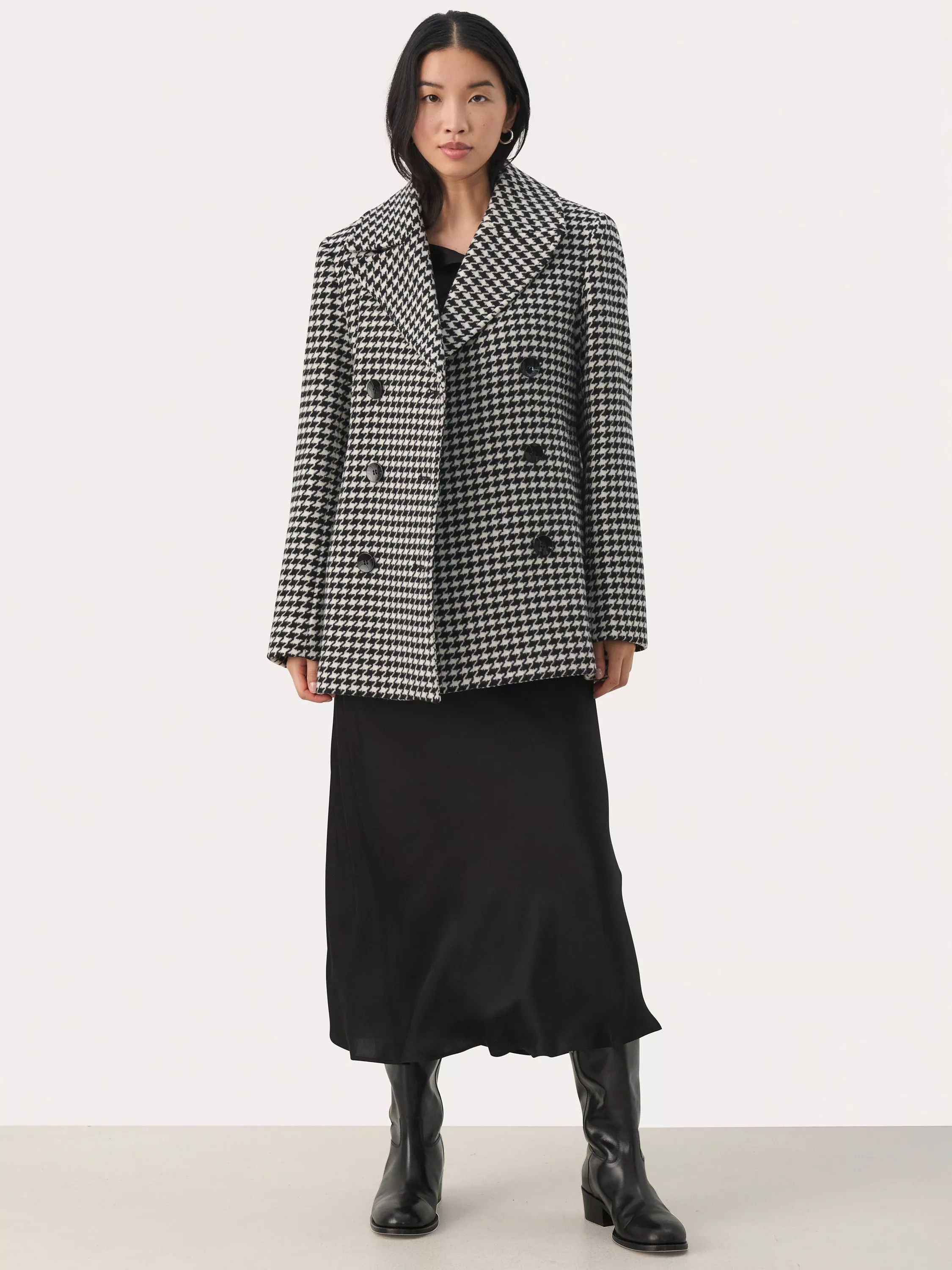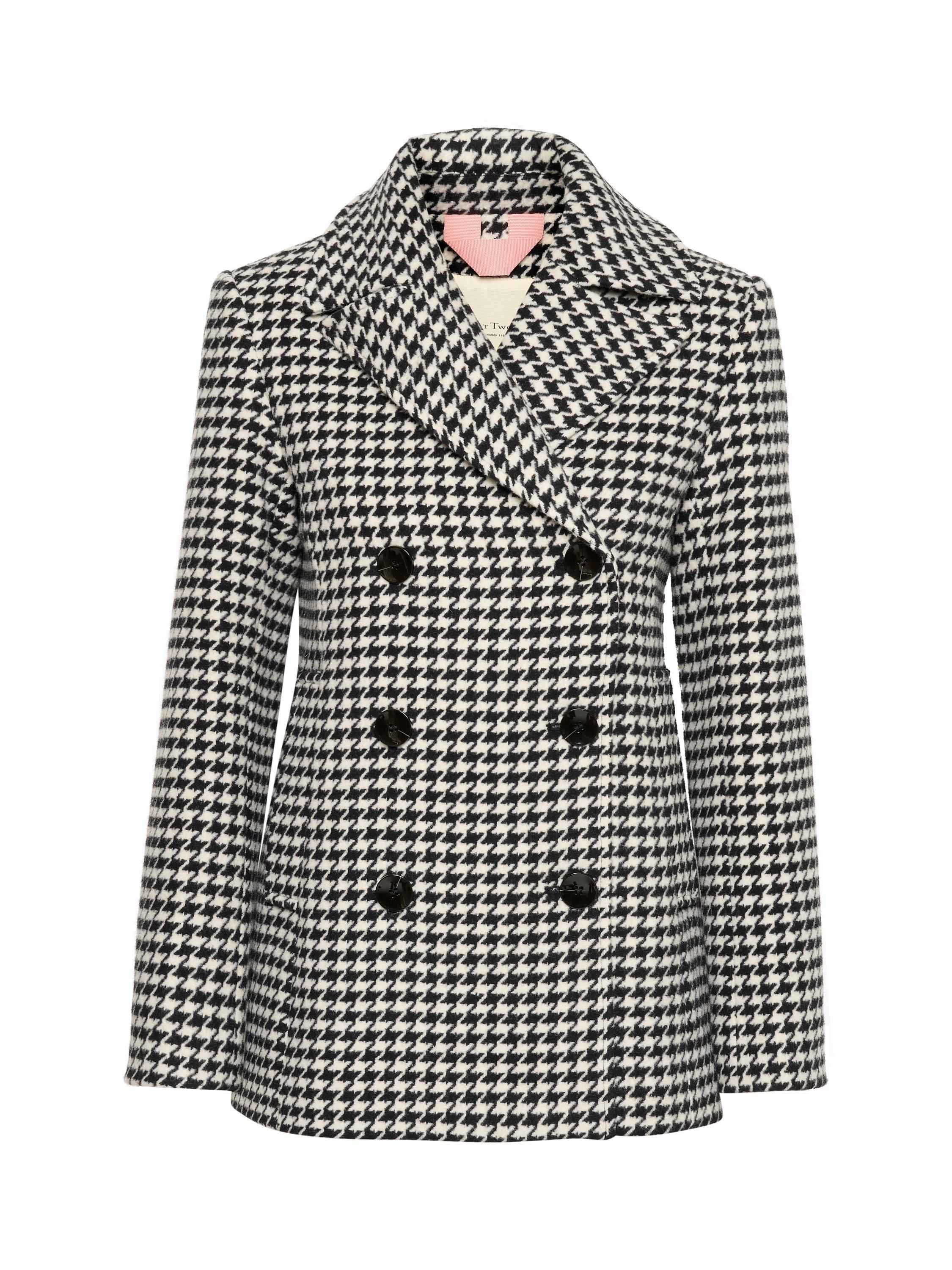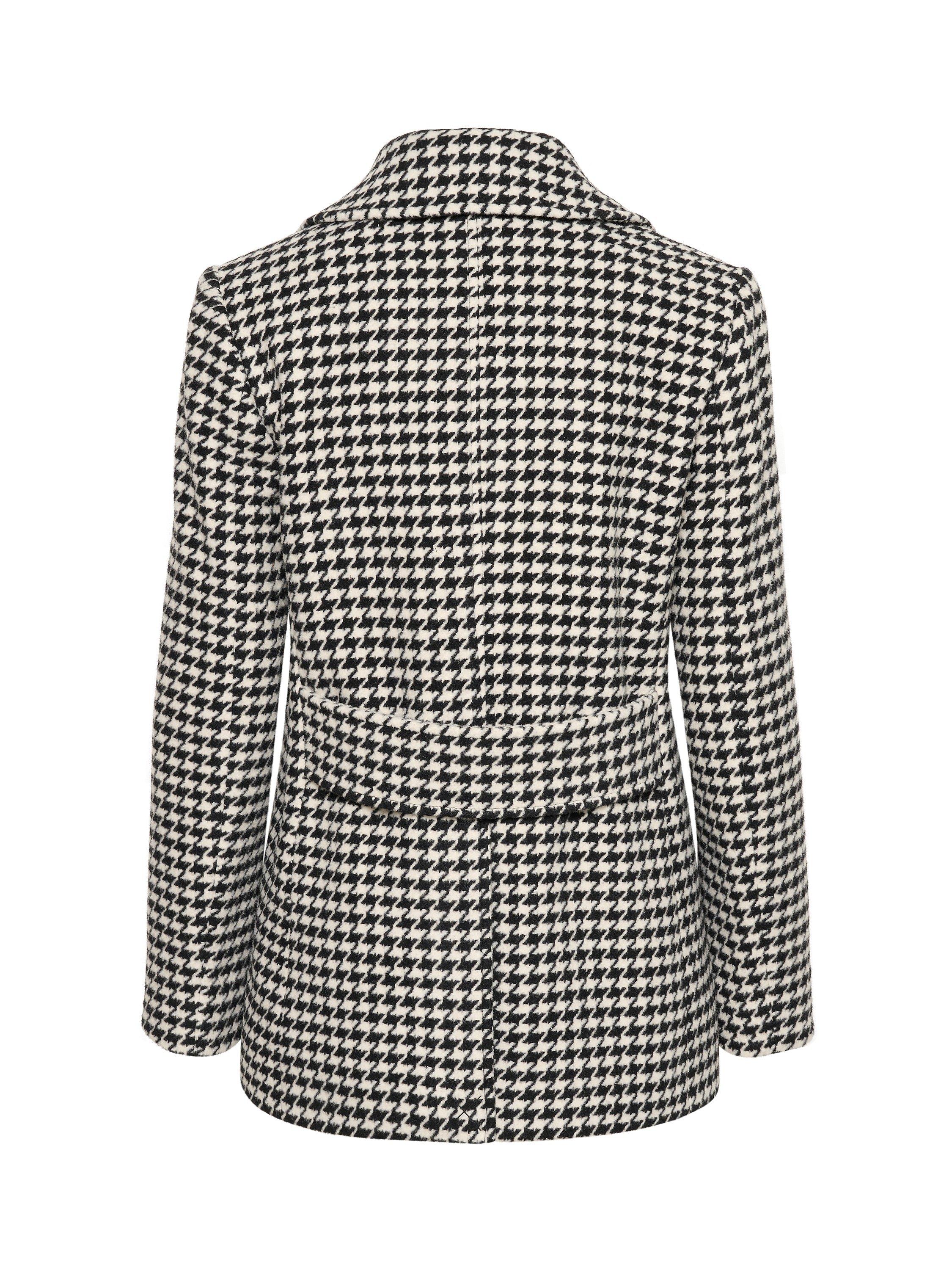 The Lekia coat is a classic piece of outerwear in a stylish houndstooth print. It is double-breasted with a notch lapel, and it has a tailored fit with buttons. The coat has long sleeves with a straight edge, and it is cut right below the hips.