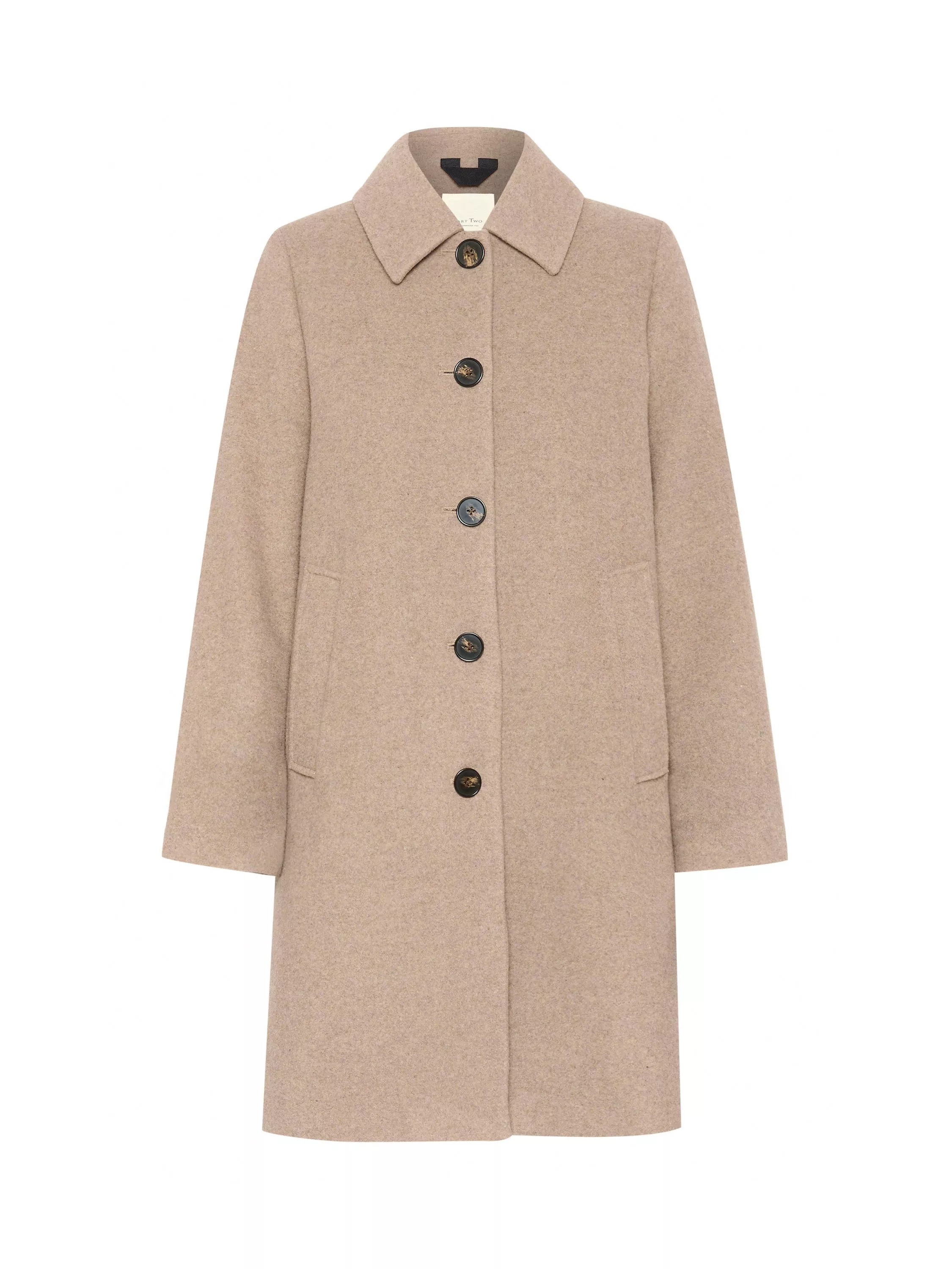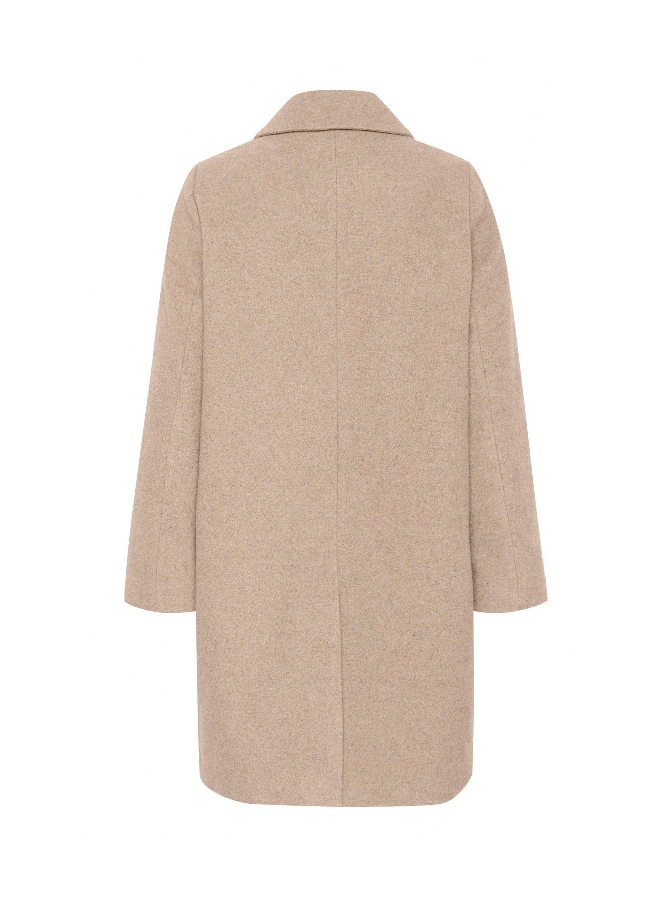 The Lilah coat is simple and versatile, and you can wear it with any outfit. It has a spread collar and button fastening, and it has a regular fit. The sleeves are long, and the coat is cut above the knees. It has straight edges and slanted front pockets.