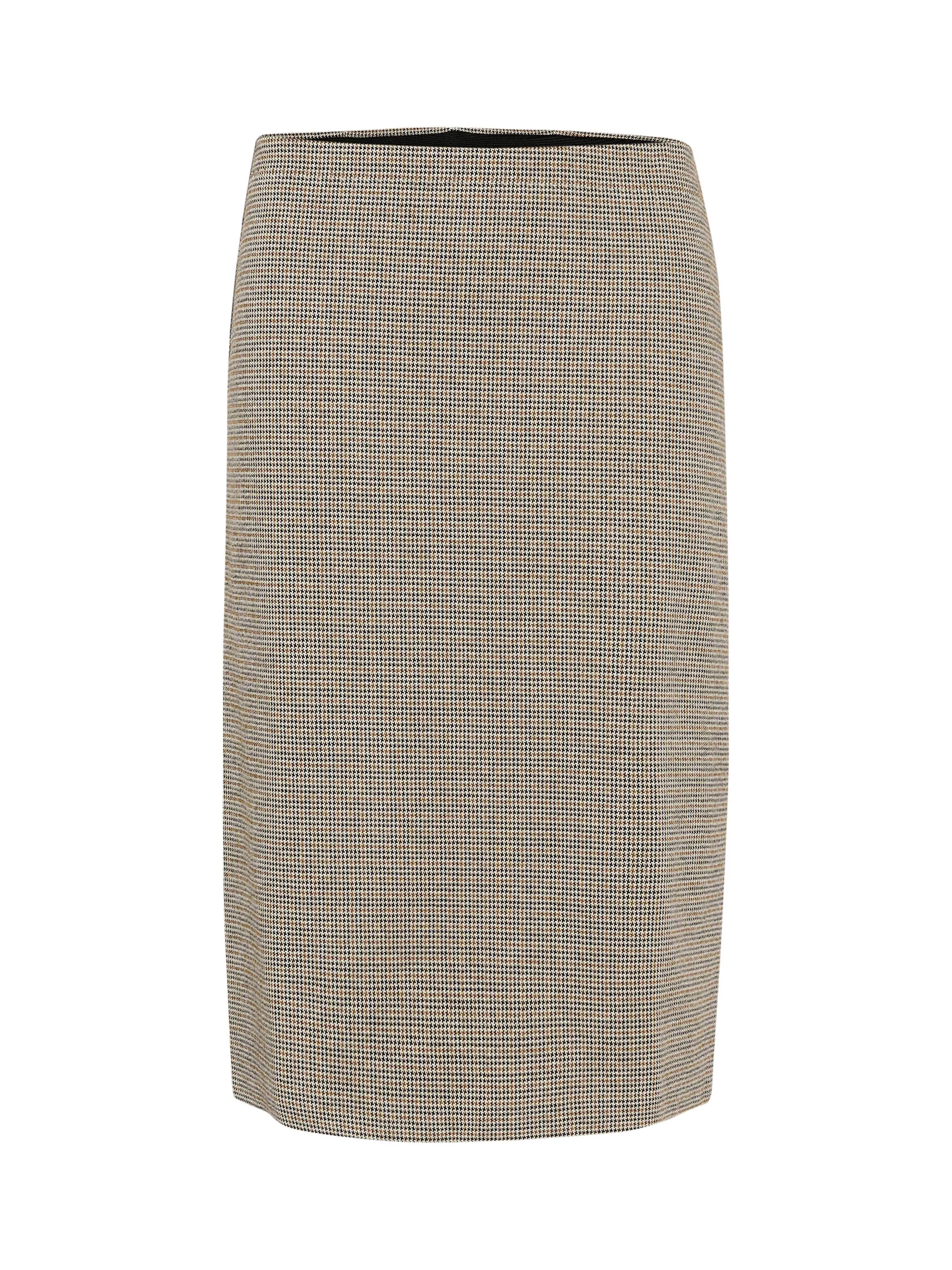 The Lorinne skirt is a timeless and stylish skirt with lots of styling options. It is high-waisted with an elastic, hidden waistband. The skirt has a flattering pencil shape and comes down to the knees, and it has a low slit at the back.