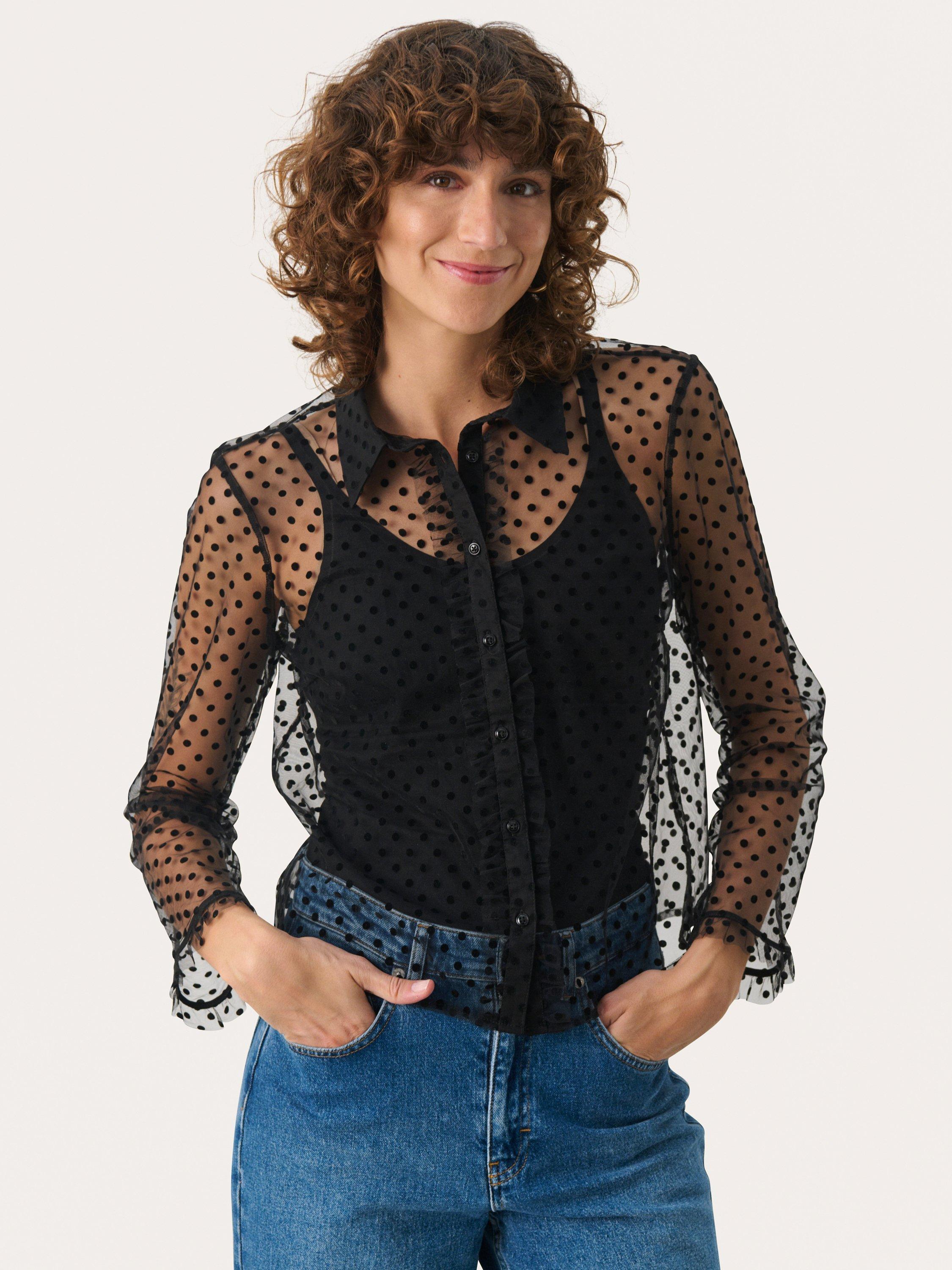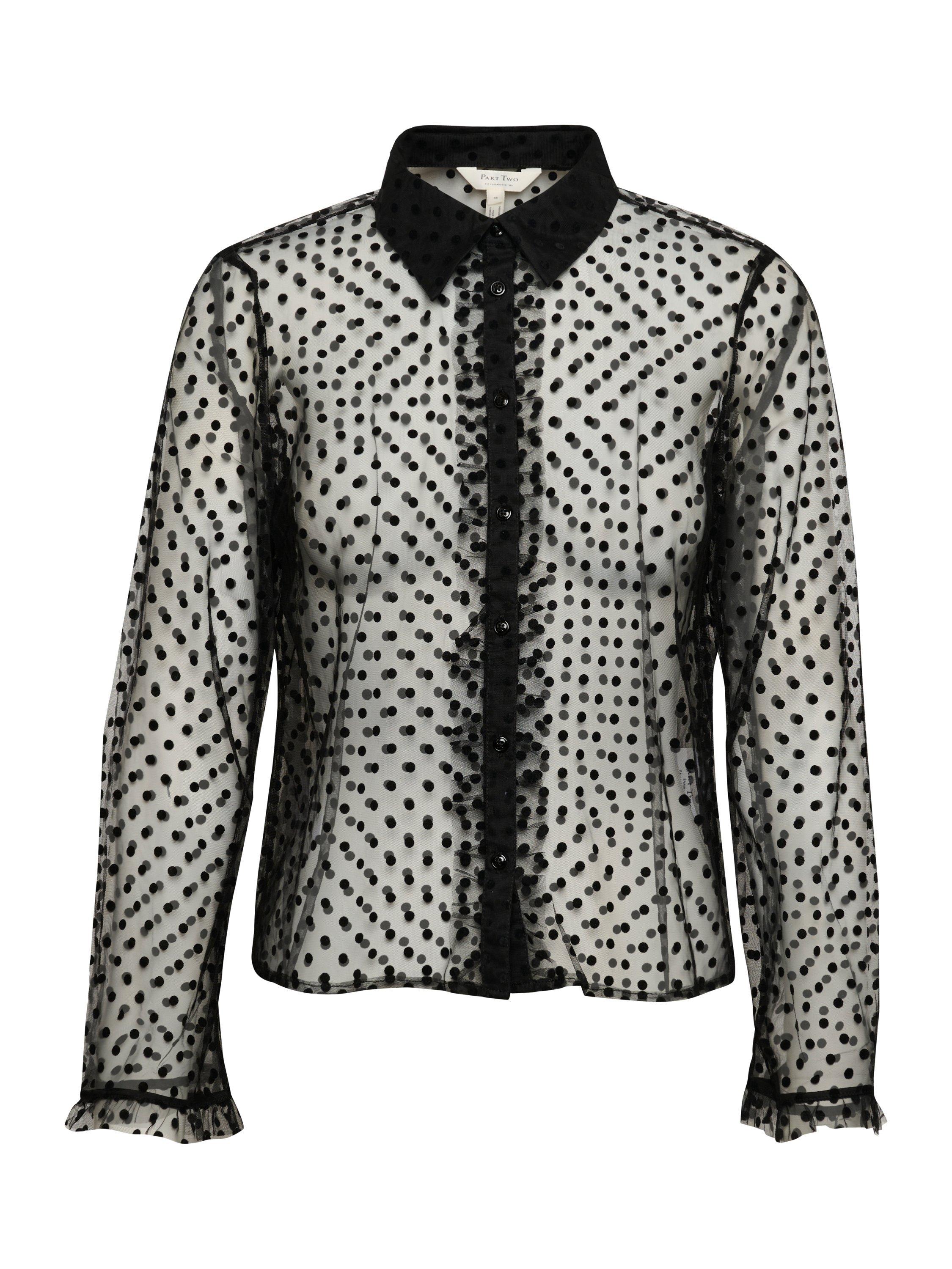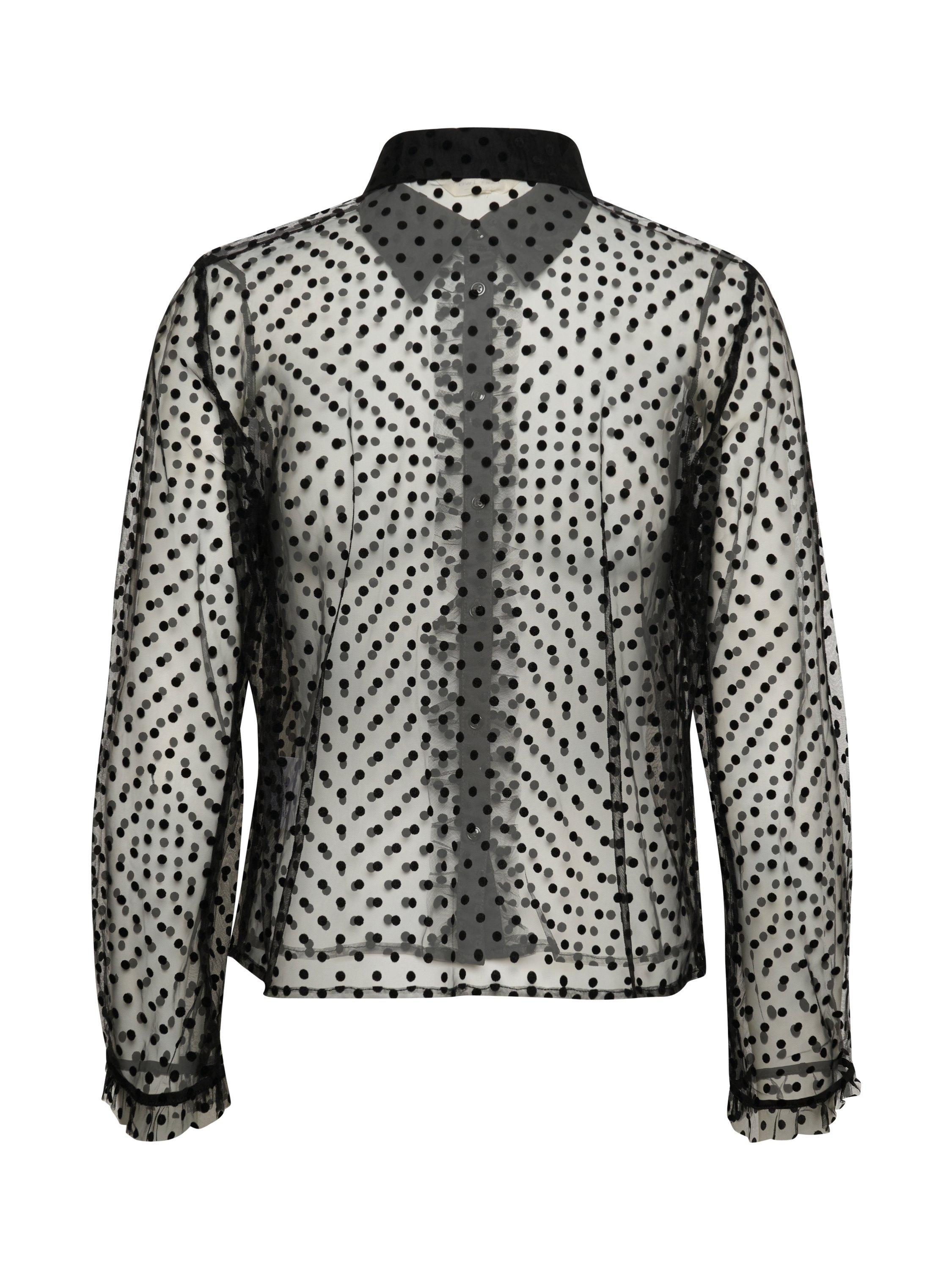 The Marikke shirt is a cool and stylish chiffon shirt, that will make any outfit chic. It has a spread collar and button fastening, and it is sheer with polka dots. The sleeves are long with elastic and frilled edges, and the shirt is cut at the hips.