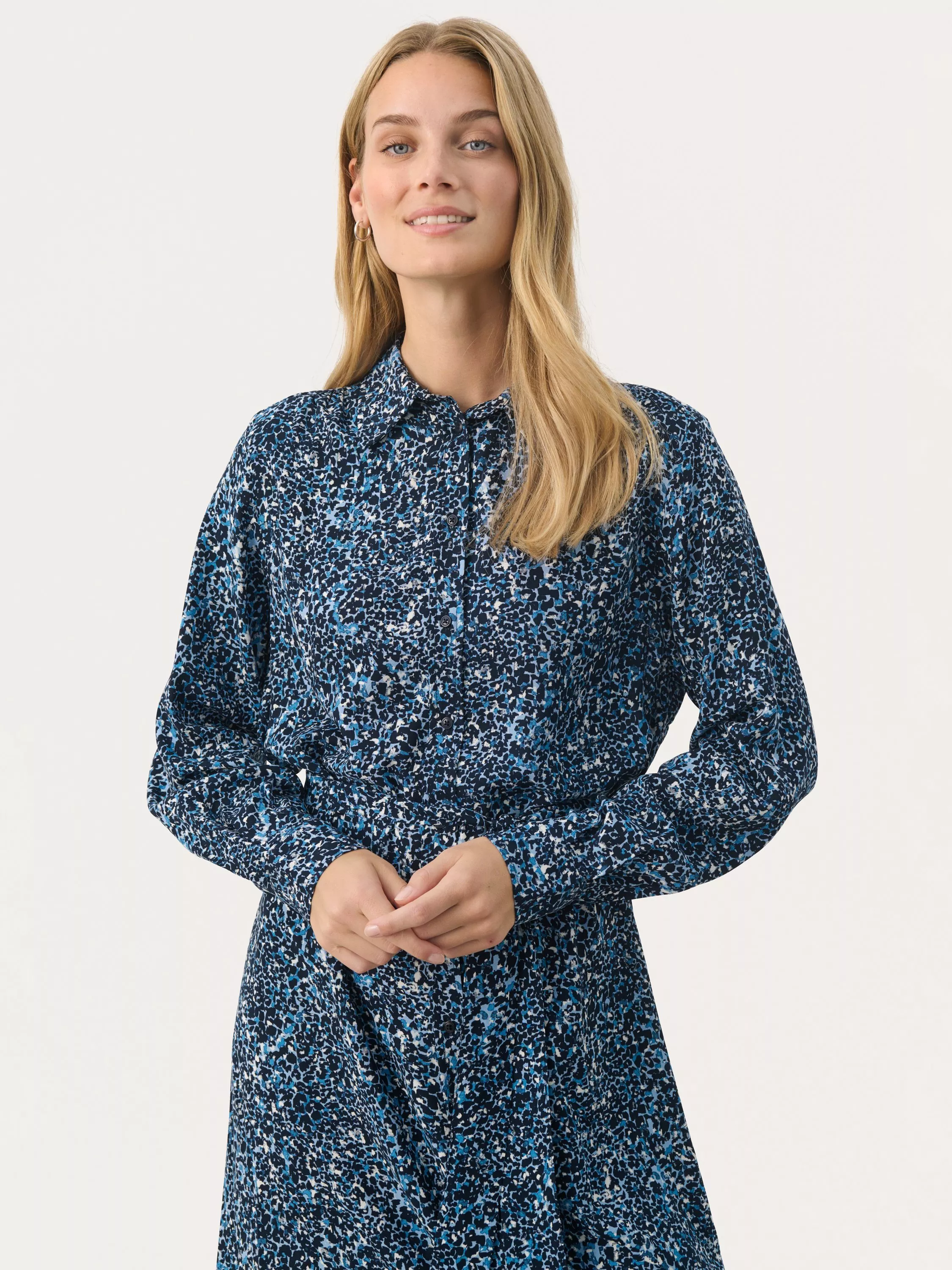 The Meluca shirt dress is a cute everyday dress in a cool print. It has a spread collar and button fastening, and it has a regular fit with a tying belt at the waist. The sleeves are long with wide cuffs, and the dress is cut at the mid-calves.