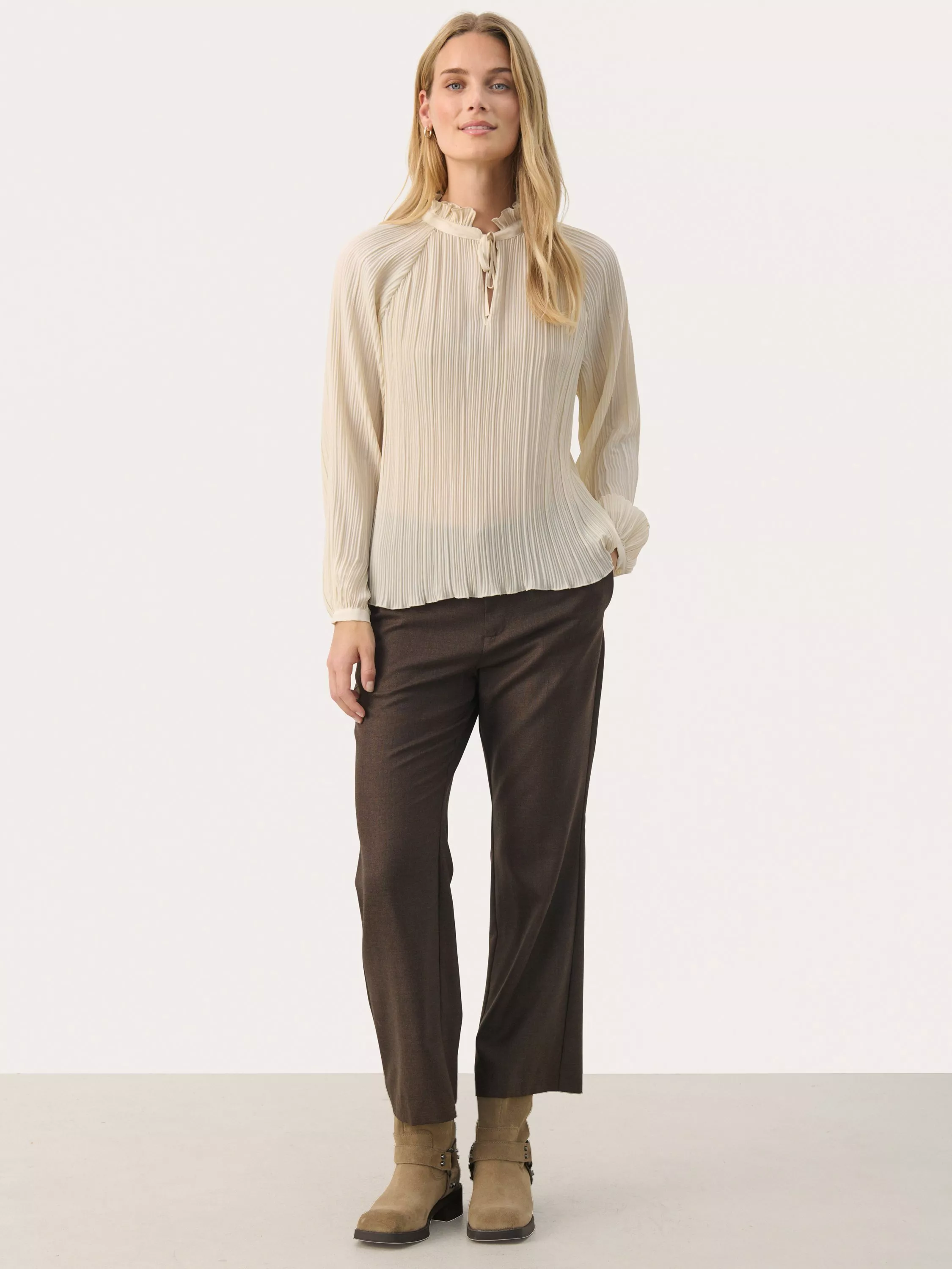 The Myra blouse is an elegant and versatile top. It has a V-notch neck with a tying string and a frilled mandarin collar, and it has a regular fit. The sleeves are long raglan sleeves with narrow, buttoned cuffs, and the blouse is made in a pleated fabric and comes down to the hips.
