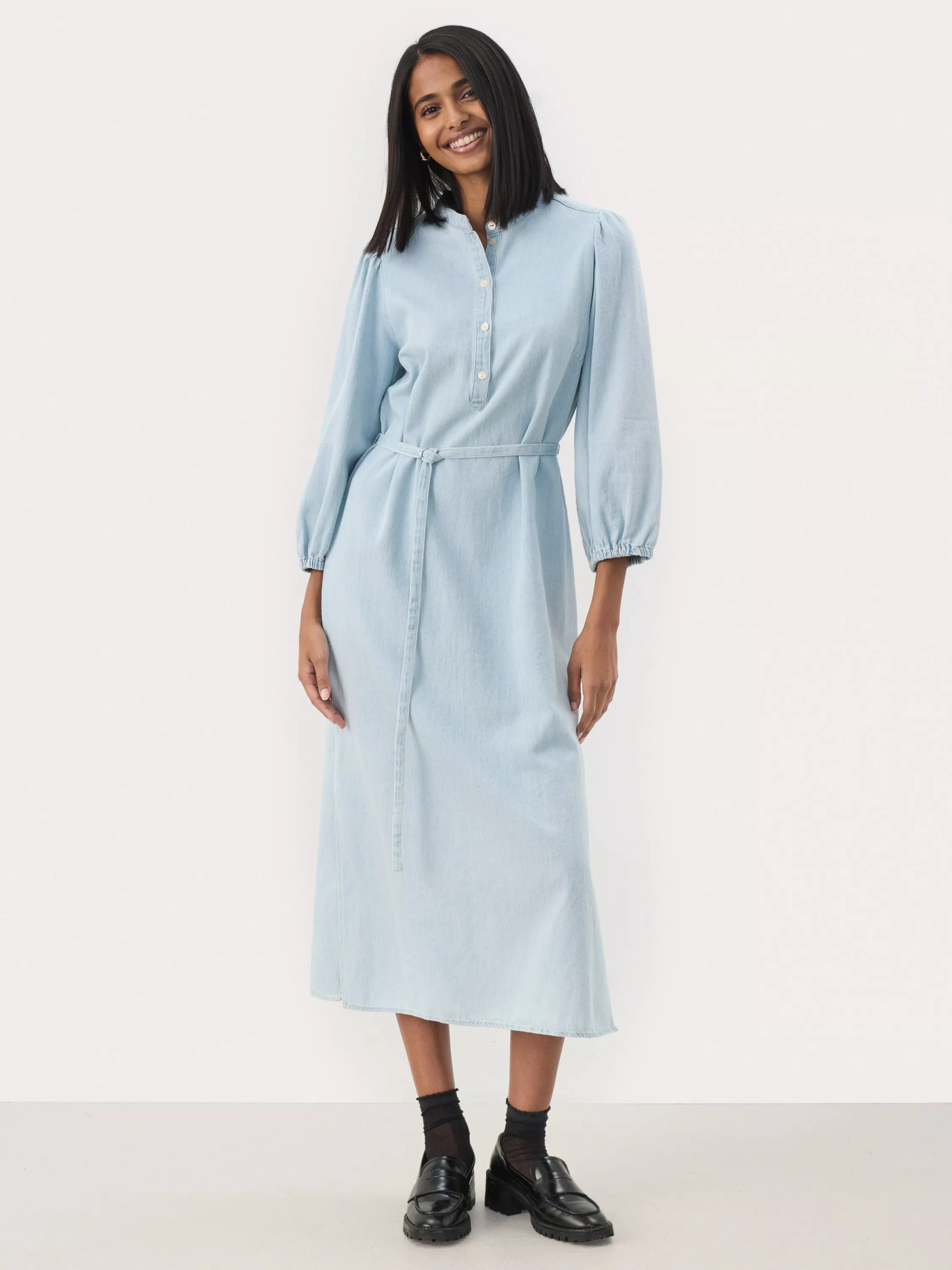 This Nadija dress combines casual elegance with a feminine cut. Featuring a waist tie, front button closure, and three-quarter sleeves, it's perfect for both everyday wear and special occasions. A must-have for a classic yet modern style.