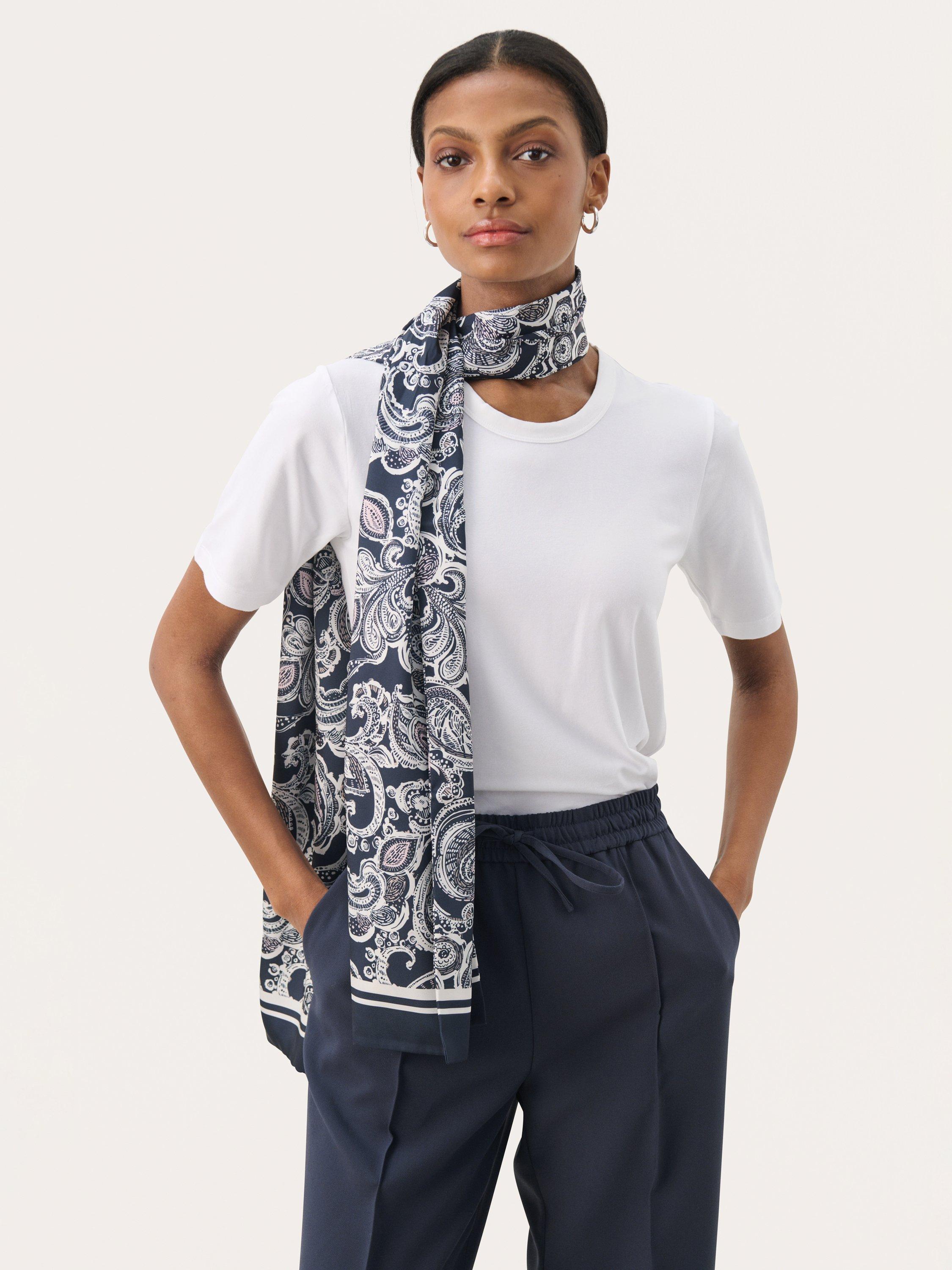 Add a touch of elegance to your outfit with this stylish scarf. Featuring a beautiful pattern and refined contrast borders, it can be worn as a sophisticated neck or hair accessory. Made from a lightweight, smooth fabric that ensures all-day comfort.
