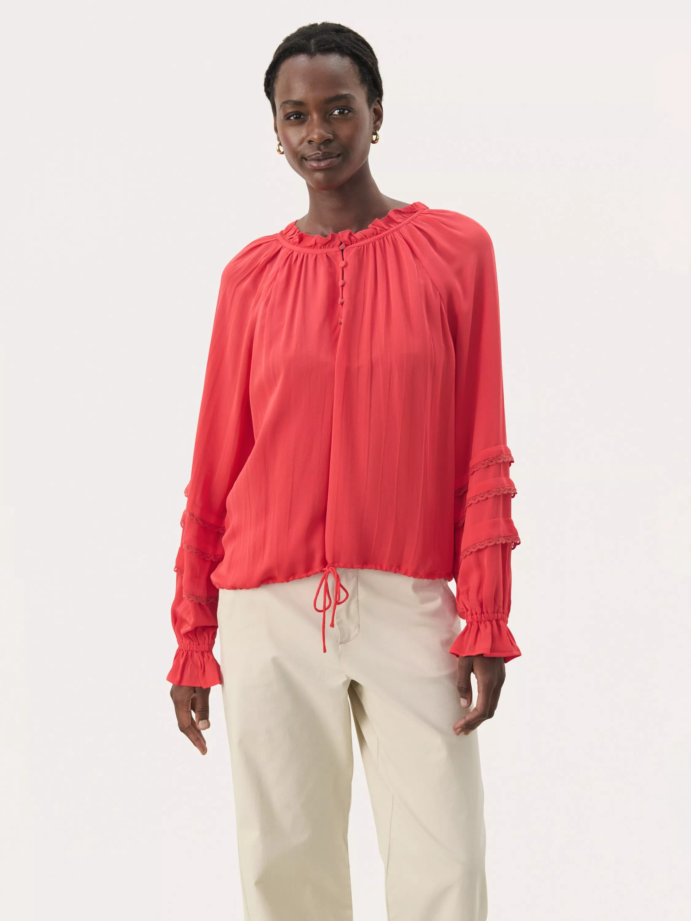 This Naracha blouse features delicate details such as a ruffled neckline, front button closure, and elastic cuffs with ruffles. The voluminous sleeves and adjustable drawstring at the hem add a bohemian-inspired look, perfect with jeans or skirts for a relaxed yet stylish vibe.