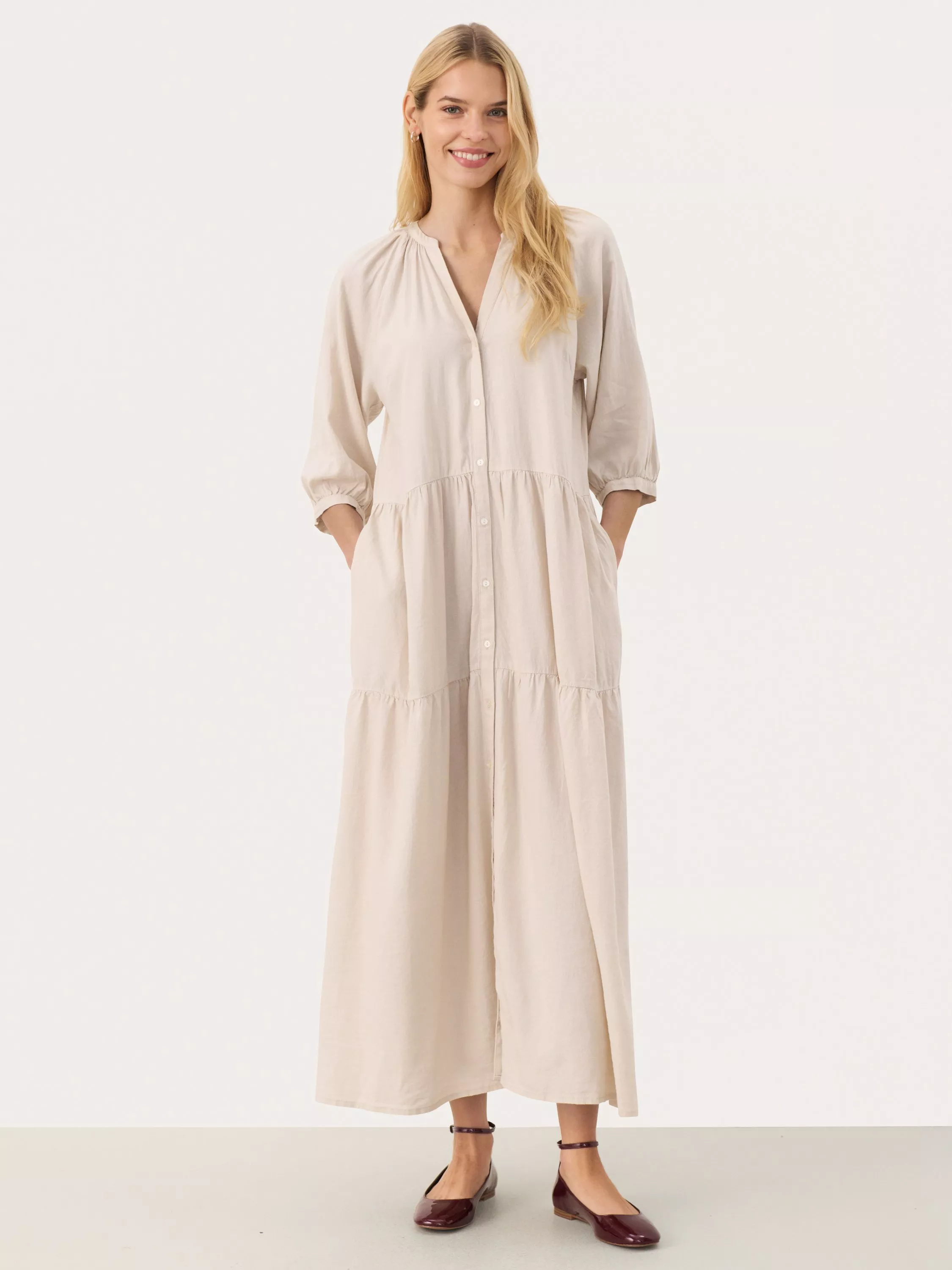 This Nataliya maxi dress features a timeless and elegant design with a full button-down front and V-neckline. The relaxed fit and three-quarter sleeves create a casual yet sophisticated look. Perfect for both everyday wear and special occasions - pair with sandals or boots.