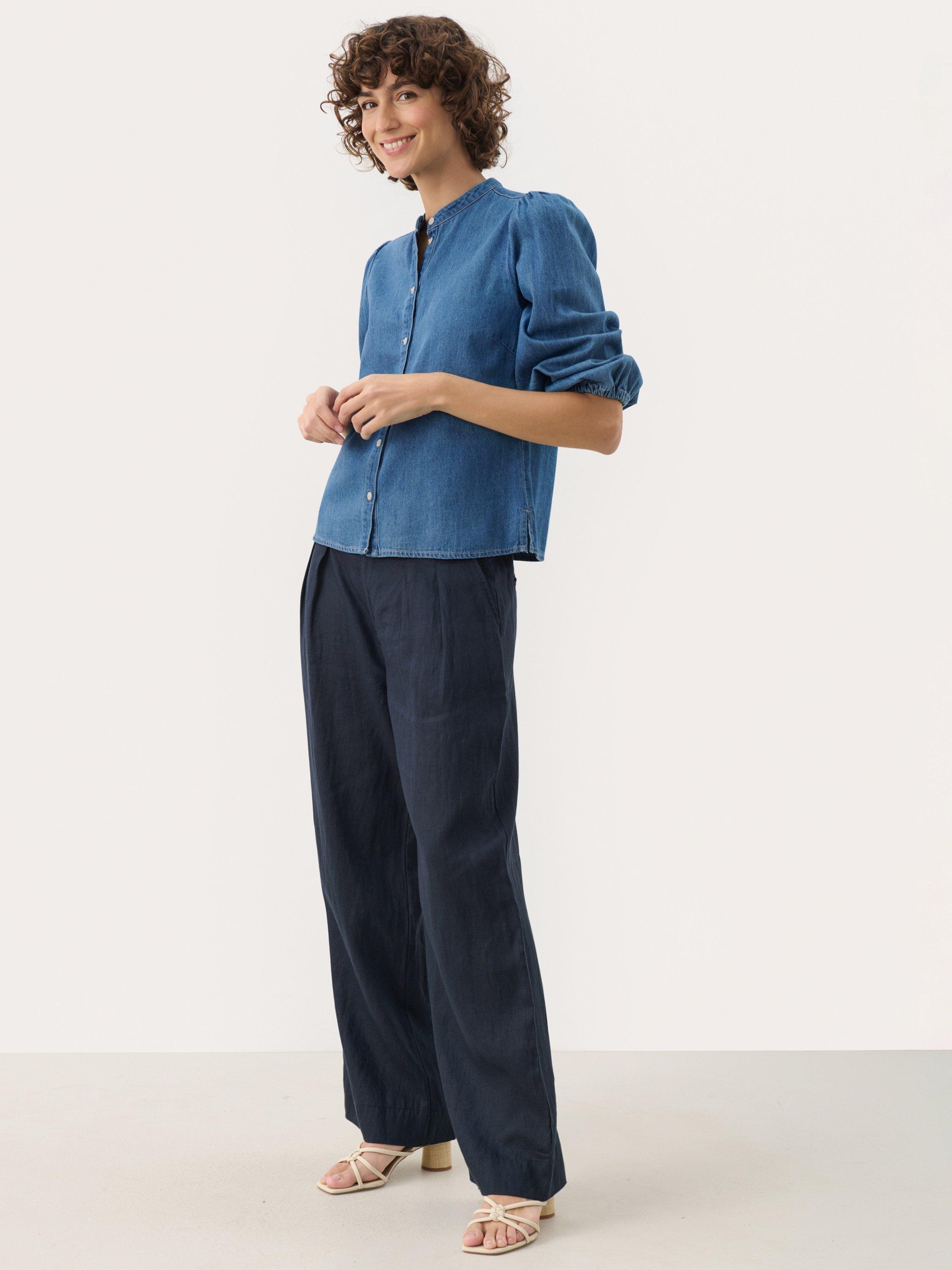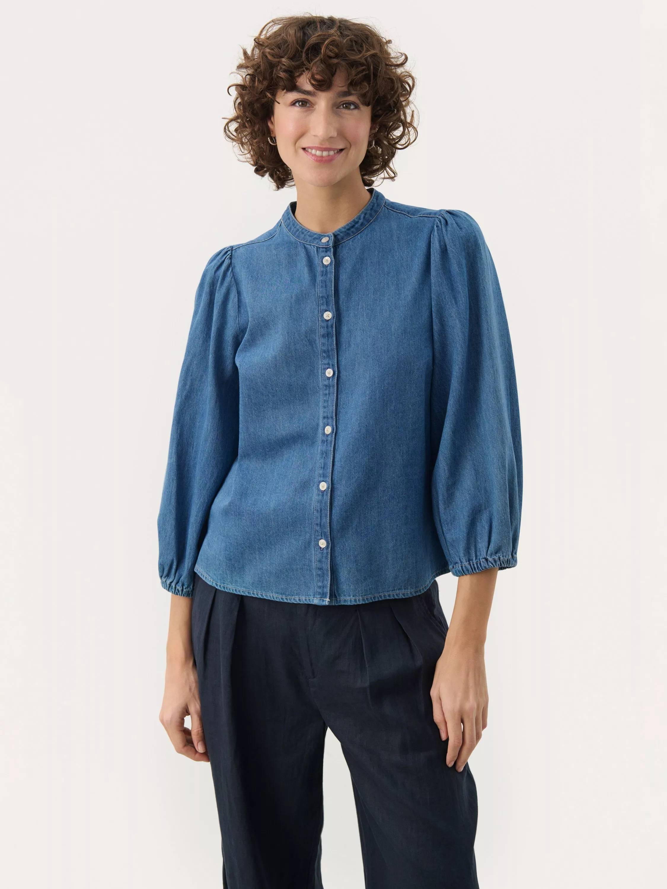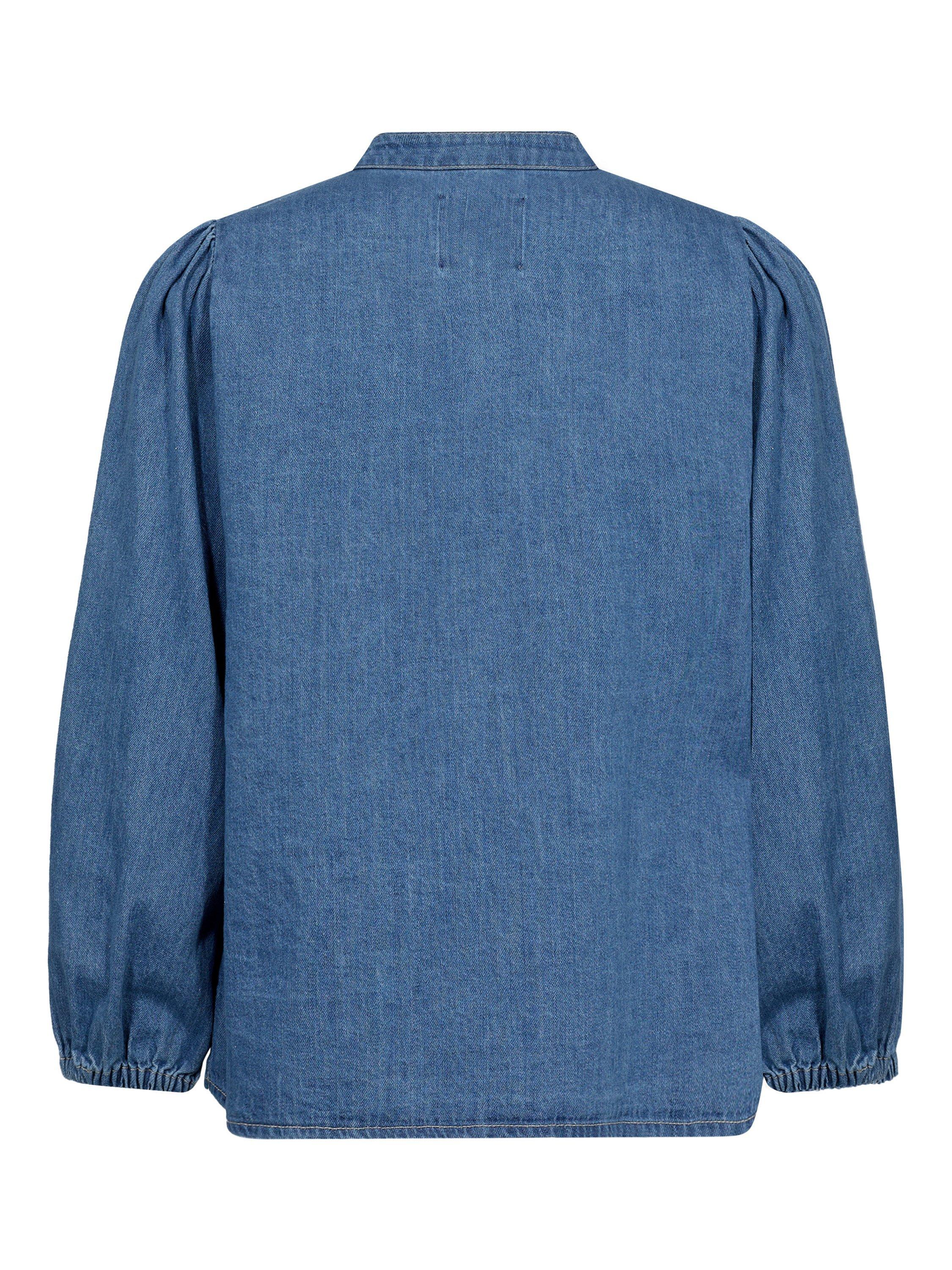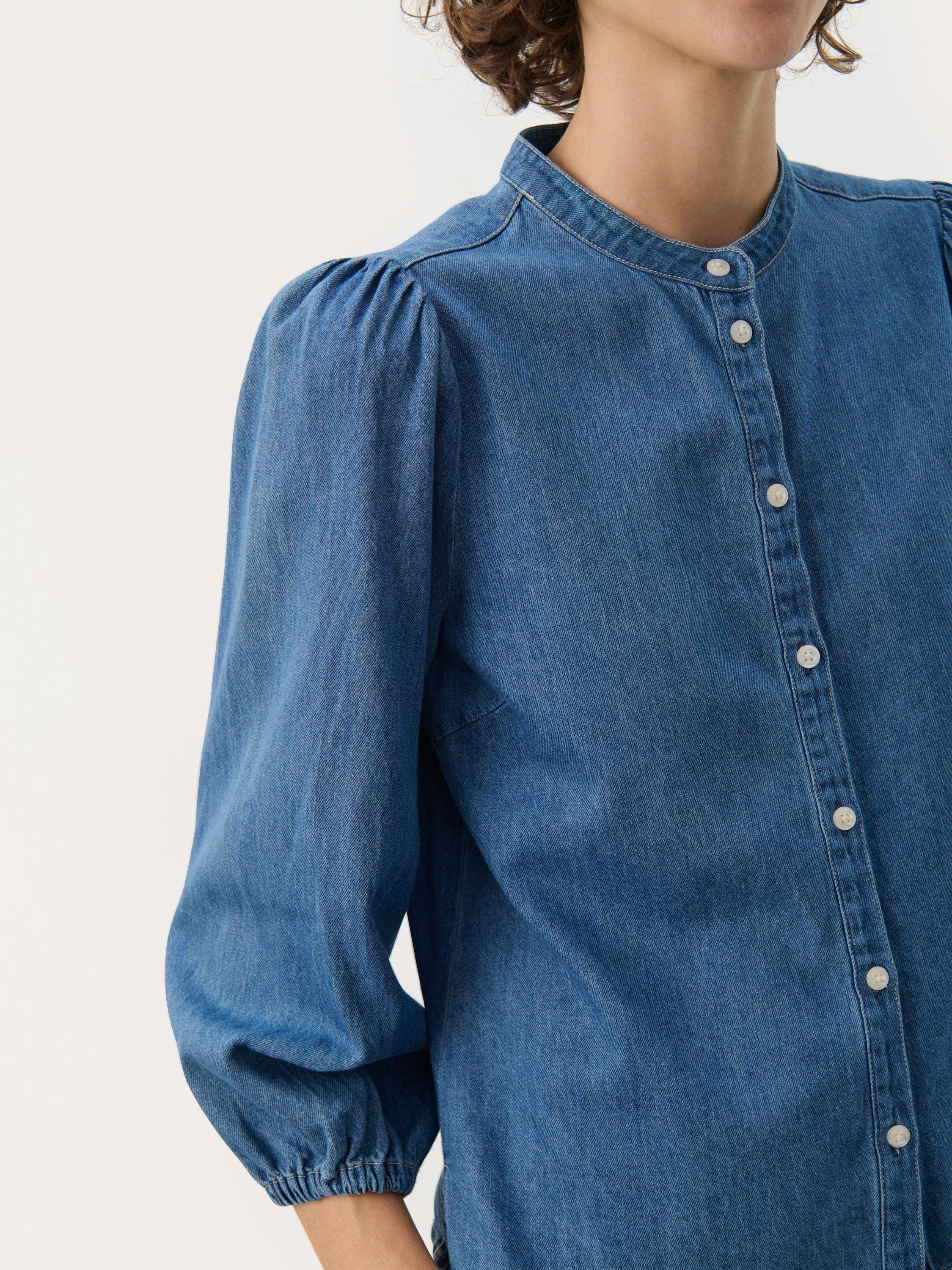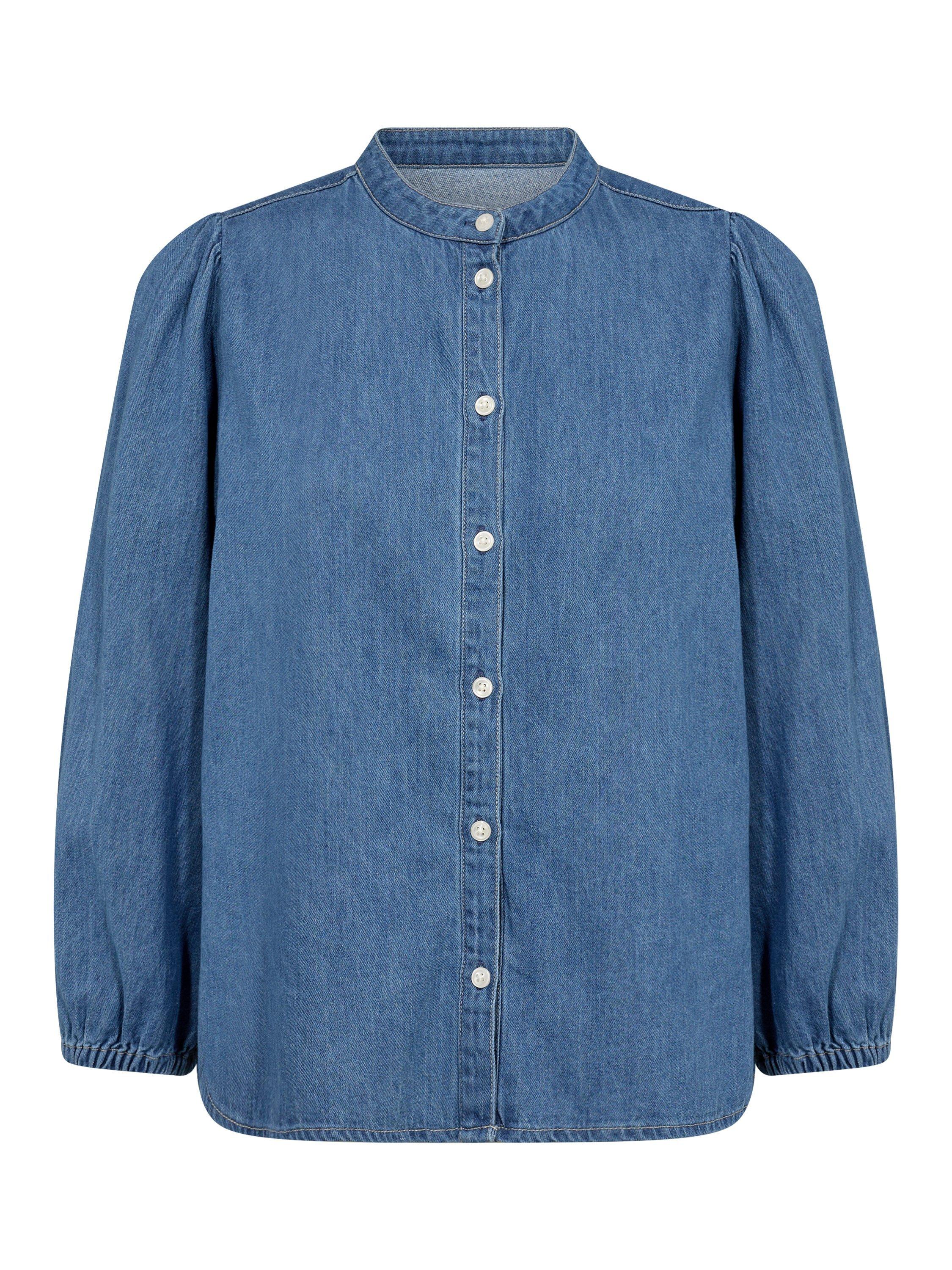 This Nicolie denim shirt with a round neckline and button closure offers a modern, timeless look. Featuring lightly puffed sleeves and a loose fit, it's perfect for a relaxed everyday style. Pair with jeans for a cool denim-on-denim look or with a skirt for a feminine touch.