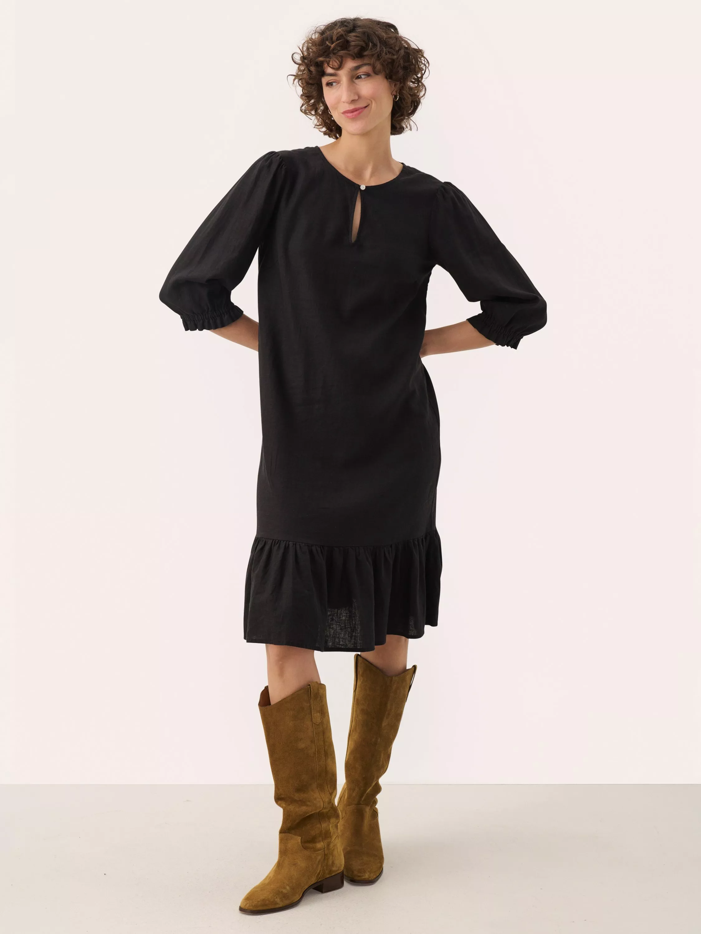 This Nimi dress with three-quarter sleeves and a feminine ruffled hem combines elegance and comfort. Featuring a round neckline and a relaxed fit, it's perfect for both casual and formal occasions. Pair with boots or sandals for a relaxed, stylish look.