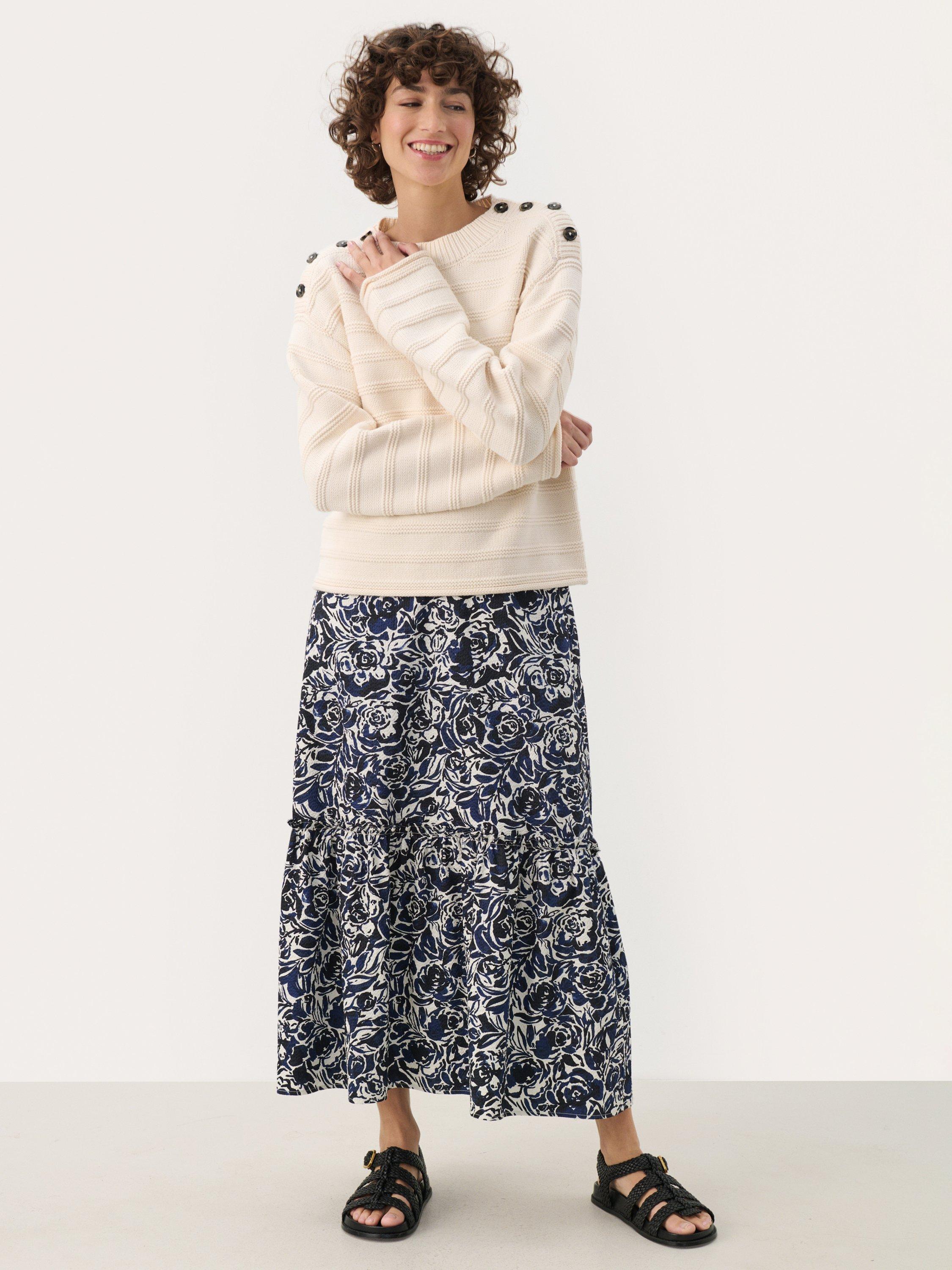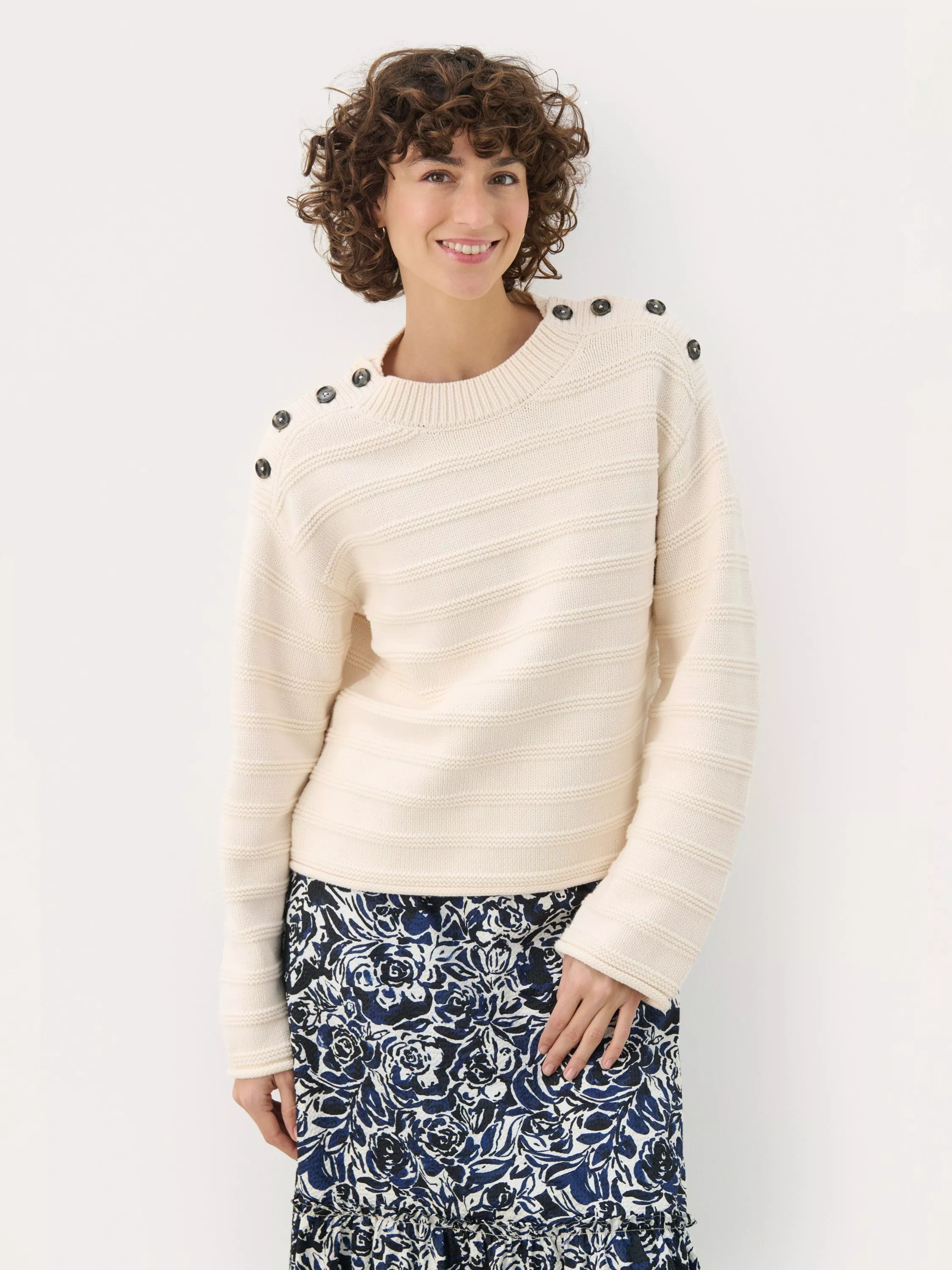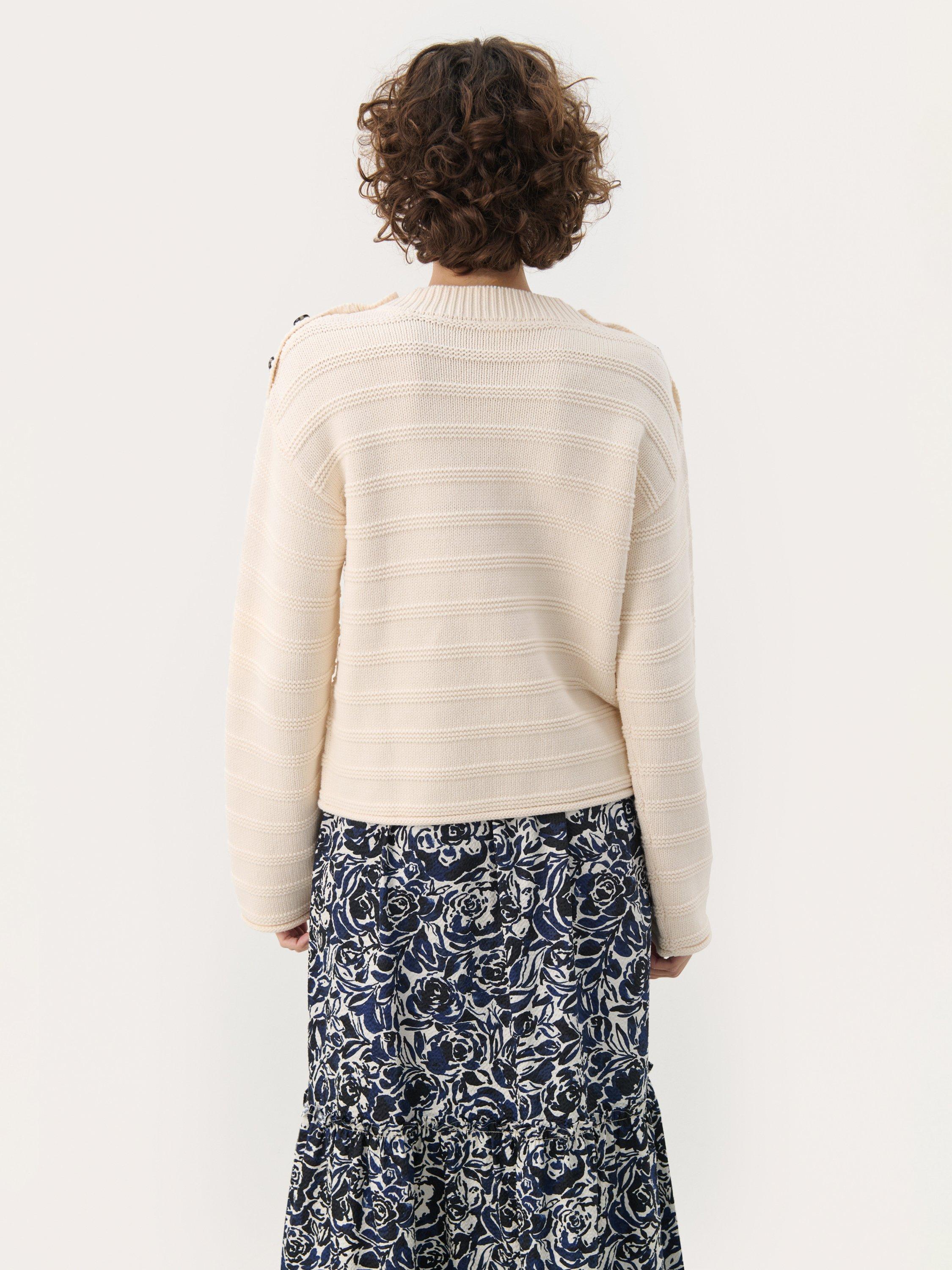 This Noell sweater with button details on the shoulders adds a unique touch to your outfit. Designed with a relaxed fit and subtle horizontal stripes, it provides a stylish yet casual look. Perfect with jeans or skirts for a modern style.