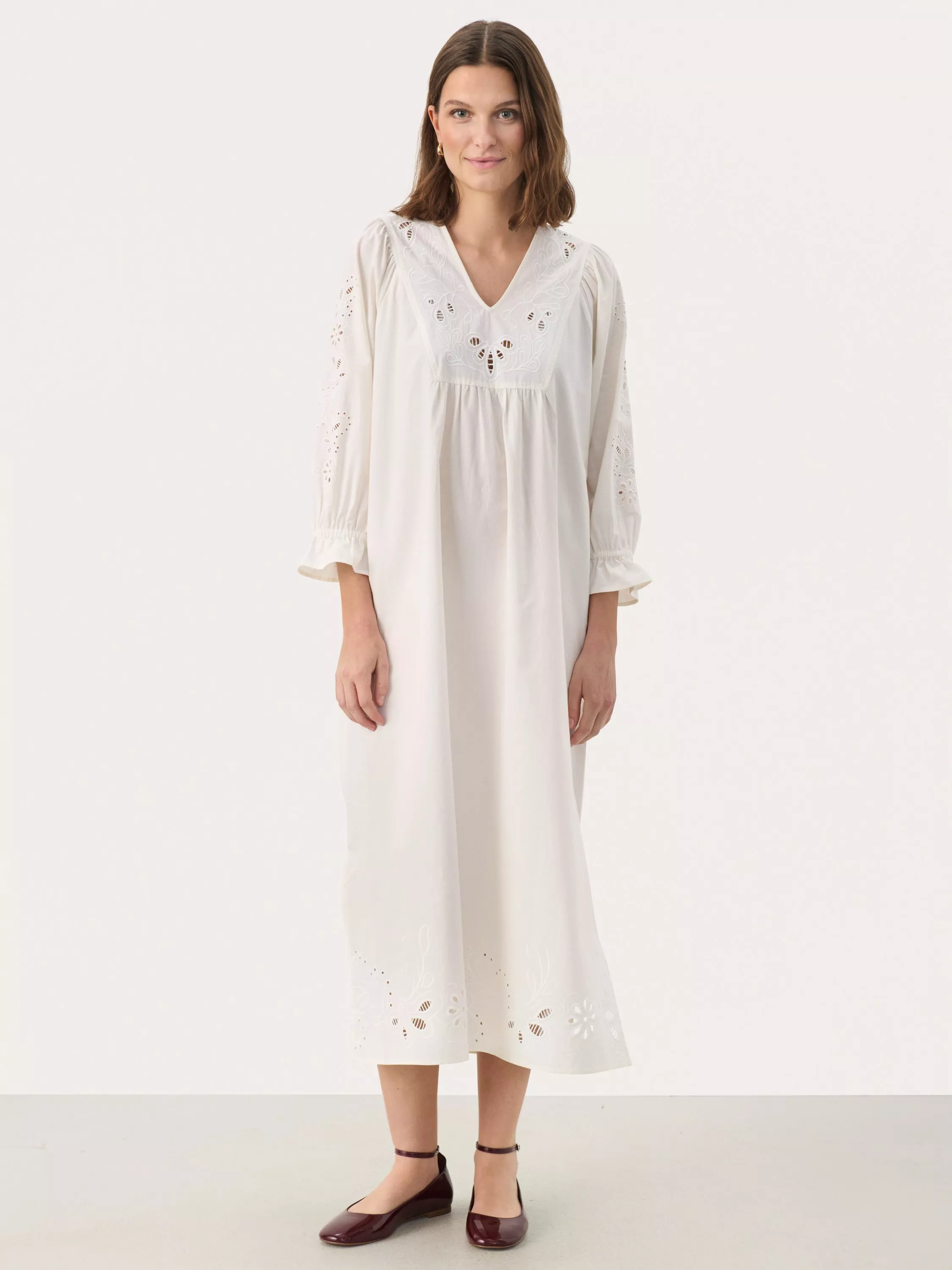 The Nura dress with embroidered details exudes bohemian charm. Featuring a loose fit, V-neckline, and decorative embroidery on the chest, sleeves, and hem, it's perfect for both special occasions and everyday wear. Style with sandals or boots for a personal touch.