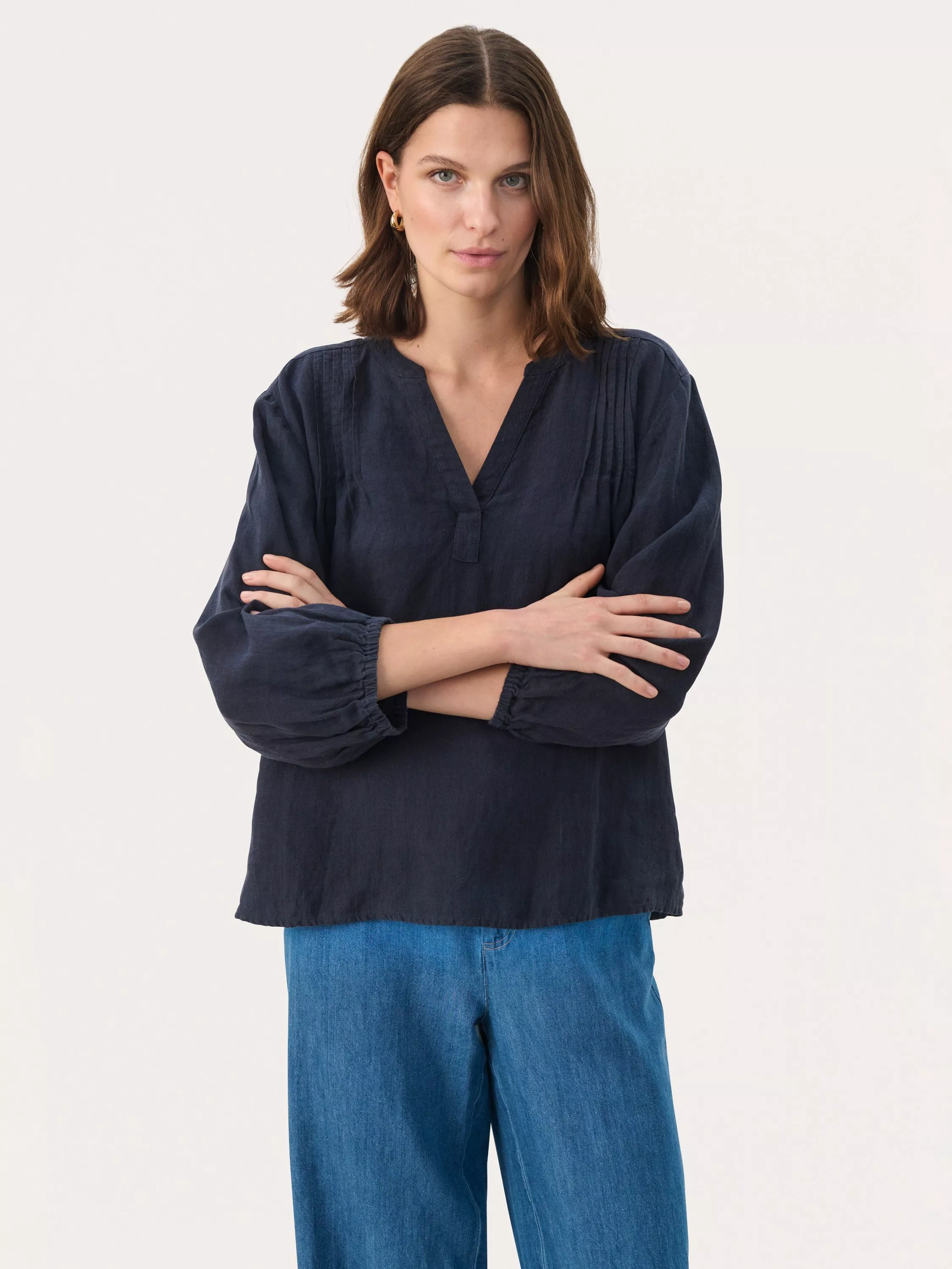 Designed with delicate pleated details on the shoulders, this blouse from Part Two is a stunning choice. With a flattering v-neckline and bracelet length sleeves, it is made from pure linen and comes in a loose fit that makes it ideal for warm days.