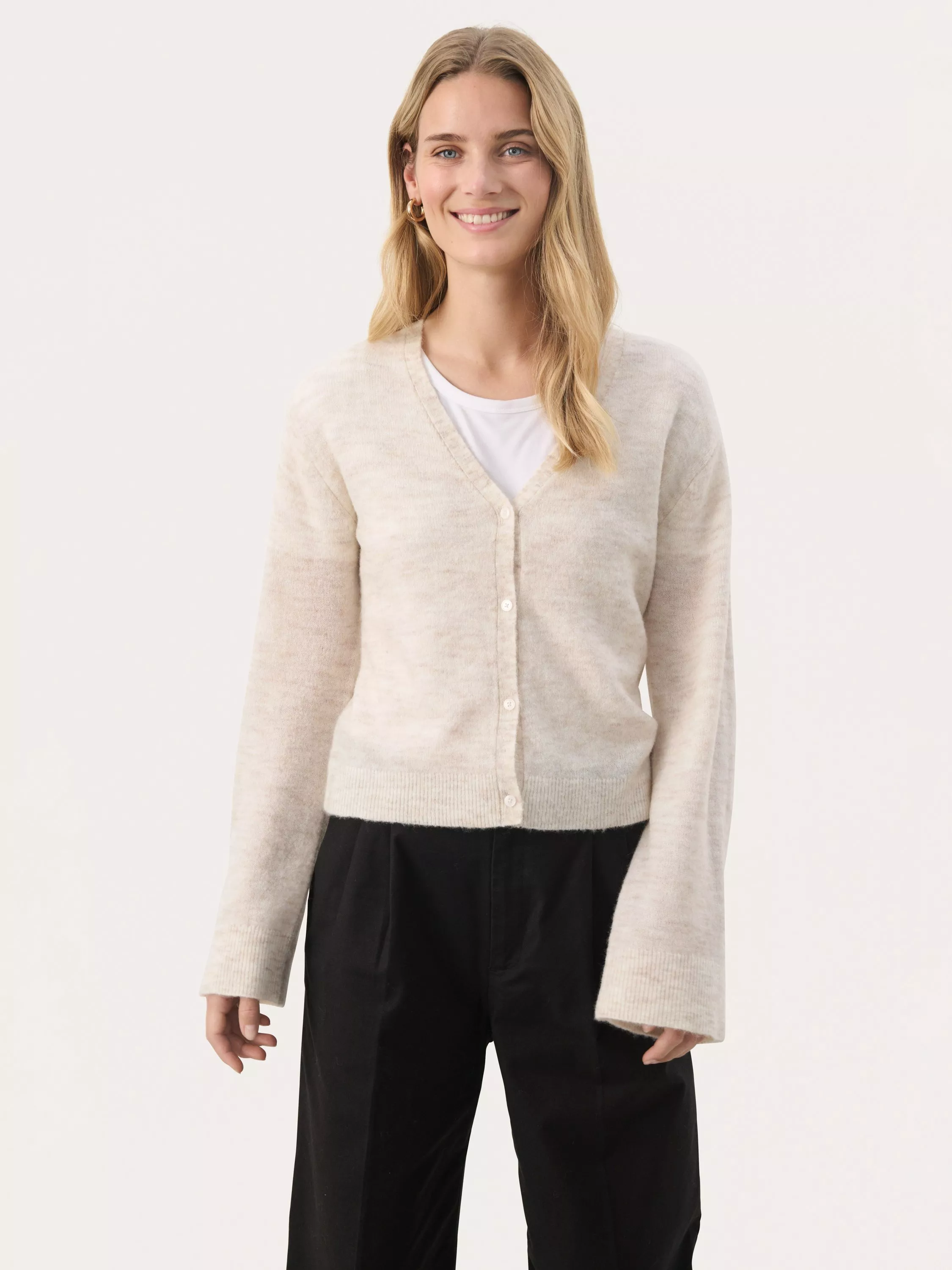 This Peytons cardigan is a delicate and versatile addition to any wardrobe. The V-neckline and button-down front create a classic, feminine silhouette, while the lightweight knit ensures comfort throughout the day. Perfect for layering over a simple top or dress, it adds a touch of warmth and elegance to your outfit.