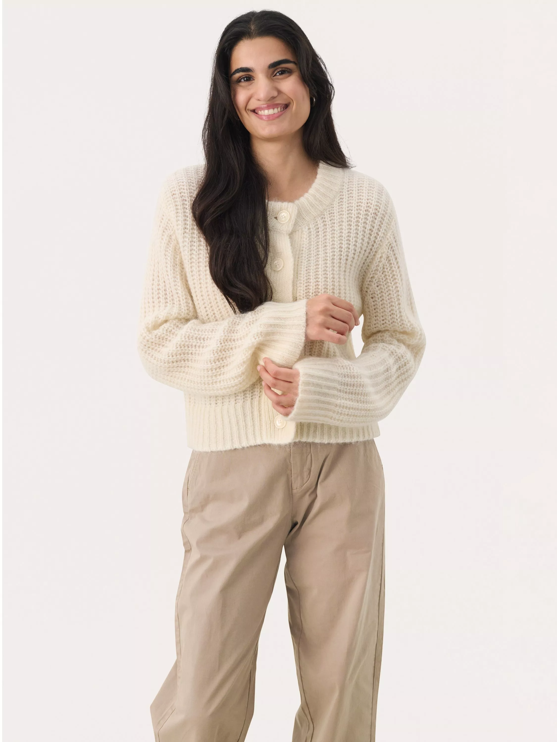 This Pirette cardigan is a cosy essential, featuring a textured knit and button-down front. The cropped length adds a modern touch to its classic design, making it perfect for layering over dresses or pairing with high-waisted trousers. Ideal for staying warm while maintaining a chic, refined look.