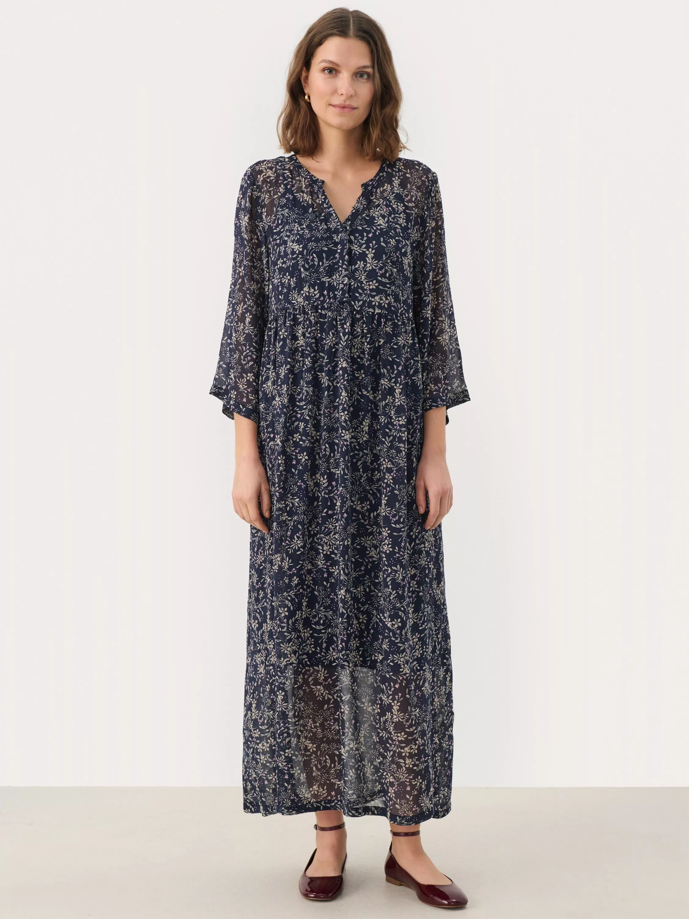 This Polonia dress is perfect for both casual and festive occasions. With its loose fit, V-neck, and light, sheer fabric, it creates an airy look. Style it with sandals for a relaxed vibe or add heels for evening wear.