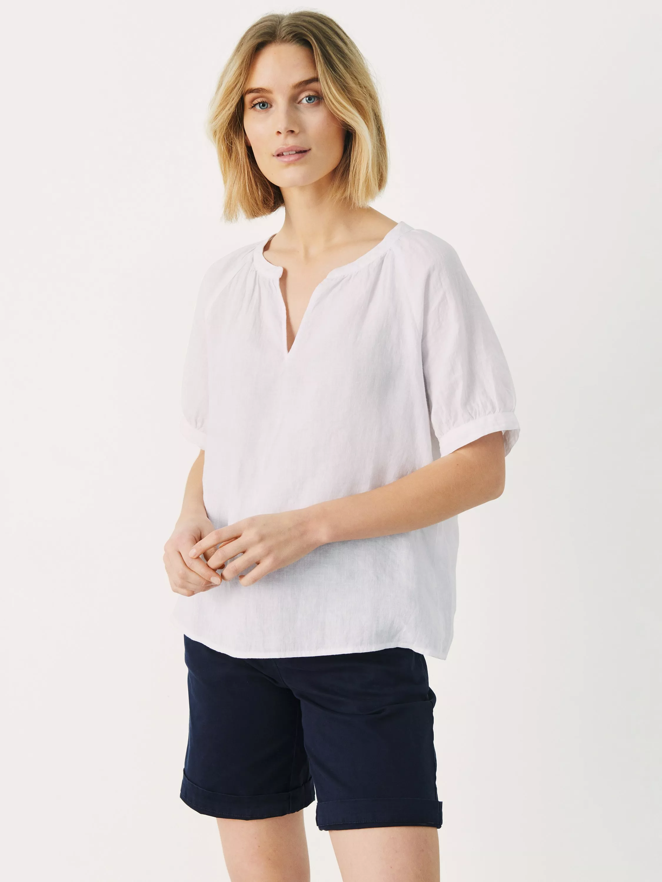 Framed with a v-neckline and elbow length sleeves, it is made from pure linen, offering breathable comfort and is a staple for warmer weather.