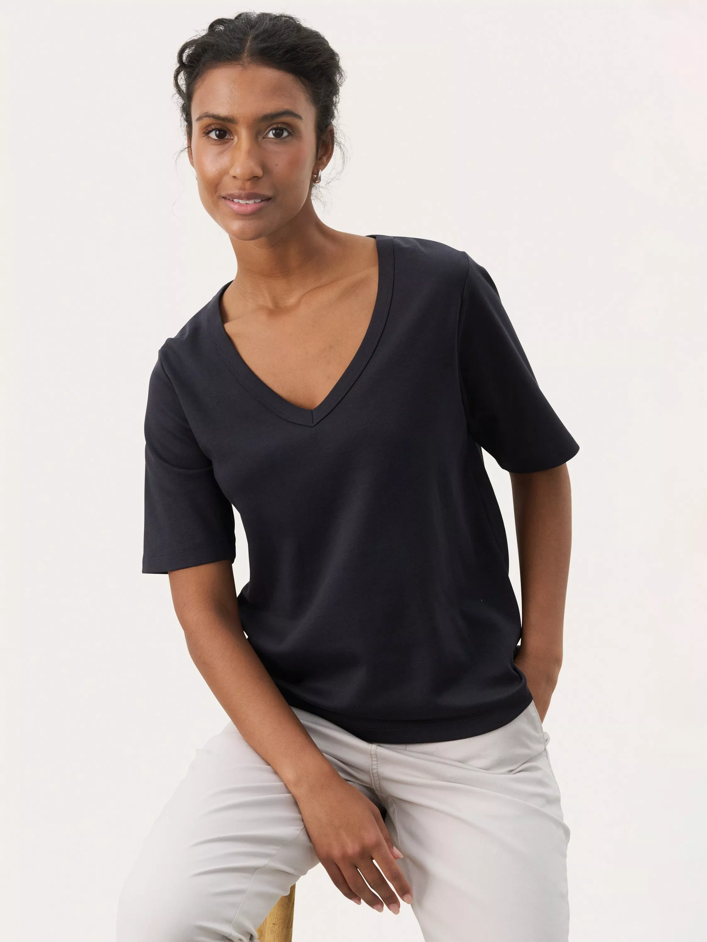 An organic cotton V-neck T-shirt that brings easy comfort and smart style to busy days. Light, breathable fabric keeps you cool, while the simple cut pairs well with anything.