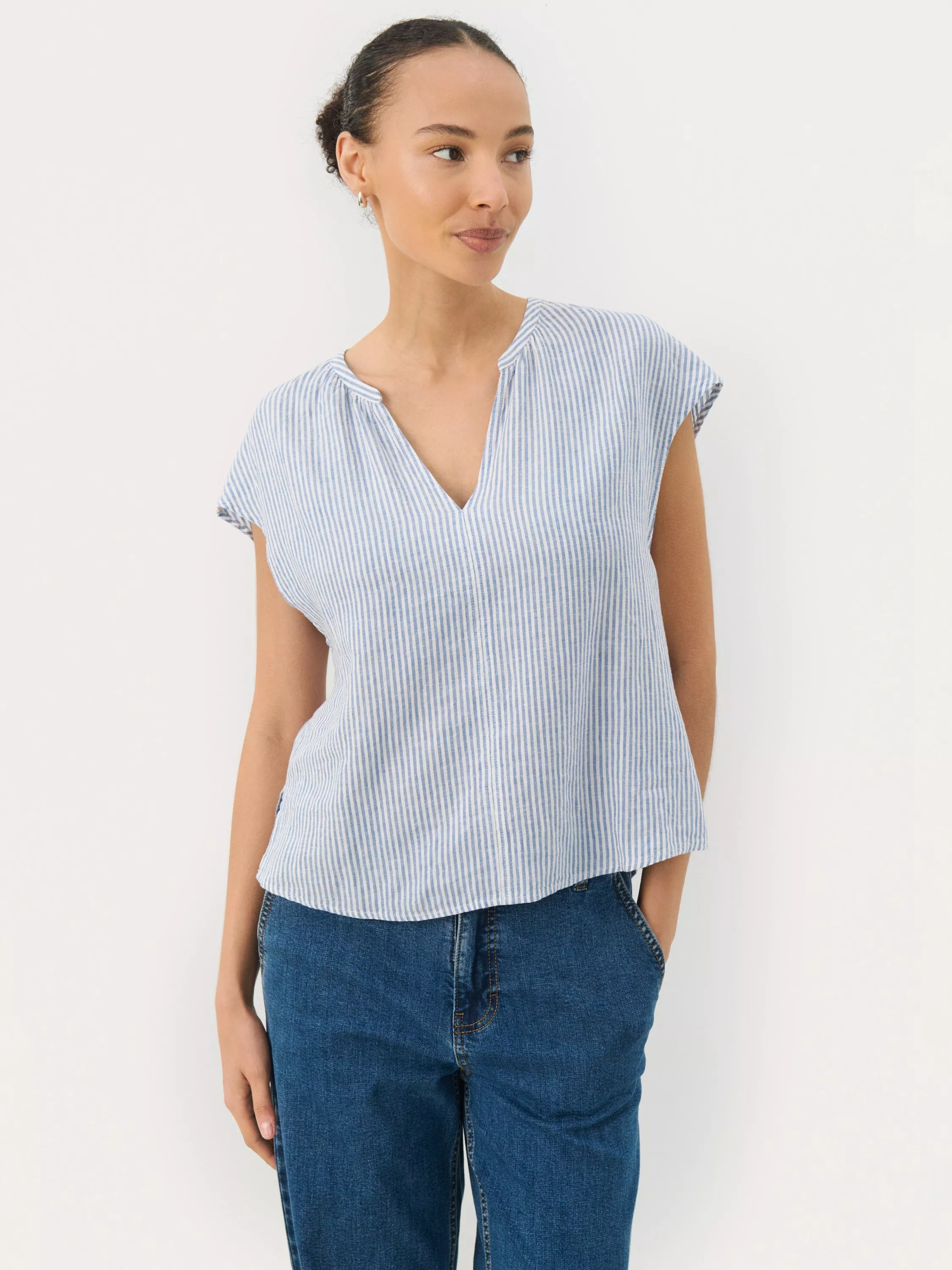 Part Two's linen blend blouse keeps you cool and comfortable, whether exploring the city or meeting friends. Breezy stripes and a relaxed v-neck bring a fresh twist to your summer days.