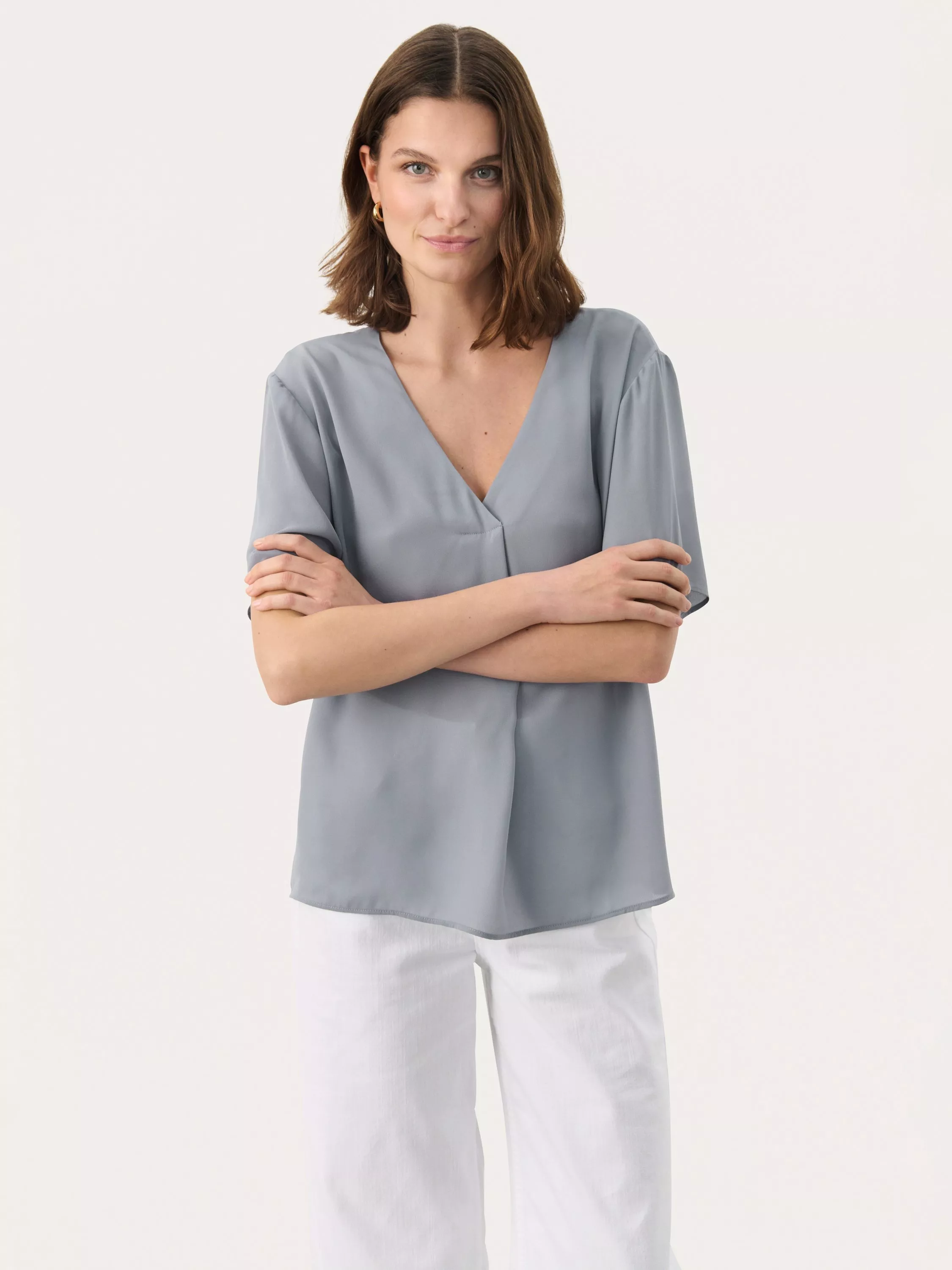 Part Two's blouse features a relaxed V-neck and easy short sleeves that keep you comfortable whether at work or play.