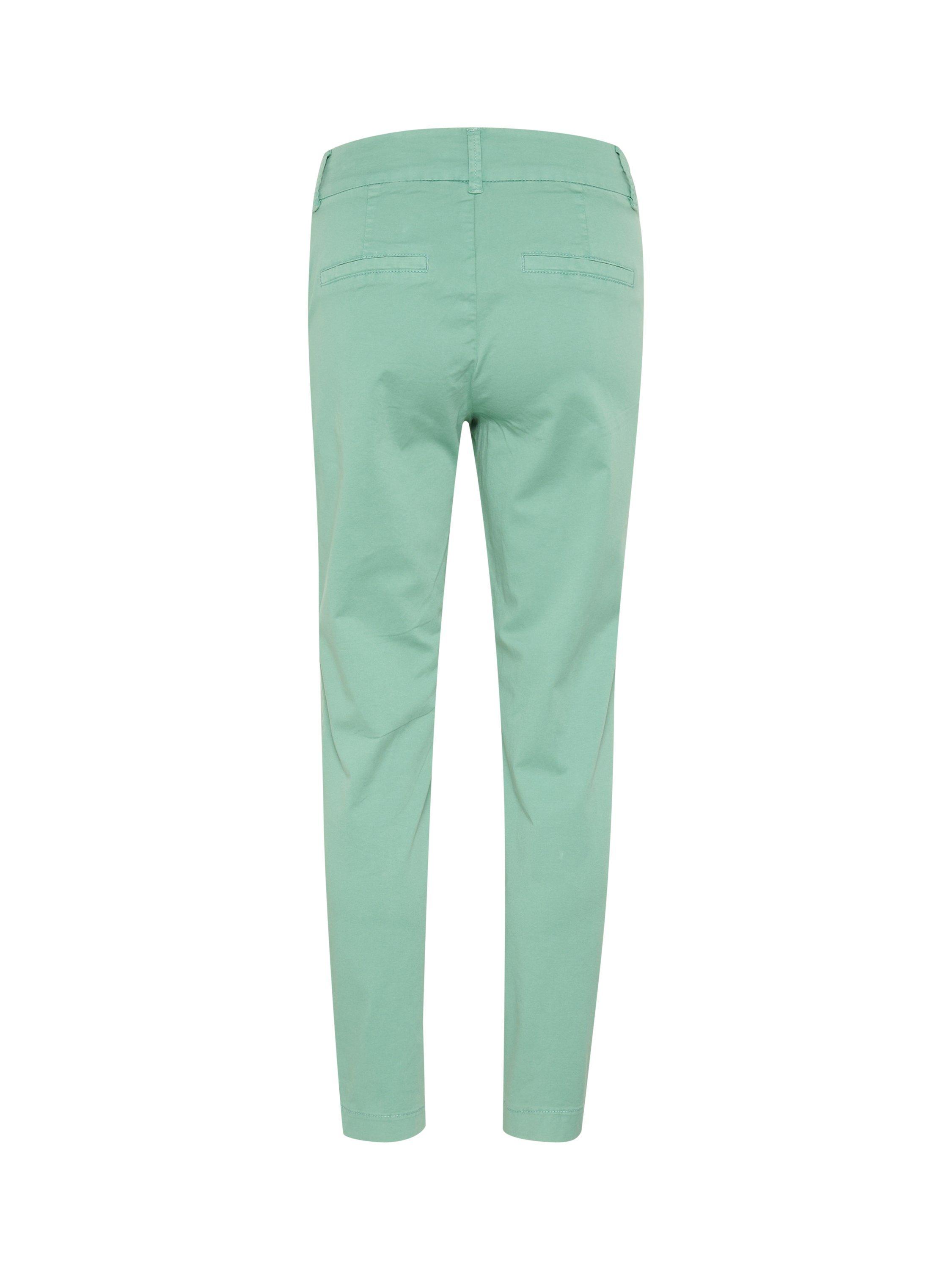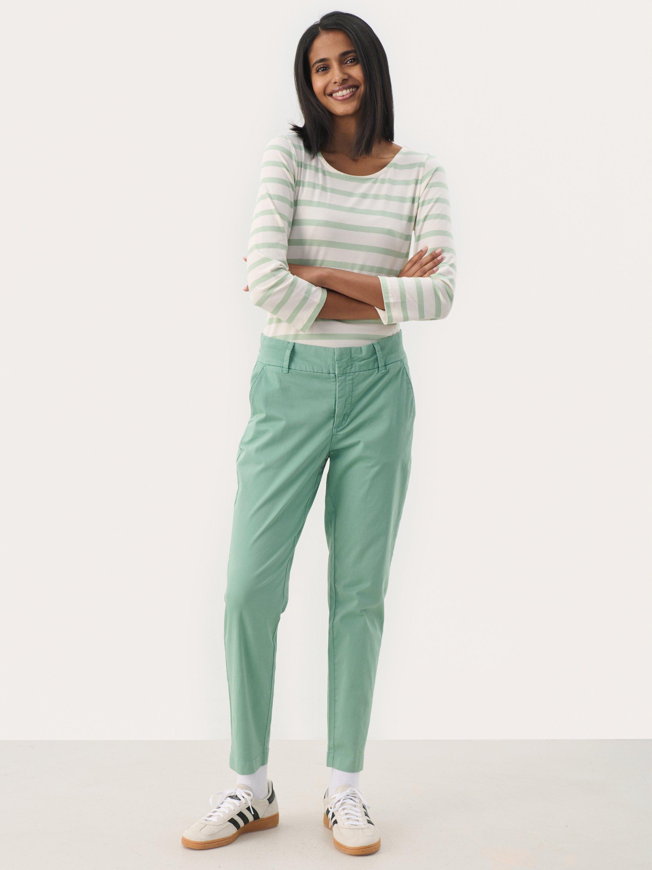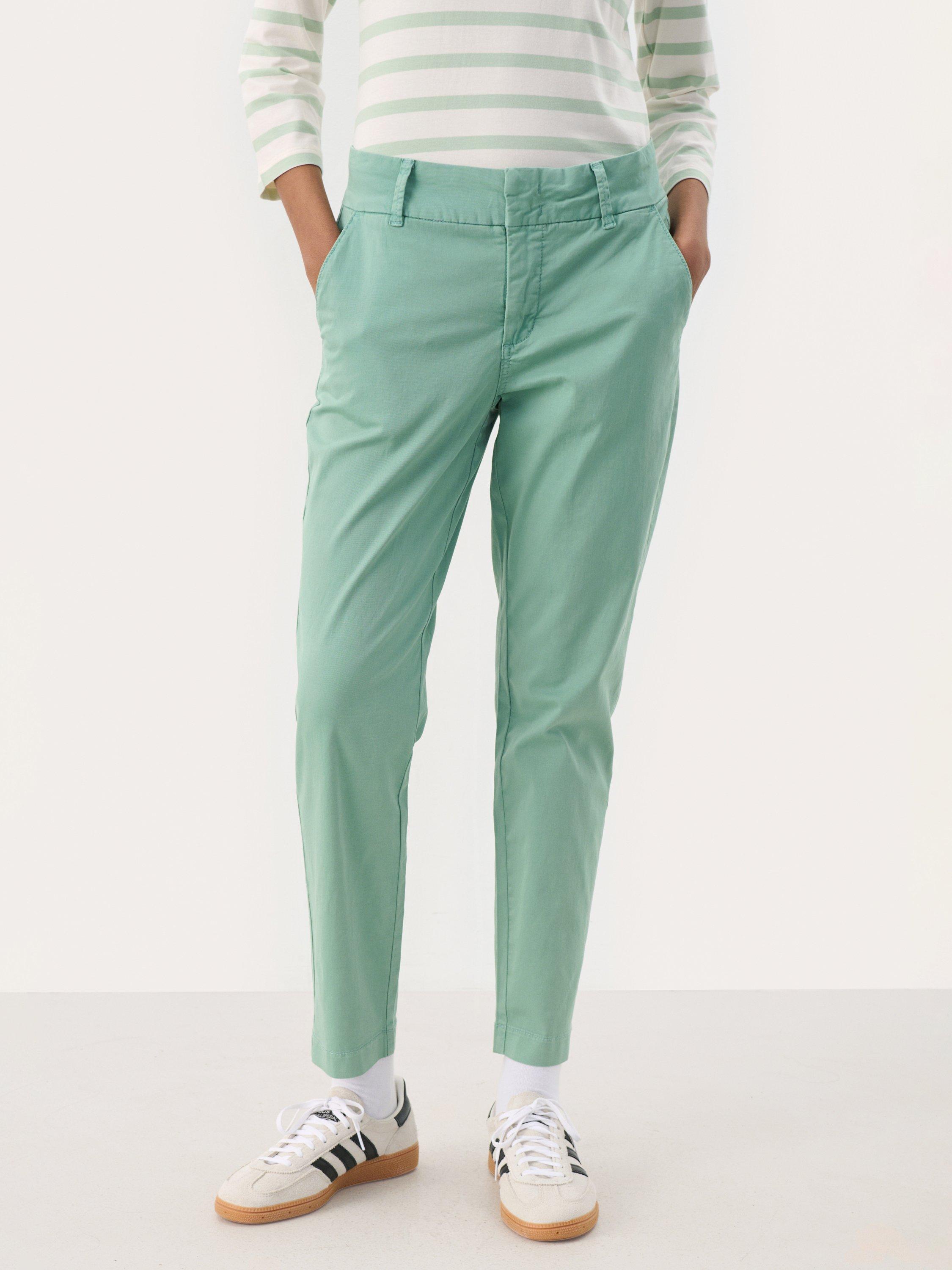 The Soffys trousers are a simple and classic pair of chinos. They are cropped below the calves and they have a slim fit. The trousers are high-waisted with a wide waistband, and they are fastened with a zipper and hook and bar. At the back they have jetted pockets, and on the front the pockets are oblique.