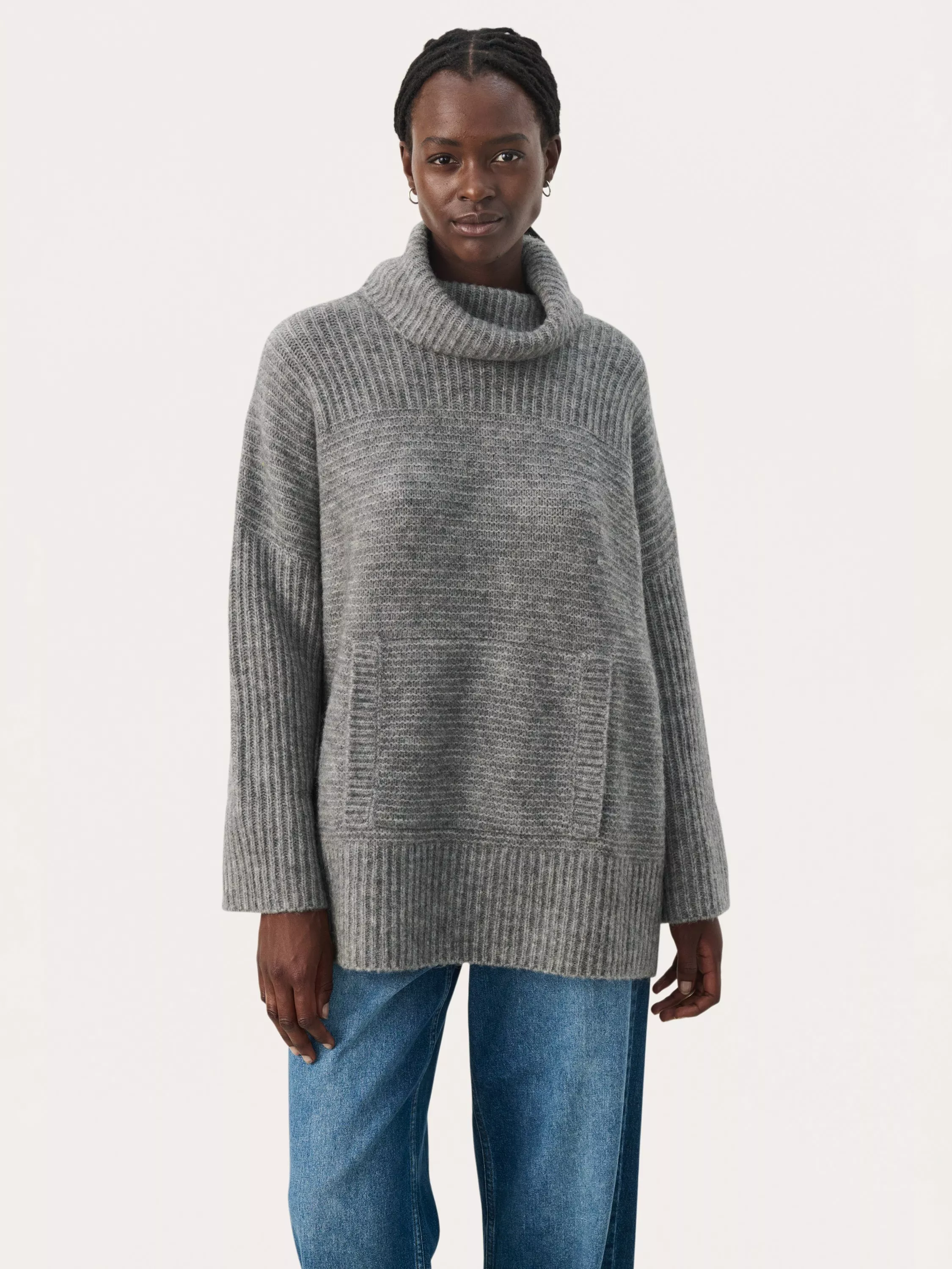 The Toccas poncho is the softest and cosiest style of the season. It has a loose rollneck and an oversized fit, and it is made in a fuzzy rib knit with opposite stripes. The sleeves are long and wide, and the pullover has a kangaroo pocket and is cut below the hips.