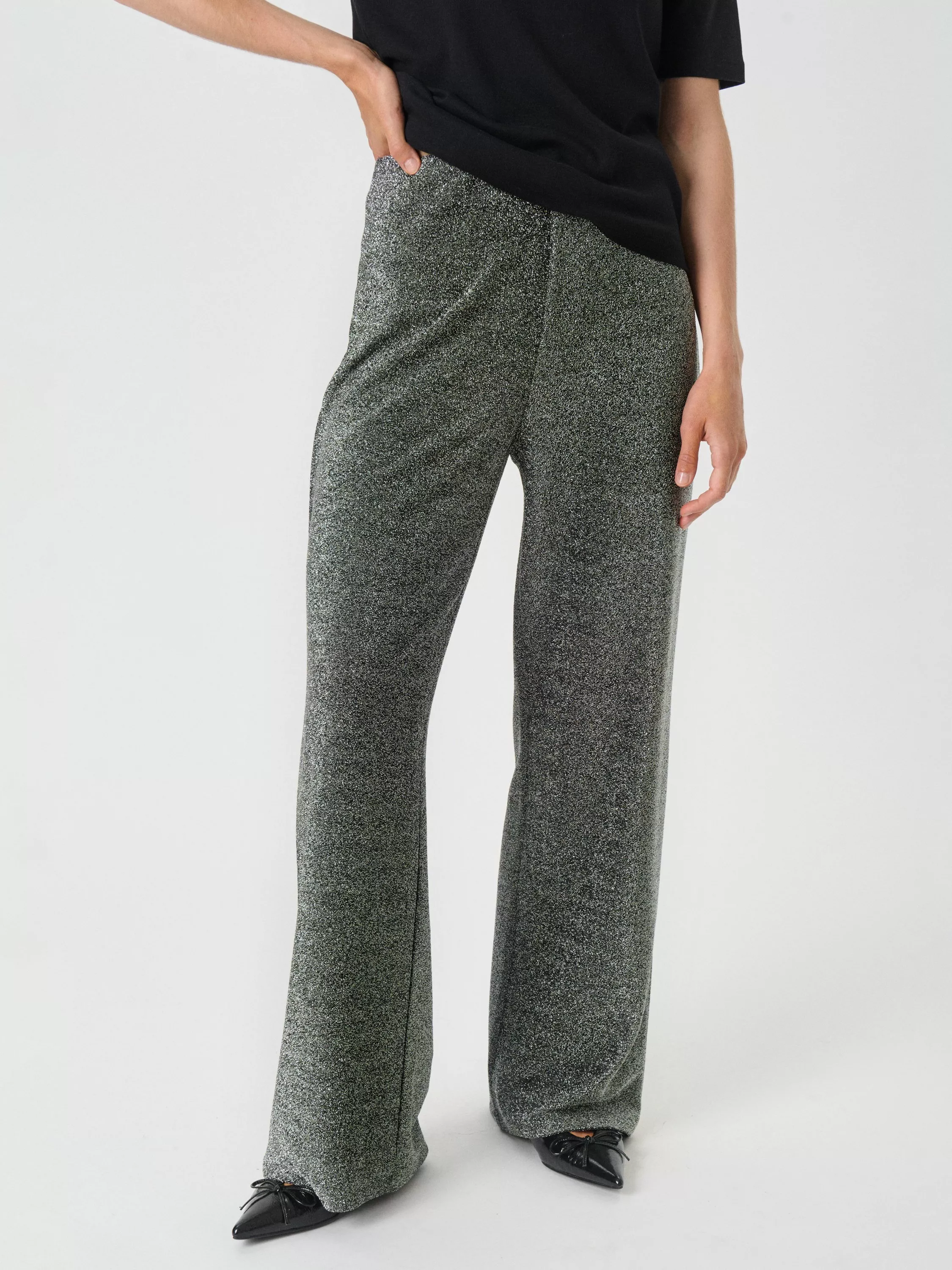A pair of balanced straight leg trousers by Part Two with a subtle shimmer finish. This style is cut to sit higher on the hips with an elasticated waist and longer length hems.
