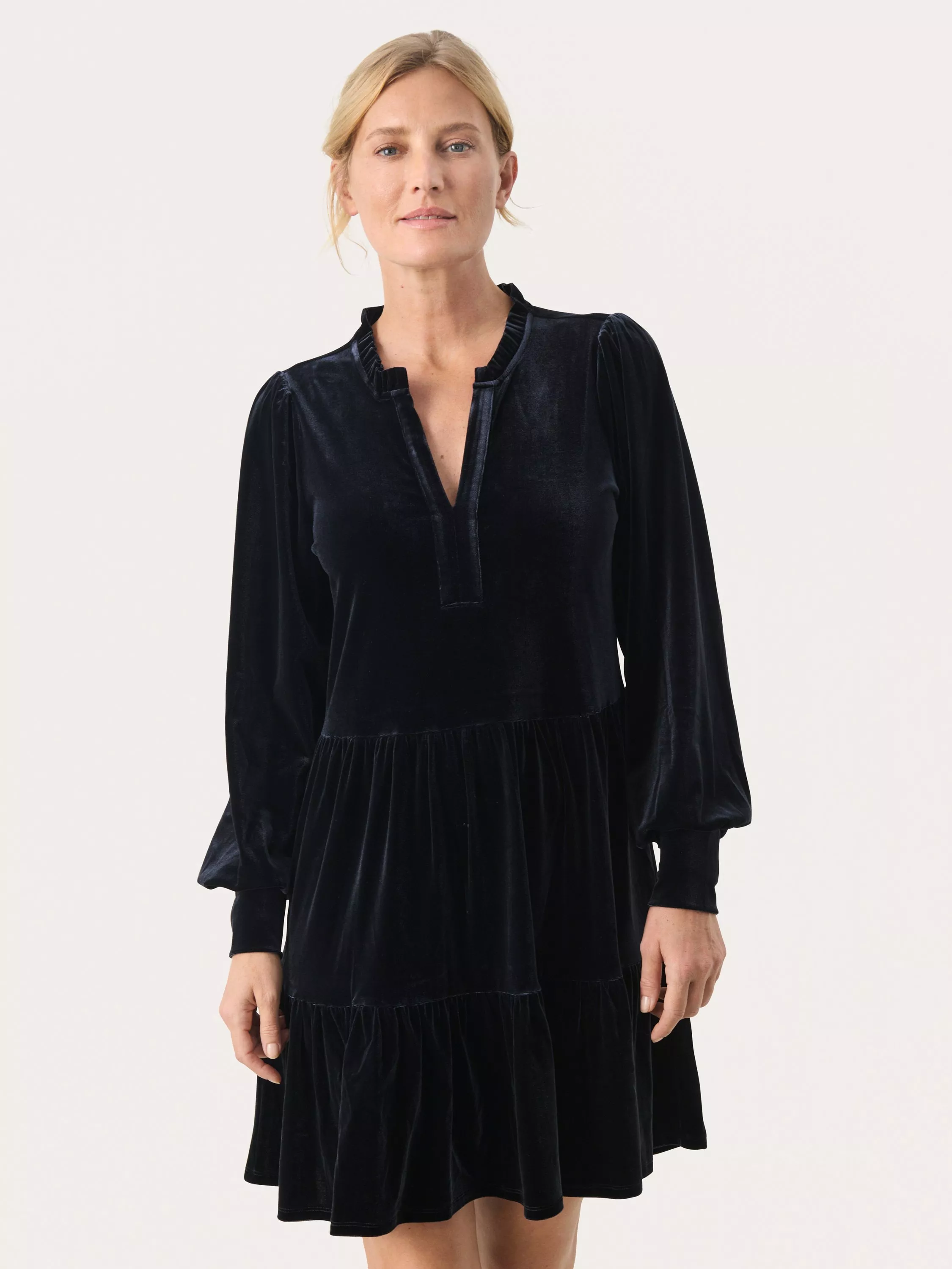 The Viggase dress is a flattering dress in a soft velvet fabric. It is cut above the knees and has a relaxed fit with flared tiers. The sleeves are long and loose-fitting and they are gathered in an elastic cuff. The dress has a V-notch neck with a frilled mandarin collar.