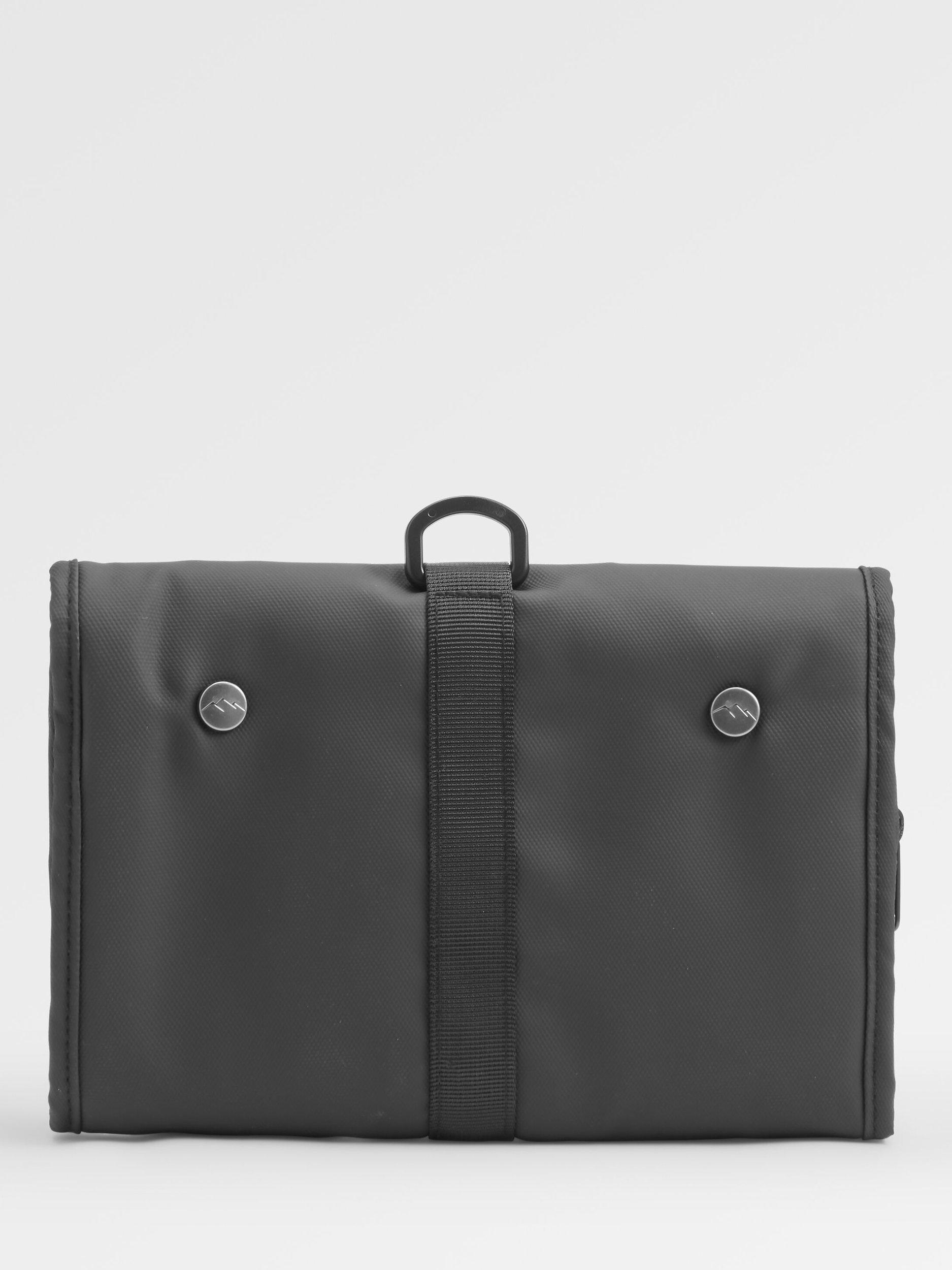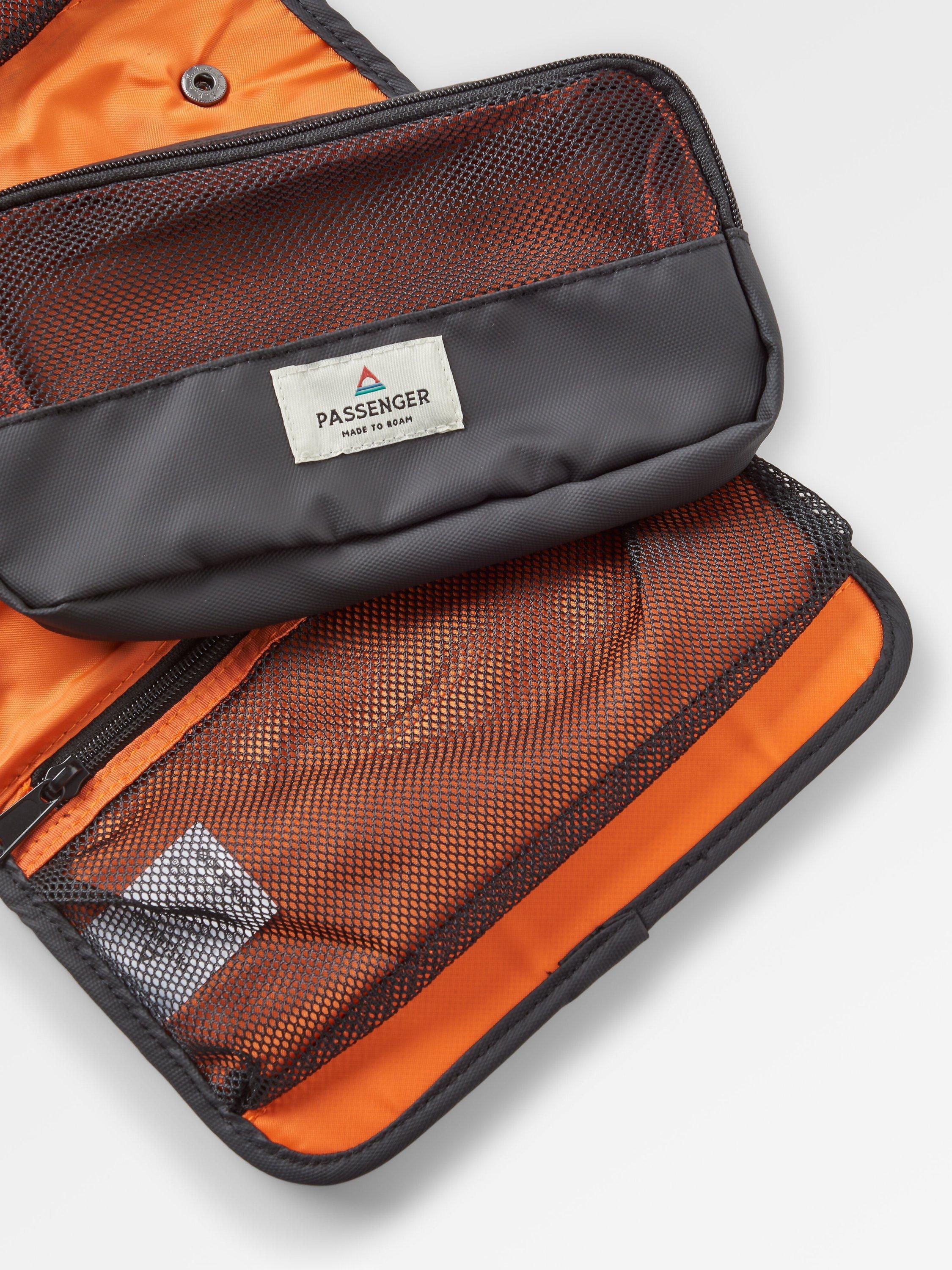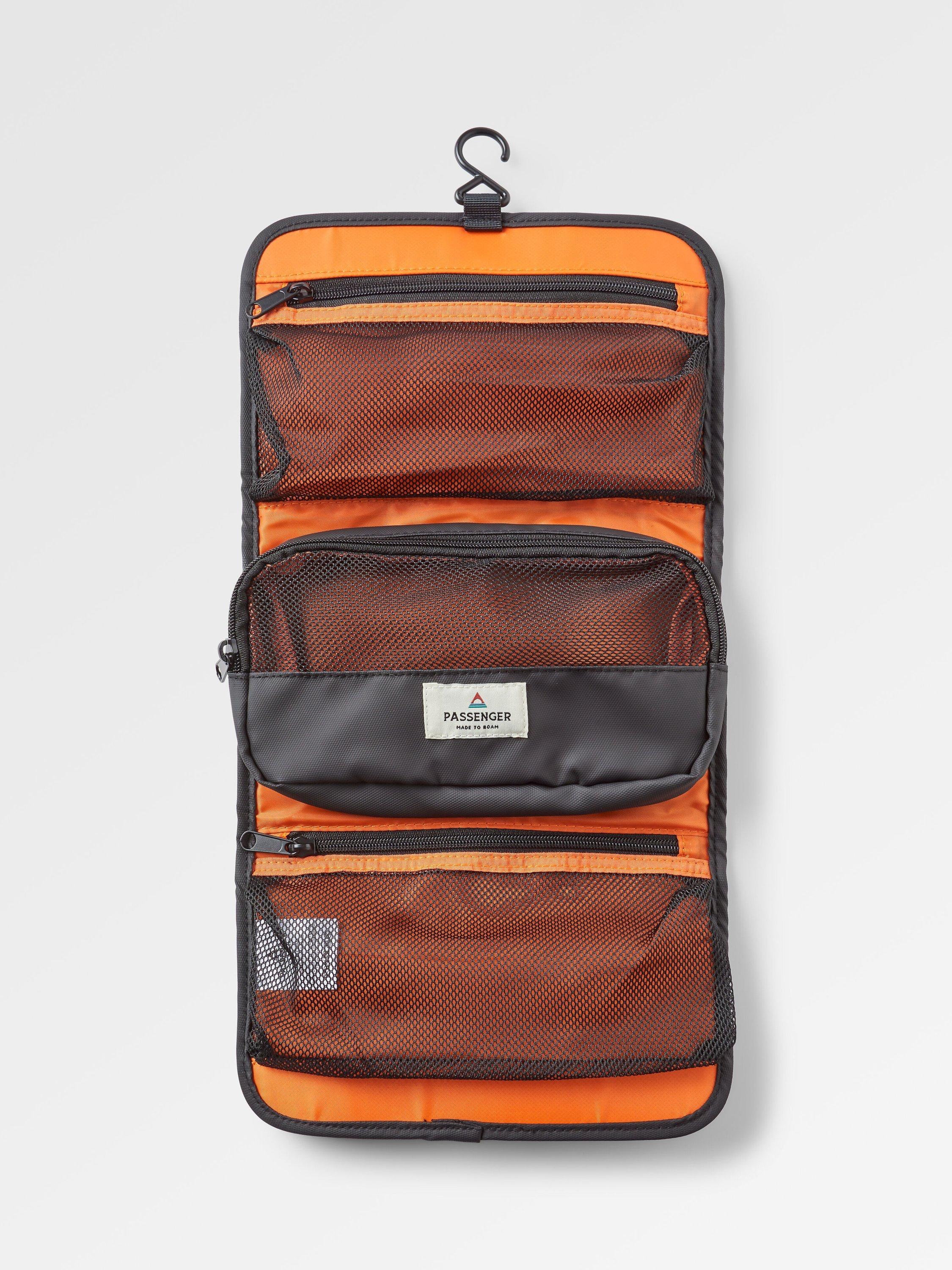 The perfect van or camping trip accessory, the Drop wash kit is a three-compartment drop-down with a hanger and carry handle. Inspired by road trips and travel.