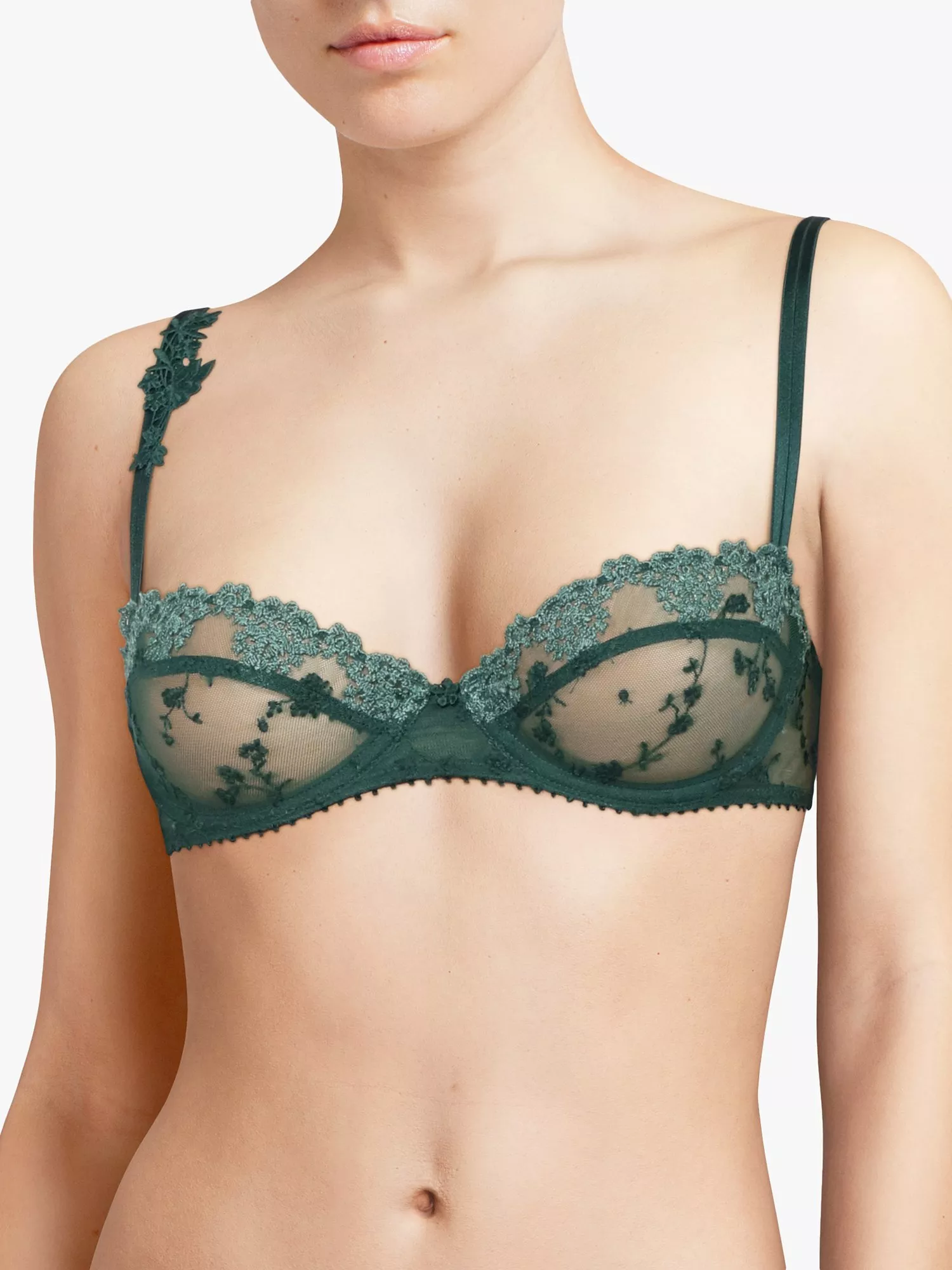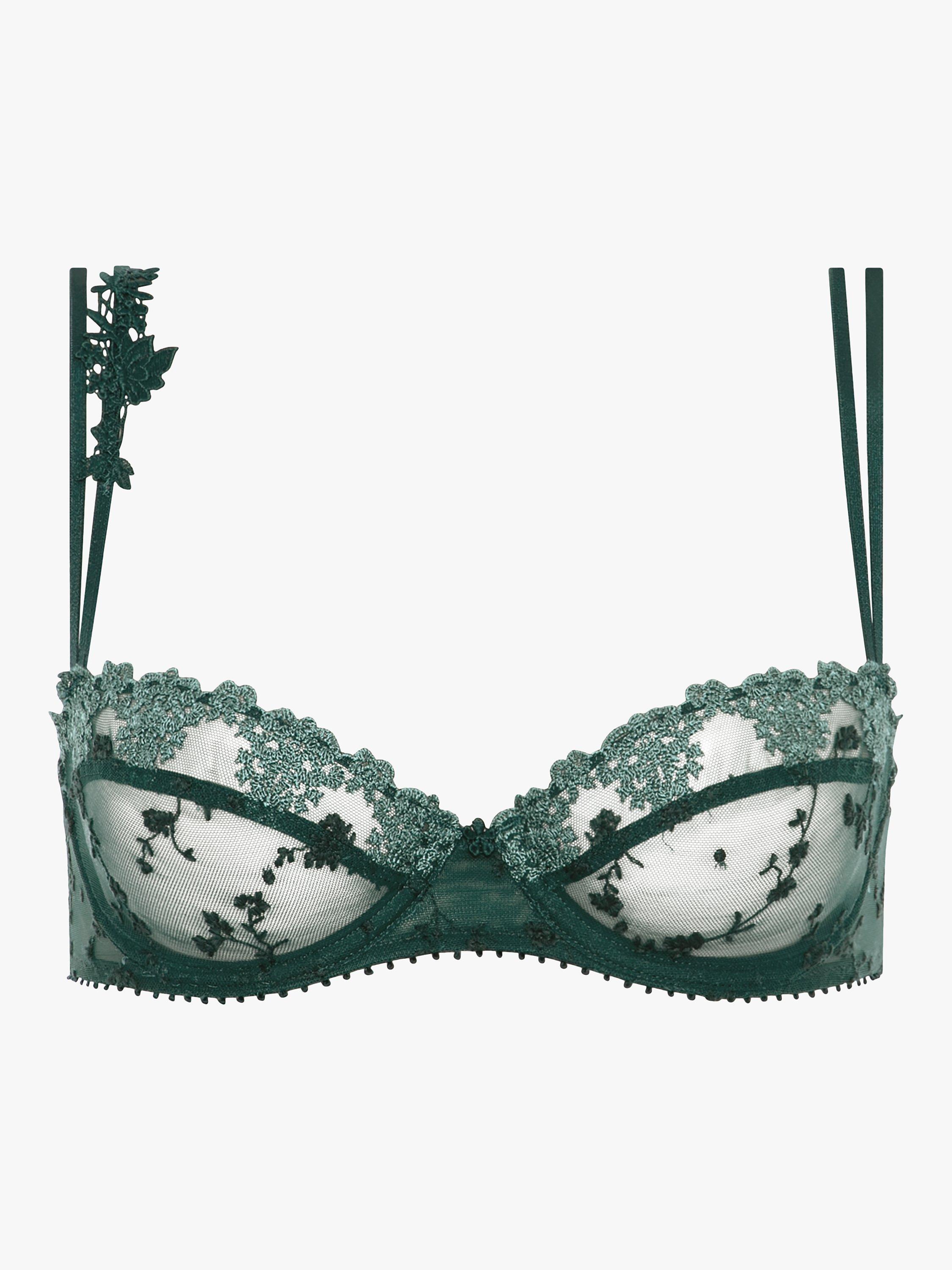 Beautifully ornate, the White Nights balconette bra from Passionata has embroidered tulle, a scalloped neckline and double straps decorated with guipure lace at the shoulder. It has an uplift effect and transparent cups that create a seductive overall look.