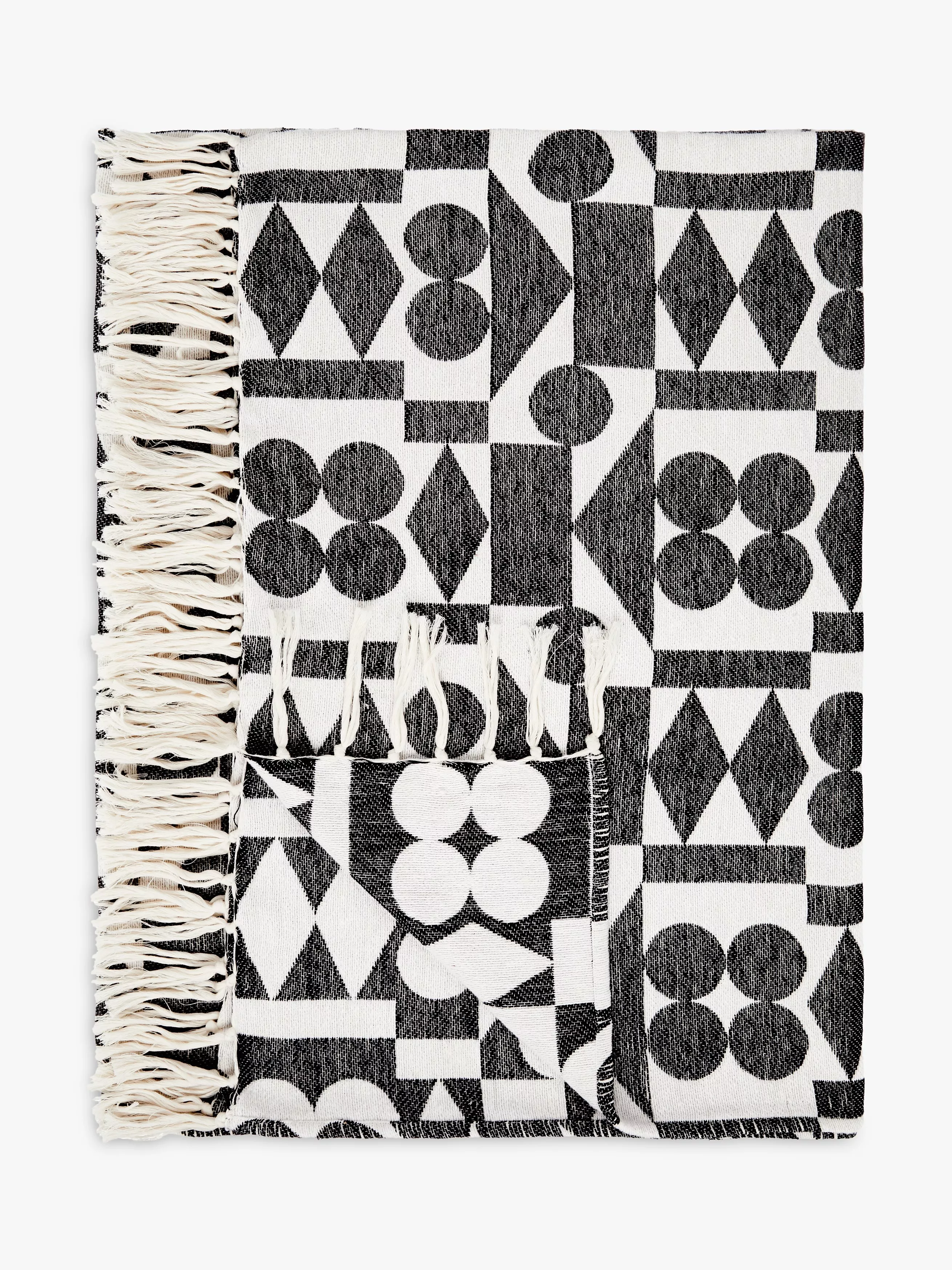 A monochrome weave throw with a long, tasseled fringe.