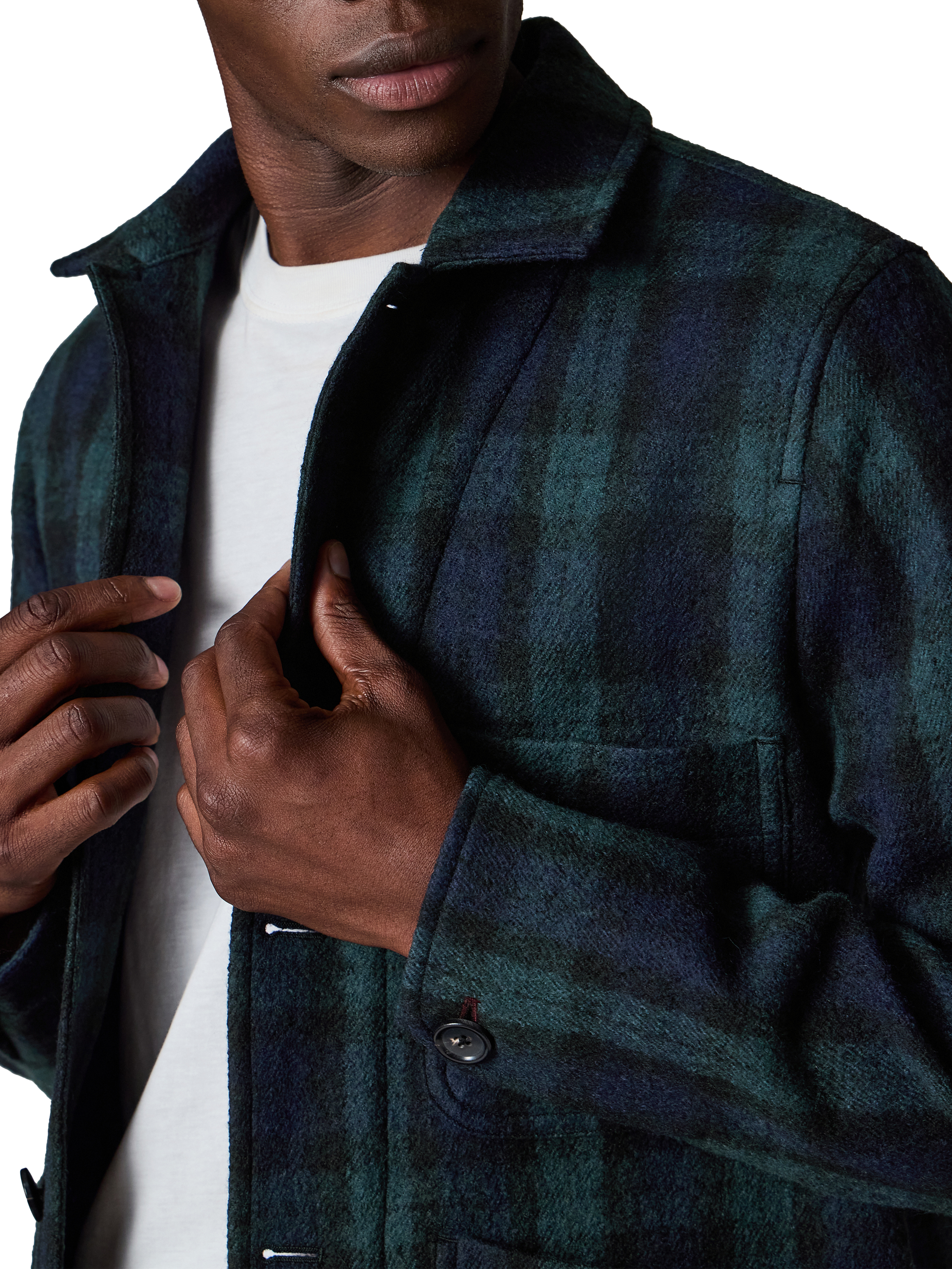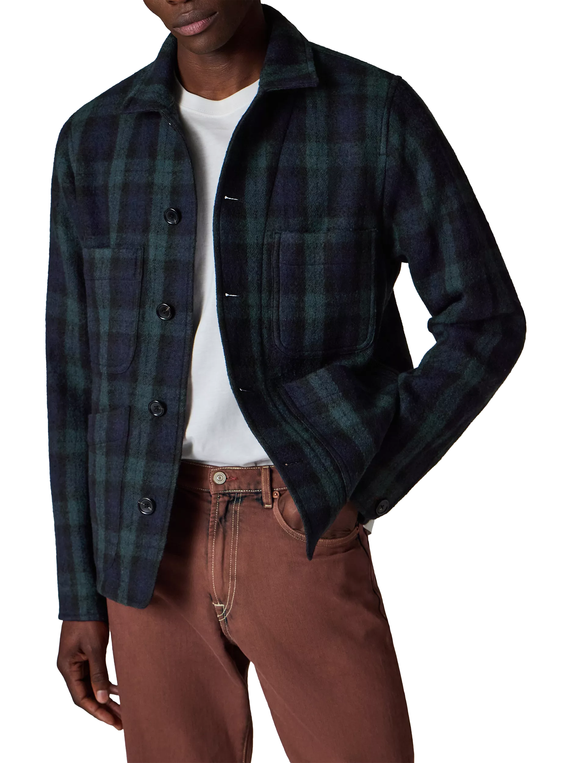 This chore jacket makes the perfect layer over a t-shirt during spring or autumn months. Made from wool plaid, it features front and chest patch pockets.