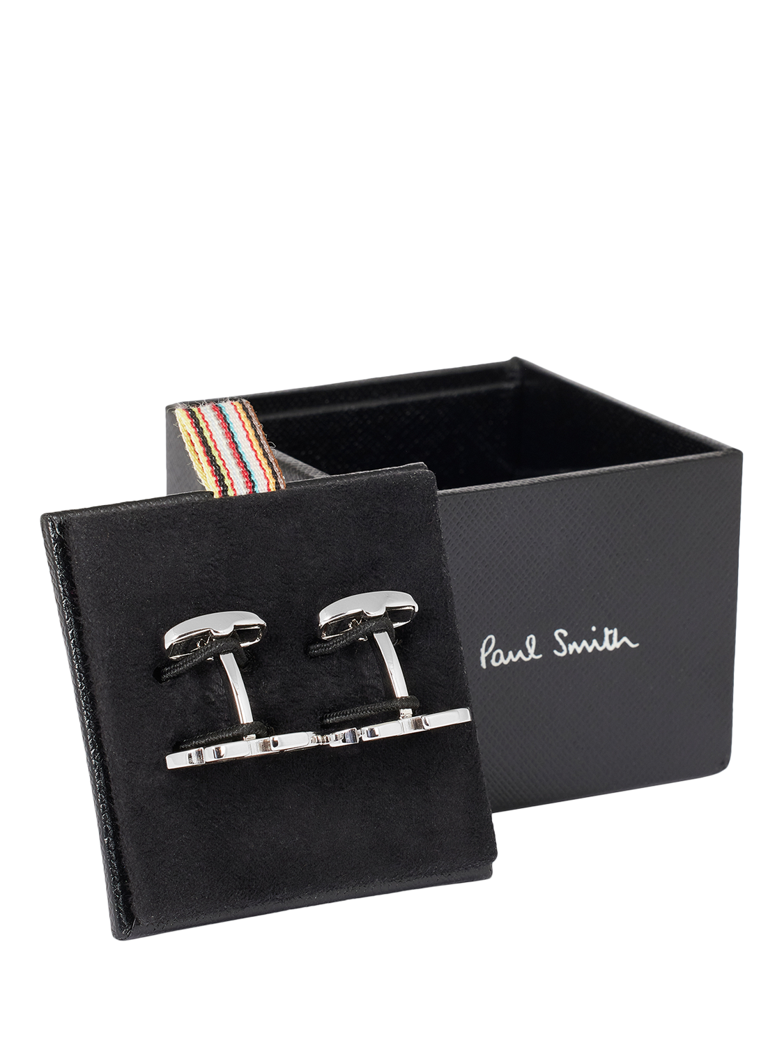 Add the finishing touch to your outfit with these cufflinks. Complete with a polished silver finish, Paul Smith signature embossed T-bar fastenings, and are presented in a black gift box.