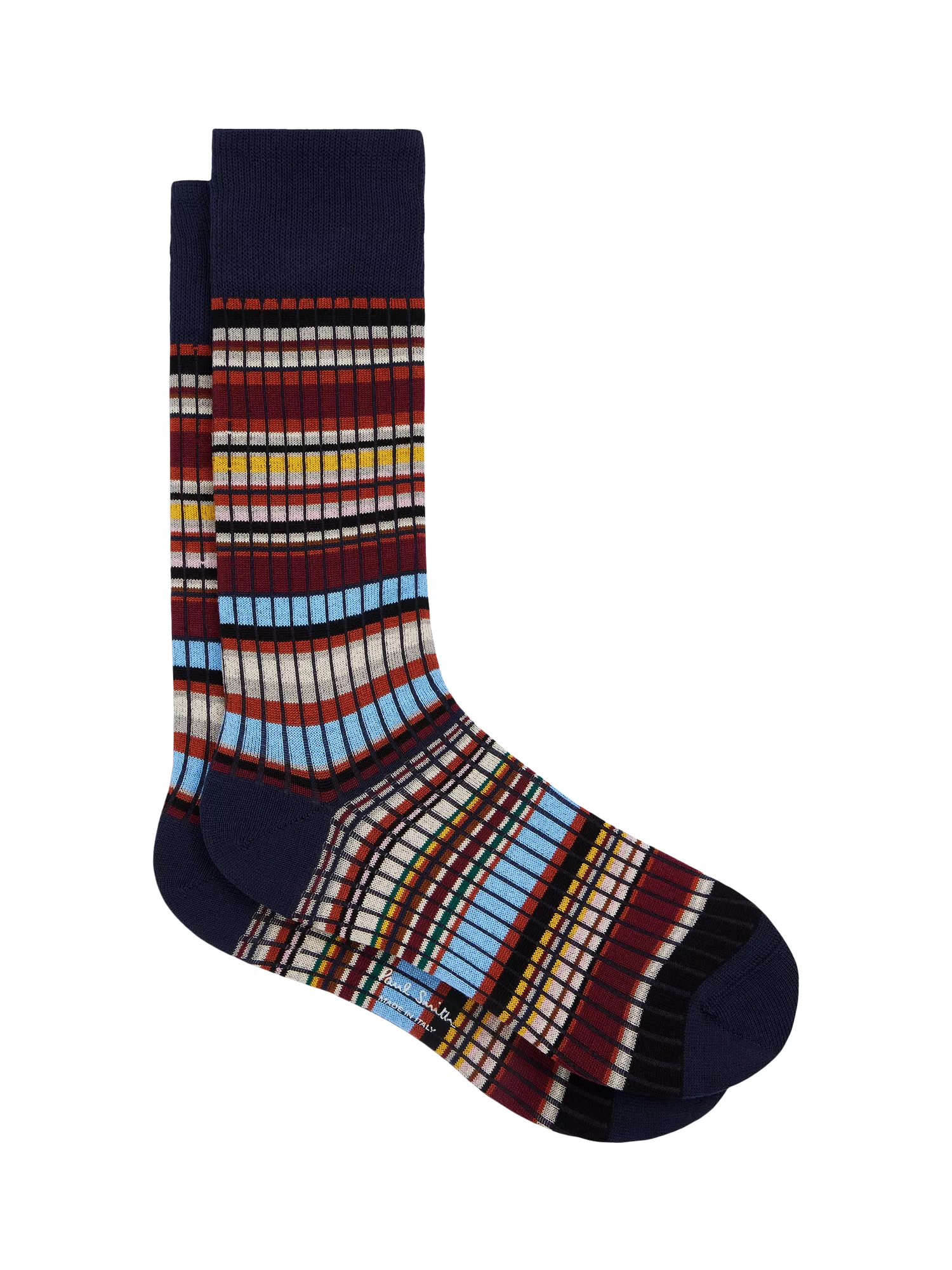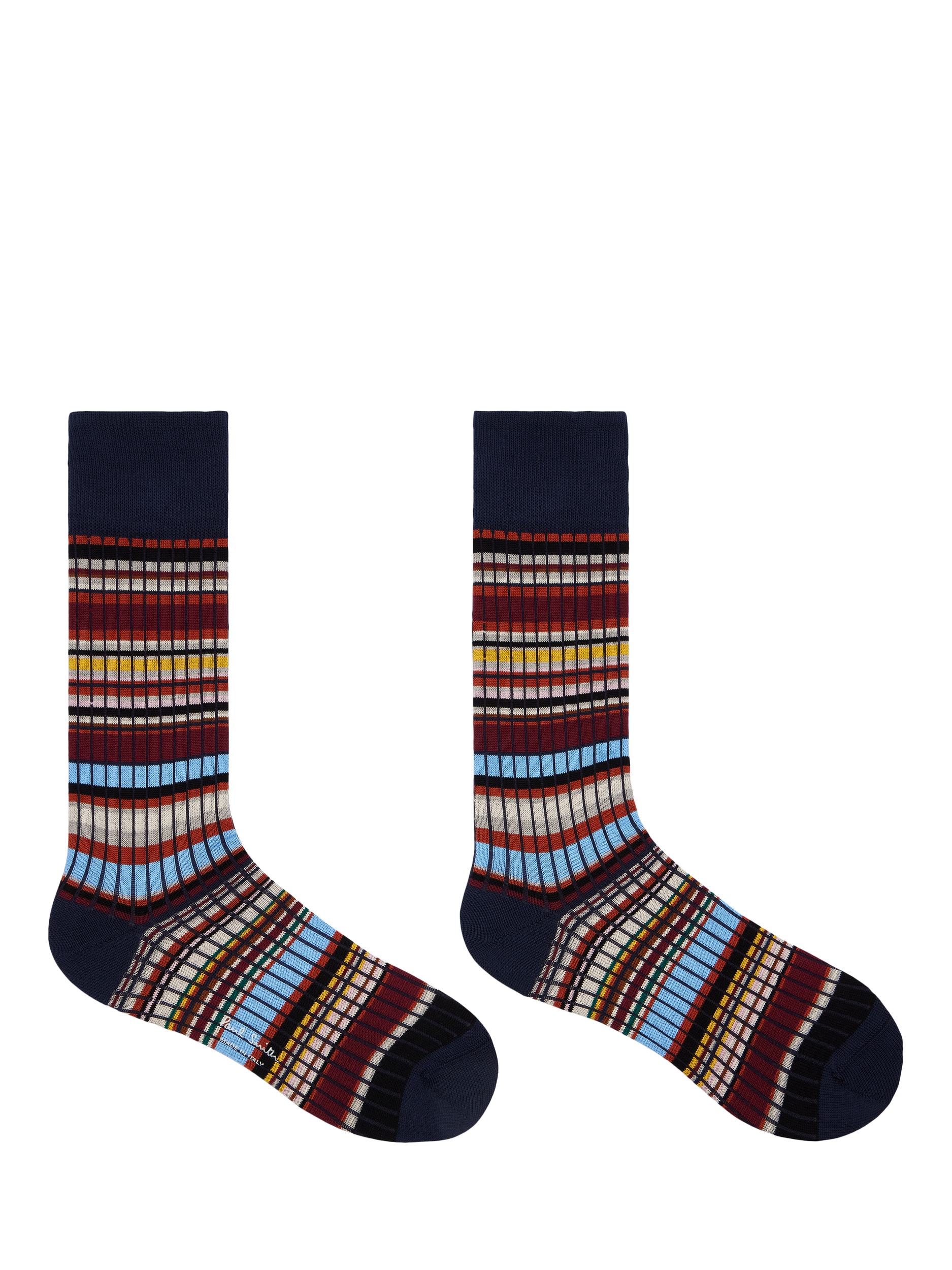 A pair of ribbed multi-stripe socks by Paul Smith. Crafted from a smooth cotton blend, they're made to stay comfortable from morning meetings to late evenings.