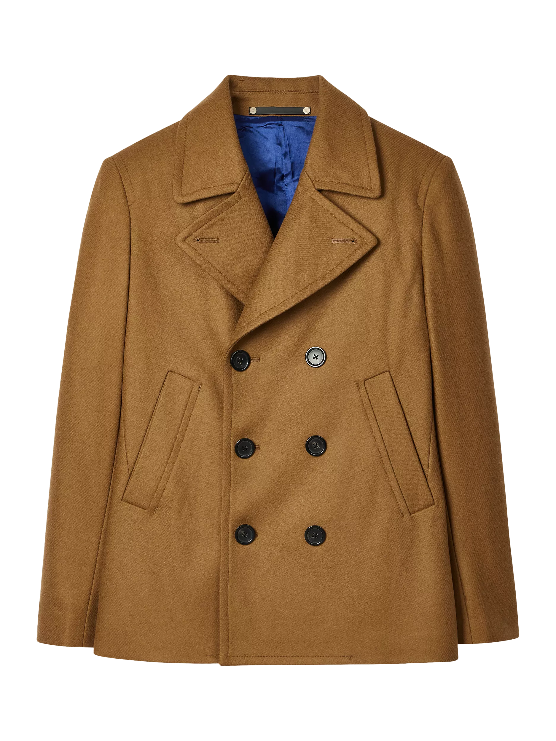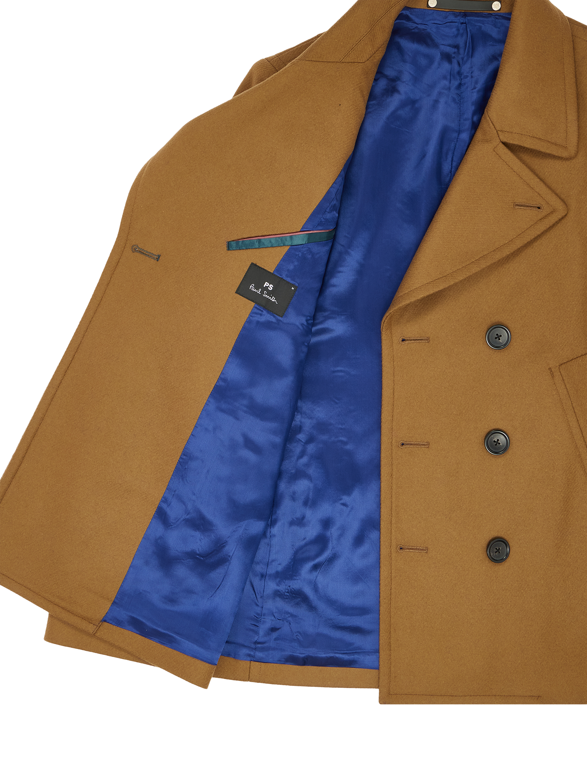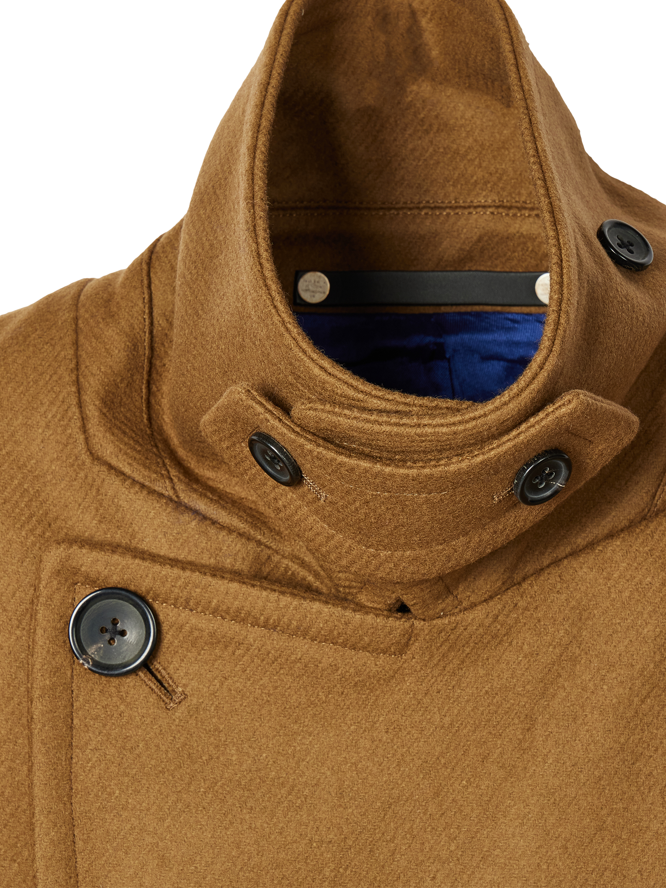 This wool blend overcoat has a collar that can be fastened into a funnel neck on colder days and comes with two slant pockets.