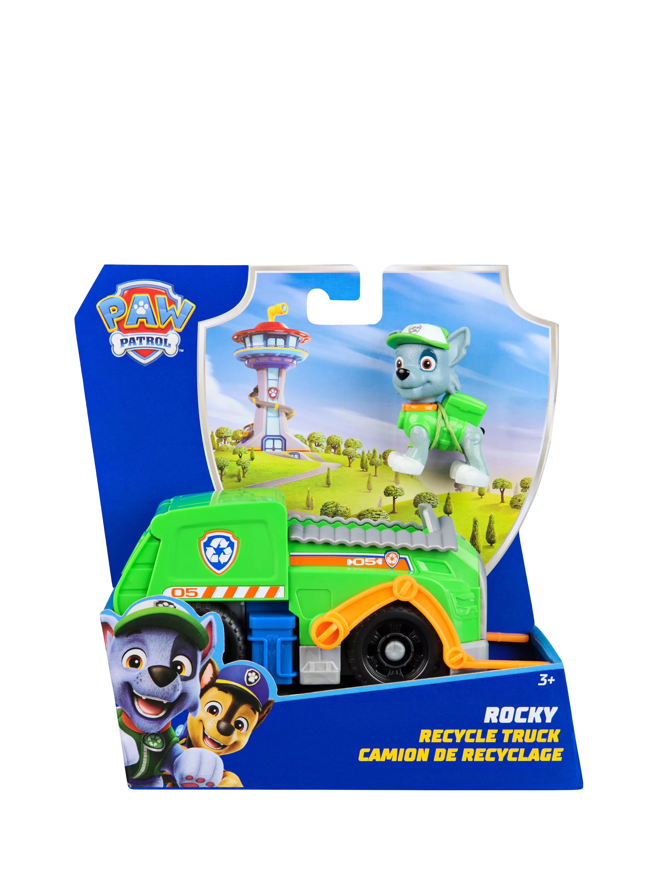Rocky and his toy vehicle are made from at least 80% pre-consumer recycled plastic. Team up with all of the PAW toy figures and their rescue vehicles (each sold separately) and help save the day in Adventure Bay.