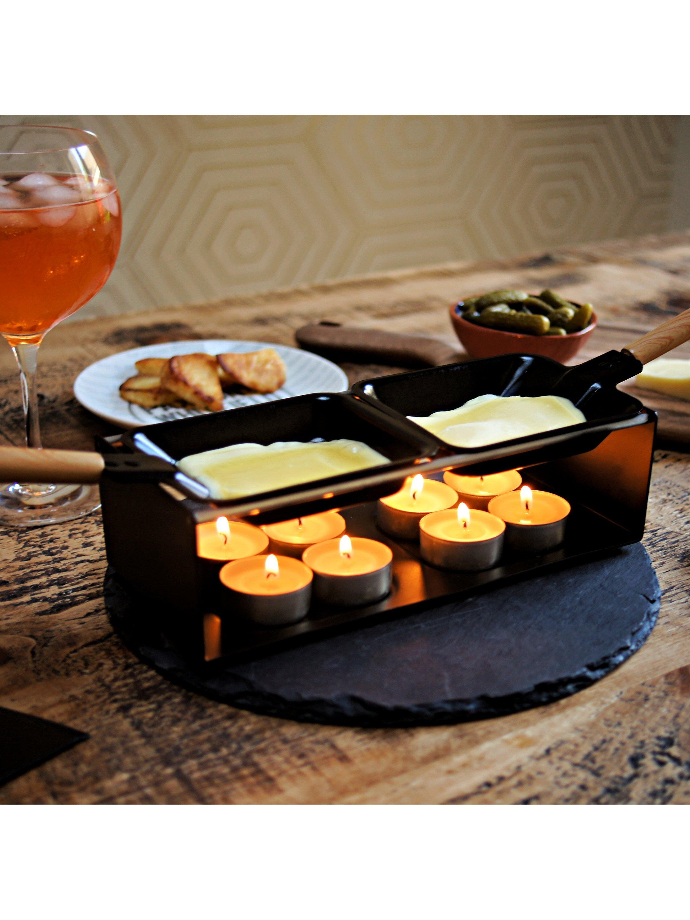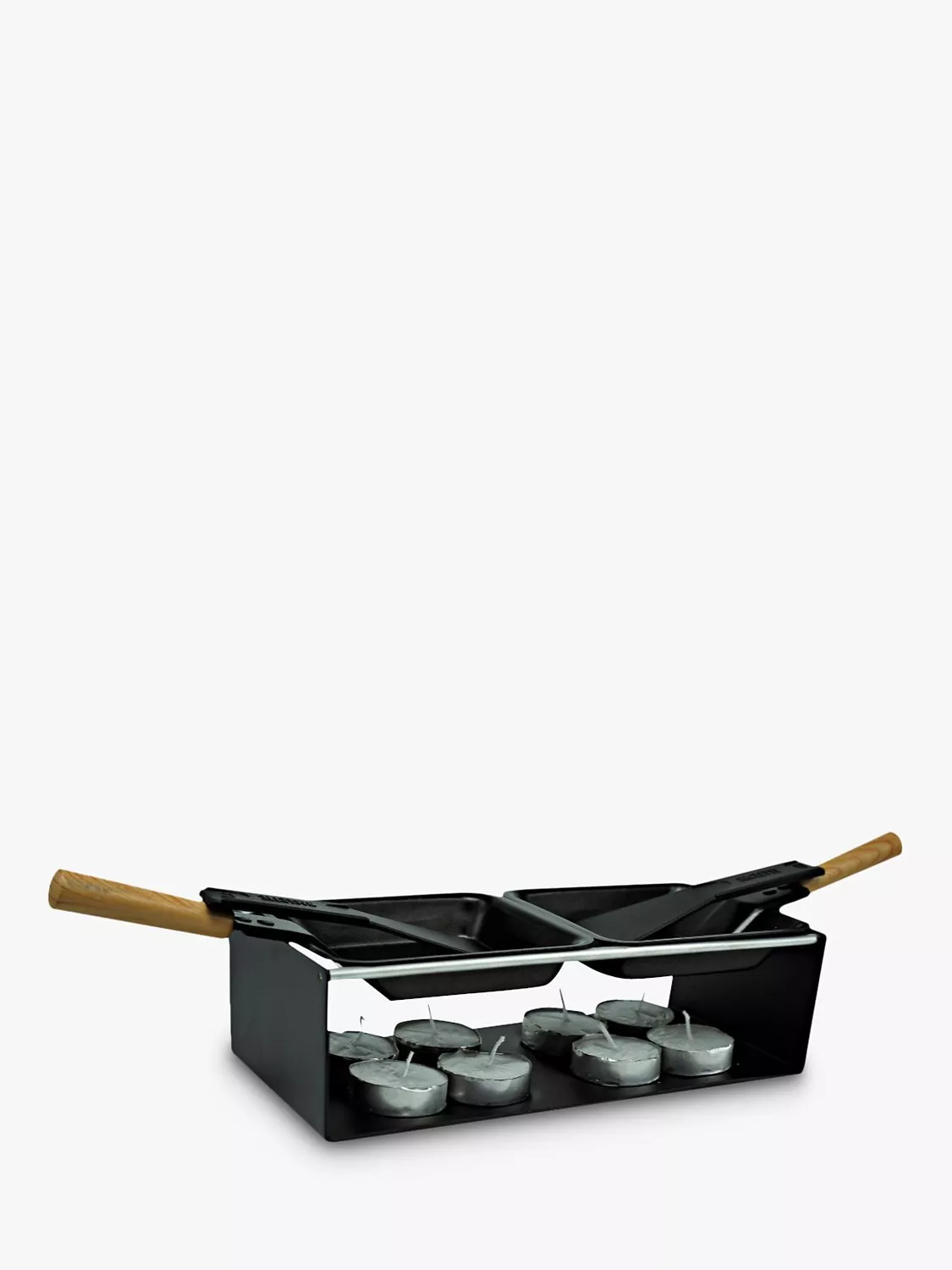 Fun and easy to use, this giftable social dining set contains two raclette pans, two spatulas, a stand and eight tealights.