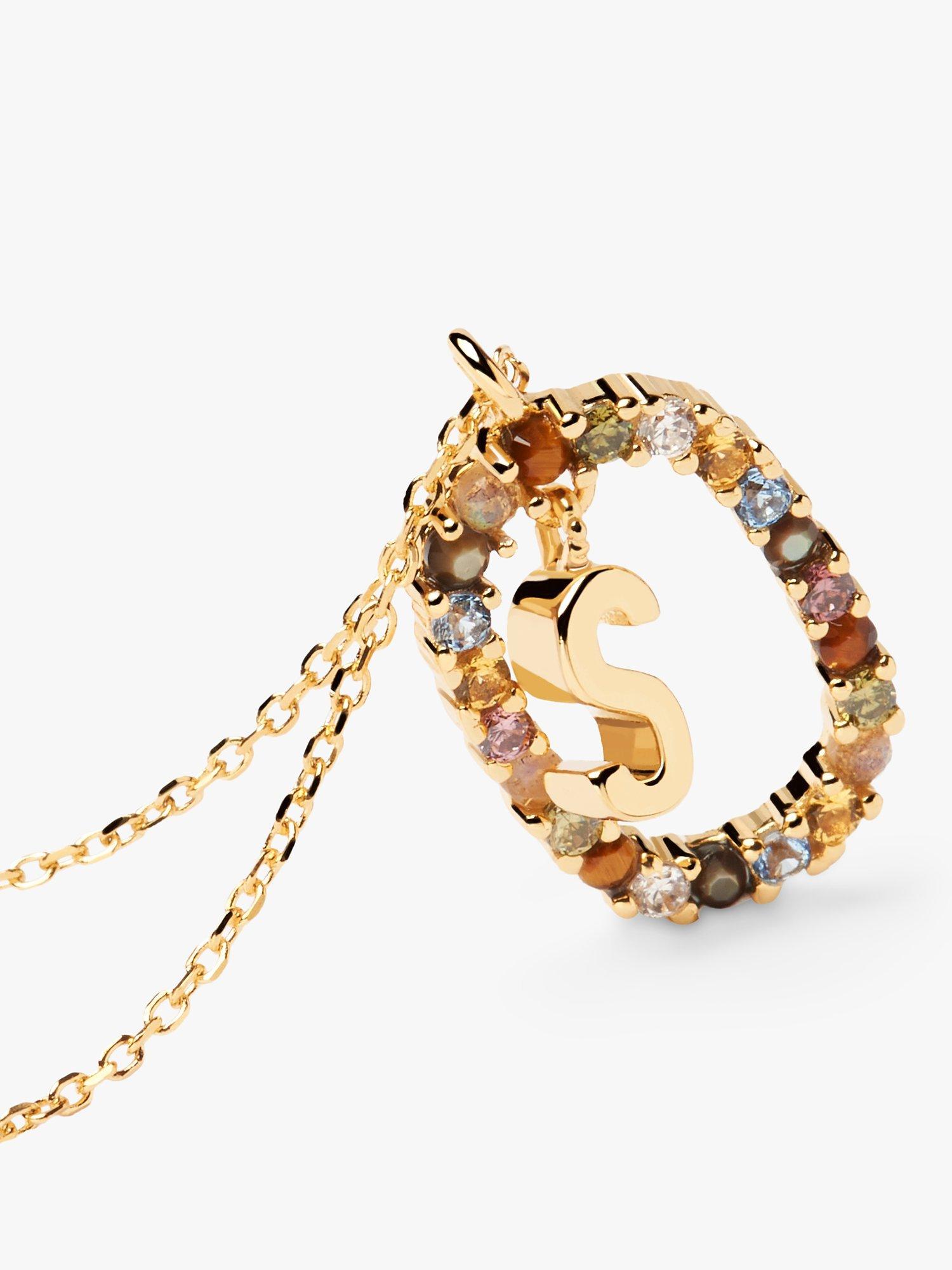 Made from sterling silver and finished with 18ct gold plating, the necklace features your letter of choice encircled with a series of gems that glisten with colour. Gems include Tiger Eye, Labradorite, Mother of Pearl and various other coloured crystals.