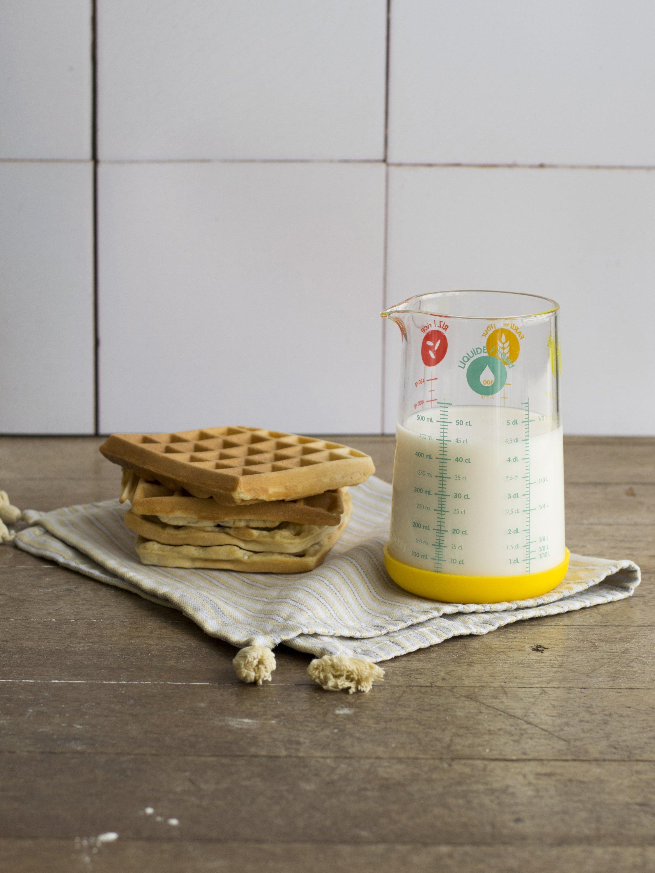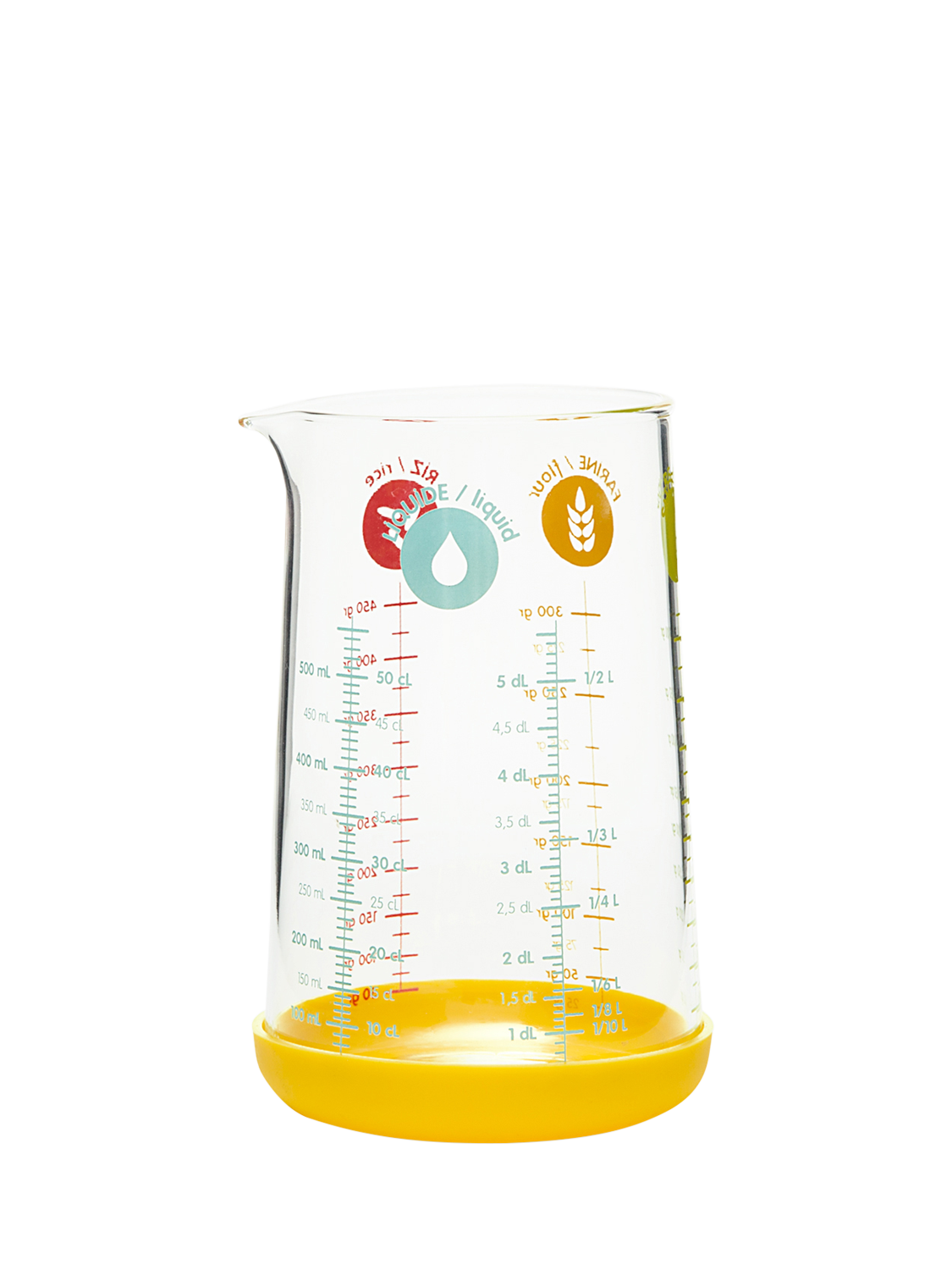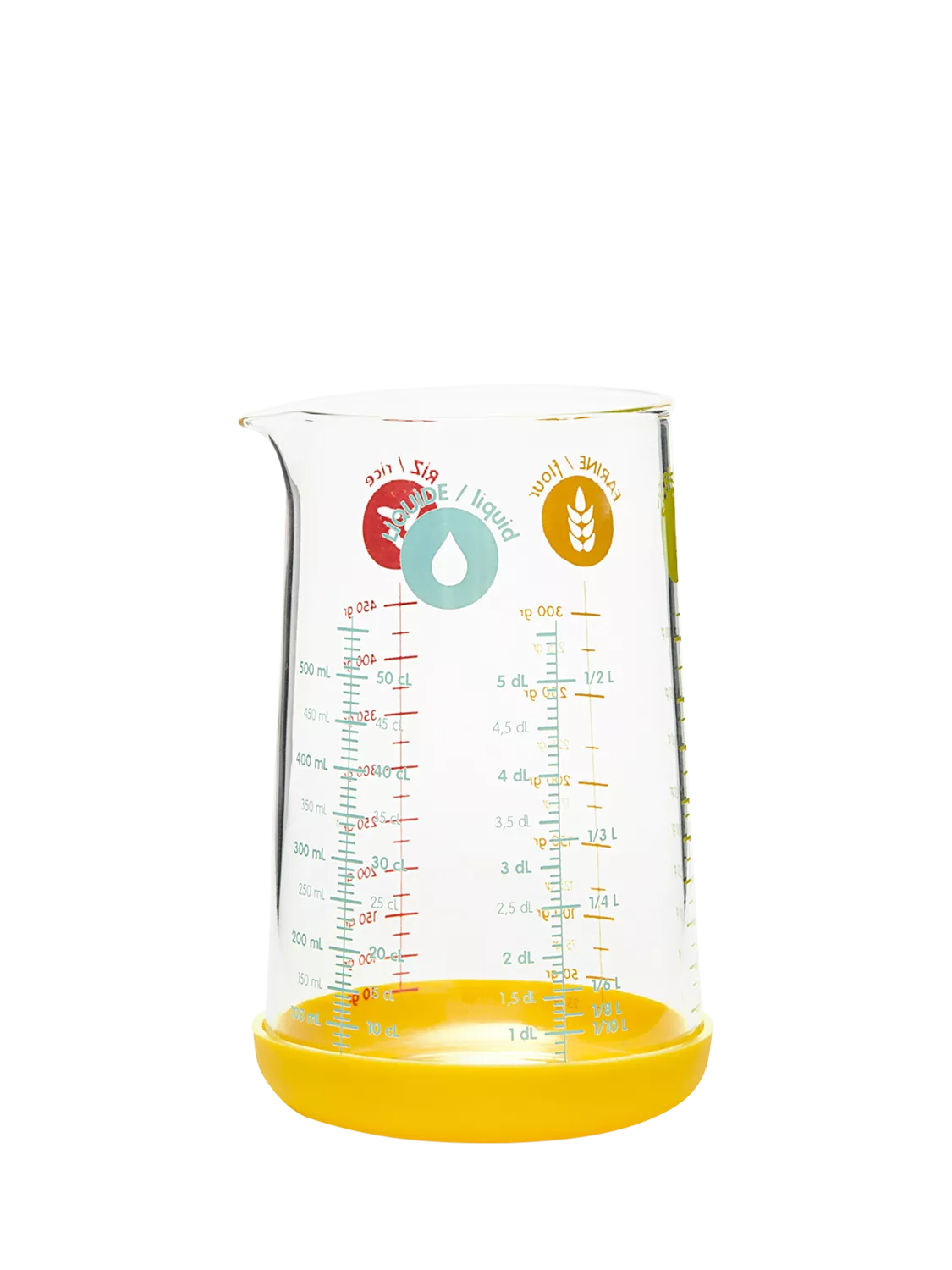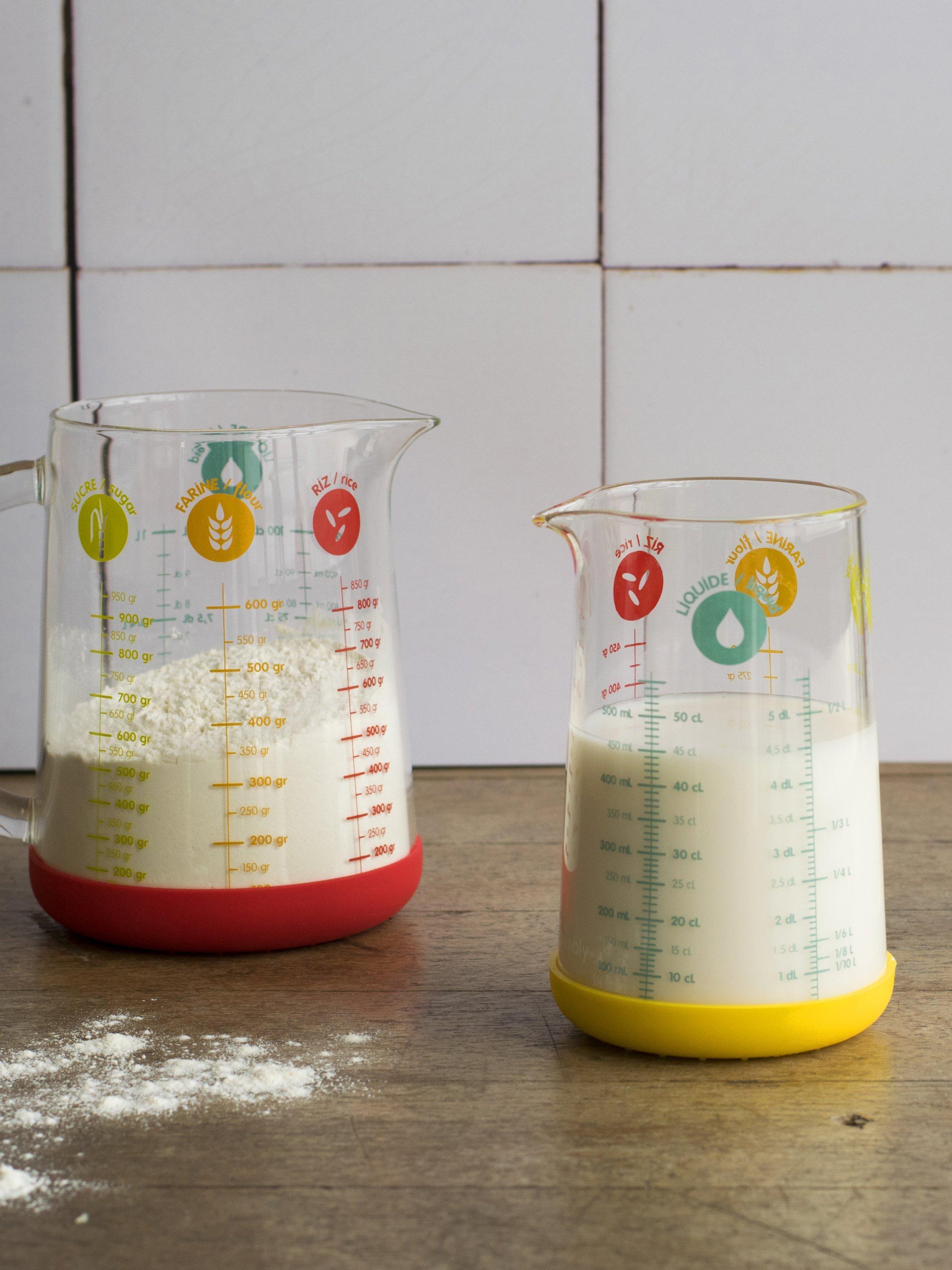 Use it to measure and pour numerous ingredients, whether it be liquids, flour, rice or sugar. Made of heat-resistant borosilicate glass, it's dishwasher and microwave-safe. The colourful silicone base keeps it non-slip.