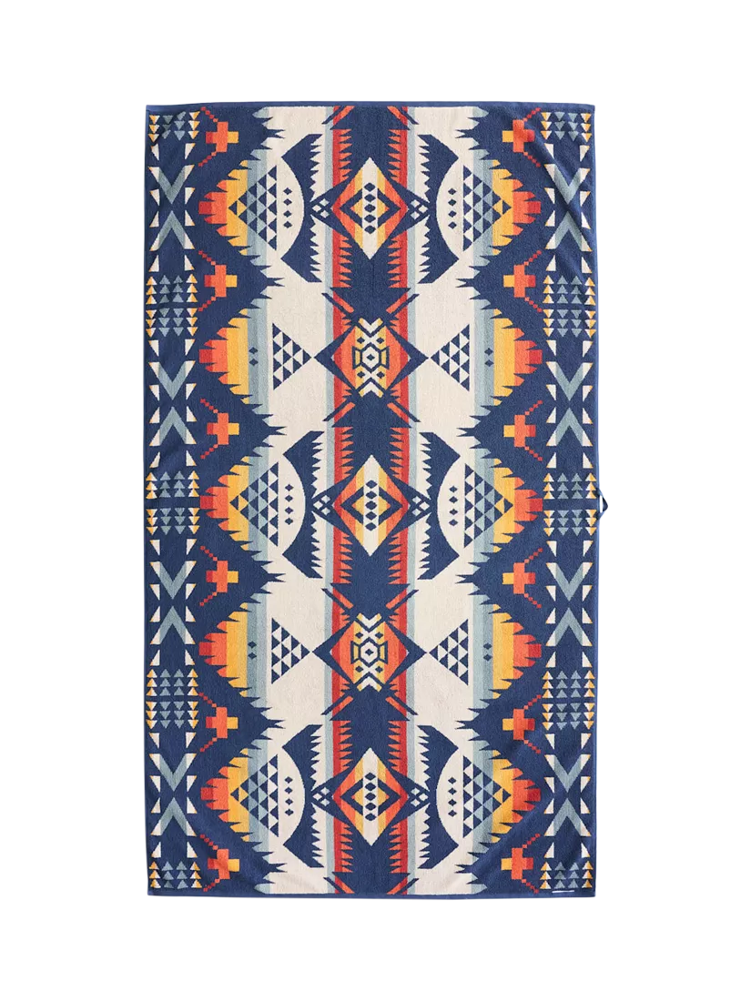 Supersized towel featuring Pendleton's Nehalem, woven of cotton velour in vivid colours that stay true, wash after wash. Sheared on one side for softness, looped on the other for superior absorption. A luxury you'll love for the beach, hot tub or pool.